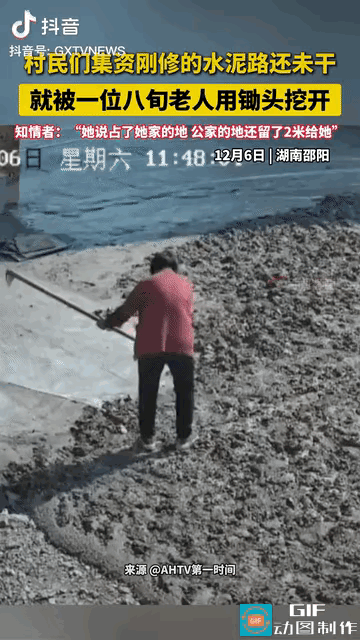湖南邵阳的一个村庄,有一段路没经过修缮都是泥巴路,每次下雨下雪的时候,对村民们的出行都是一大困难,所以有人出面号召大伙集资把这条路修好! 于是大伙有钱的出钱,有力的出力,普通人出50块钱一个人,条件好的挣钱多的出500块钱! 过程非常顺利,大家很快就把这段路修成了水泥路,并用塑料布盖好!大家心里都松了一口气,以后出门终于不用再走那段泥泞的道路了! 还是高兴的太早了!上午刚刚把水泥抹上塑料布盖上!下午就来了一位扛着锄头的老人,不容分说就开始刨!谁劝也没有用! 无奈之下,村干部只能报了警,民警耐心地给老人讲解:这是大家凑钱修的路,不能这样破坏,这是违法的! 可是老人却说村里人欺负她,占用了她家的地!村干部跟民警解释,根本不是她家的地,公家的地都多给了她2米,可她还说占用了她家的地! 民警经过耐心的劝导老人,老人终于答应民警不再刨了!可是民警刚一离开,老人又开始刨,就这样连续报了四次警,水泥地被老人破坏了100多平方米! 太令人上火了,本来去年这条路就应该修的,就是这位老人的阻拦没修成,今年她又这样,警察的话都不听,年纪大了也不应成为不守规矩不讲道理的理由!