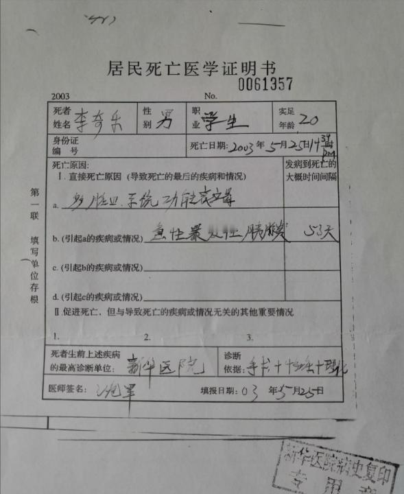2003年,上海一男大学生意外去世,因欠下医药费被医院拒开死亡证明。17年间,遗体在殡仪馆存放共产生费用20余万,而工作员称“缴费后才能火化”。   2020 年 11 月上海殡仪馆,72 岁胡月琴看着儿子遗体进火化炉,这一等,她熬了 17 年。   手里那张皱巴巴的死亡证明,是她用半生奔波换来的 “儿子回家的门票”。   时间回到 2003 年 9 月,20 岁的李奇乐是上海某大学大二学生,专业课常拿奖学金。   那天下午上完高数课,他突然觉得上腹部隐痛,以为是吃坏了肚子没在意。   回到宿舍躺了两小时,疼痛越来越烈,冷汗把衣服都浸湿了,室友赶紧打 120。   救护车把他送到三甲医院急诊,医生按压腹部时,他疼得蜷缩起来。   抽血检查显示,淀粉酶指标超正常值 30 倍,医生说 “是急性胰腺炎,必须立刻进 ICU”。   胡月琴和丈夫李沪三连夜从江苏老家赶过来,看到 ICU 里插满管子的儿子泪如雨下。   医生告知,急性胰腺炎凶险,每天治疗费至少 5000 元,可能要持续一两个月。   老两口没犹豫,回家卖掉县城的房子,取光所有积蓄,凑了 15 万送到医院。   李奇乐在 ICU 里靠呼吸机维持,每天要打进口消炎药,监测脏器功能的仪器没停过。   学校师生得知情况,发起募捐,老师同学你五十我一百,凑了 8 万送到老两口手上。   可 53 天的抢救,总治疗费花了 42 万,家里的钱加捐款,仍欠医院 13 万。   2003 年 11 月中旬,李奇乐心跳突然下降,医生抢救 3 小时后,无奈摇头说 “尽力了”。   胡月琴还没从丧子之痛中缓过来,就去医院行政科开死亡证明。   工作人员却指着欠费单说 “先结清 13 万,不然开不了证明”,没有任何商量余地。   老两口抱着儿子遗体去殡仪馆,可殡仪馆说 “没死亡证明,只能暂存,不能火化”。   暂存费每天 35 元,他们先交了一个月的钱,想着尽快凑钱要证明。   李沪三白天在工地打零工,晚上去夜市摆地摊,每天只睡 4 小时,想多赚点钱。   可 13 万对赤贫的他们来说是天文数字,亲戚朋友借遍了,也只凑到 2 万。   2008 年夏天,李沪三在工地搬砖时突然晕倒,送医后查出胃癌晚期。   他躺在病床上,拉着胡月琴的手说 “一定要让儿子火化,带他回家”,不到半年就走了。   丈夫的离世让胡月琴几乎崩溃,但想到丈夫的遗言,她又咬牙撑了下来。   之后的日子,胡月琴一边打零工还零碎债务,一边跑医院、信访局维权。   每次去医院,都被 “按规定办事” 挡回来;去信访局,也只得到 “会协调” 的口头答复。   她曾独自把医院告上法庭,可法院判医院胜诉,说 “医疗欠费确实该还”。   2019 年,社区工作人员得知她的遭遇,帮她联系了法律援助律师。   律师听完整件事,说 “死亡证明是行政文书,医院不能和欠费捆绑,这是侵权”。   律师帮她整理证据,提起反诉,要求医院开具证明并承担暂存费。   案件曝光后,很多网友同情她的遭遇,有人发起捐款,短短几天凑了 20 多万。   胡月琴却把所有捐款都退了回去,说 “我要的不是钱,是个理,医院得认自己错了”。   她的倔强让更多人关注这件事,媒体也报道了这个跨越 17 年的悲剧。   2020 年 7 月,法院最终判决:医院拒开死亡证明违法,承担 17 年暂存费 22 万,赔偿胡月琴精神损失 5 万。   医院很快执行了判决,把死亡证明送到胡月琴手上,那张纸她看了又看,哭了很久。   2020 年 11 月 14 日,她带着丈夫的遗像,陪儿子走完最后一程,遗体终于火化。   如今的胡月琴,住在江苏老家的老房子里,房子不大却收拾得干干净净。   客厅柜子上,摆着李奇乐的大学毕业证和李沪三的遗像,旁边总放着新鲜菊花。   她每个月都会去墓地,给儿子和丈夫扫扫墓,跟他们说说家里的小事。   社区偶尔会来慰问她,她总笑着说 “没事,儿子和老伴都‘回家’了,我挺好的”。   她还留着李奇乐的笔记本,没事就翻一翻,仿佛儿子还在身边,从未走远。     信息来源:中国新闻周刊-大学生病逝17年未能安葬,家属称医院拒开死亡证明