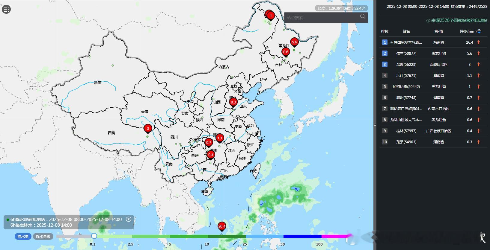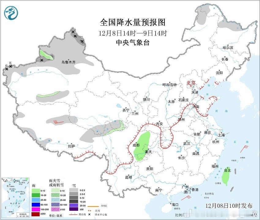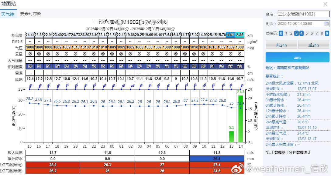 【降水】今天白天,我国绝大多数地区依然是晴天,降水稀少。08-14时最强的降水站点为海南三沙的永暑礁。因为受到热带扰动外侧环流影响,13-14时单小时雨量超20毫米,出现了短时强降雨。今天下午到明天中午,新疆北部的降雪会发展增多。