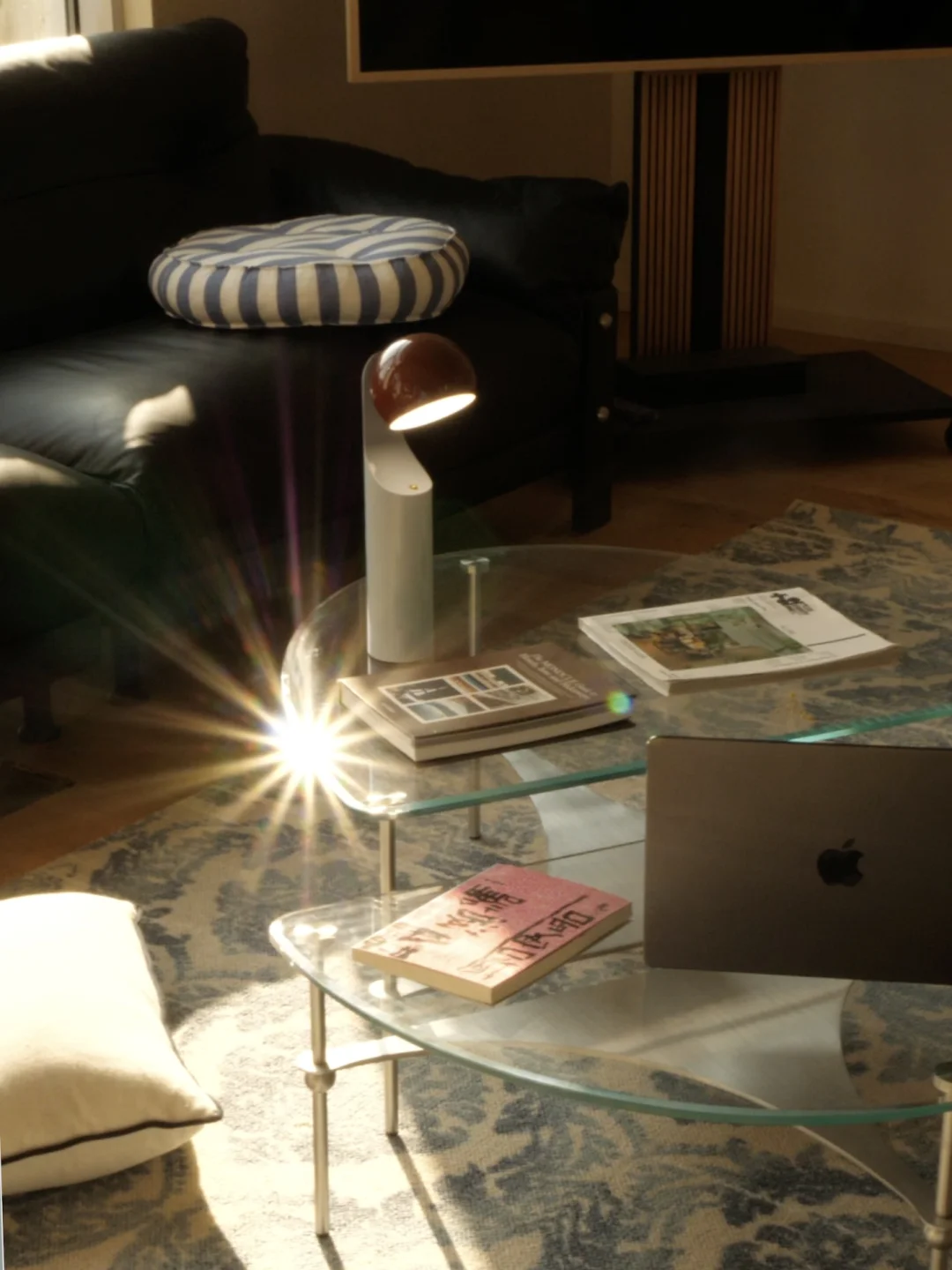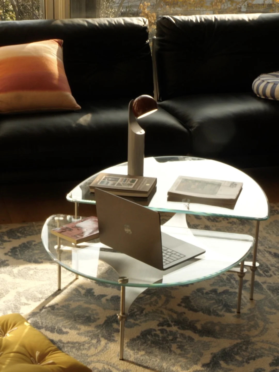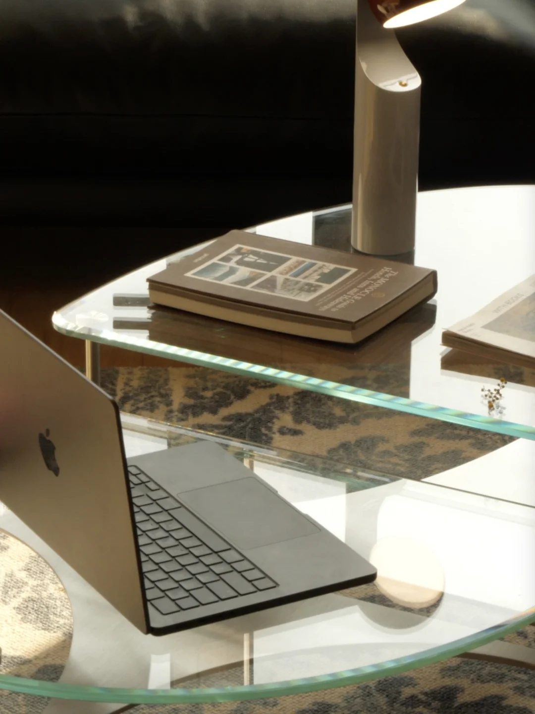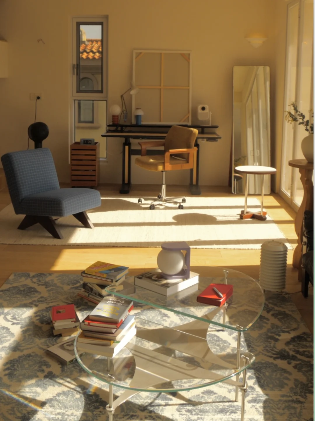 通透的异形钢化玻璃,被纤细的不锈钢银翼支架优雅托起,视觉上清澈空灵。它像一个光的容器——阳光能肆意穿透,在桌面、在书页、在地面,变幻出不同层次的光影。上面摆放台灯、书籍和电脑,就是第二个办公空间。