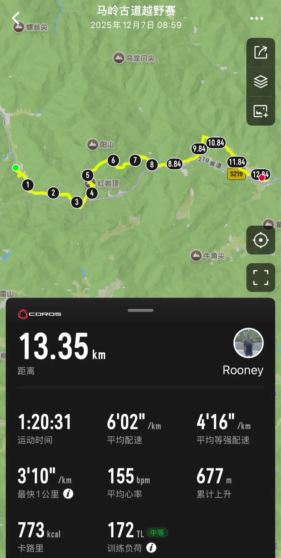 说是10km组,实际13km,爬升670m,虐到腿软,爽到上头 山野从不会辜负认真奔跑的人,每一次爬坡都是勋章,每一次下坡都是自由 跑越野,玩的就是心跳,拼的就是韧性,赛前没想过名次,就是想着过来交叉训练一下的,整体跑下来体验不错,虽然爬升不小,但95%的路段都可以小跑起来。赛后的浦江美食也不错,有牛轻汤,还有土猪肉包子,一不小心吃多了。 路跑多了,偶尔跑个越野放松一下,用一场酣畅淋漓的越野跑开启下周的正式冬训🌲