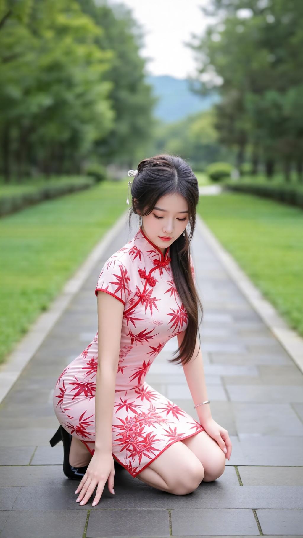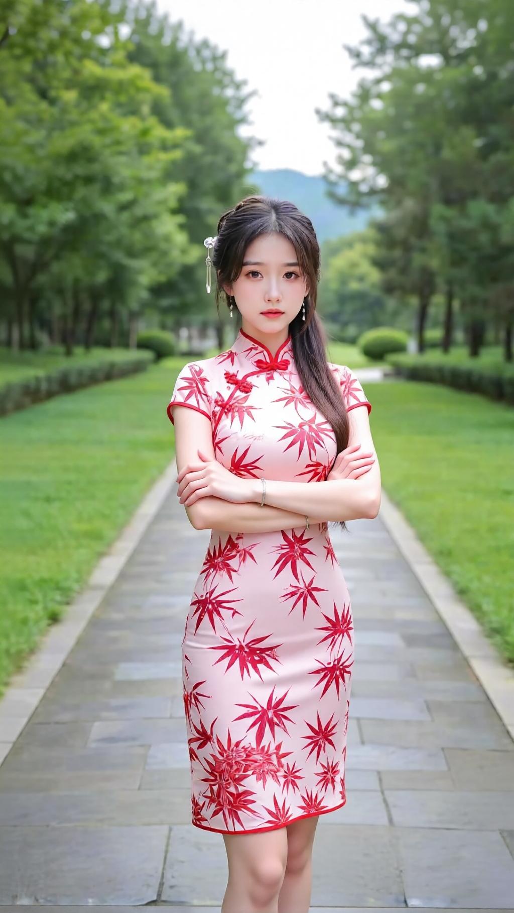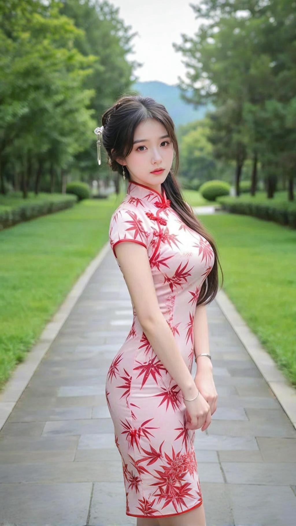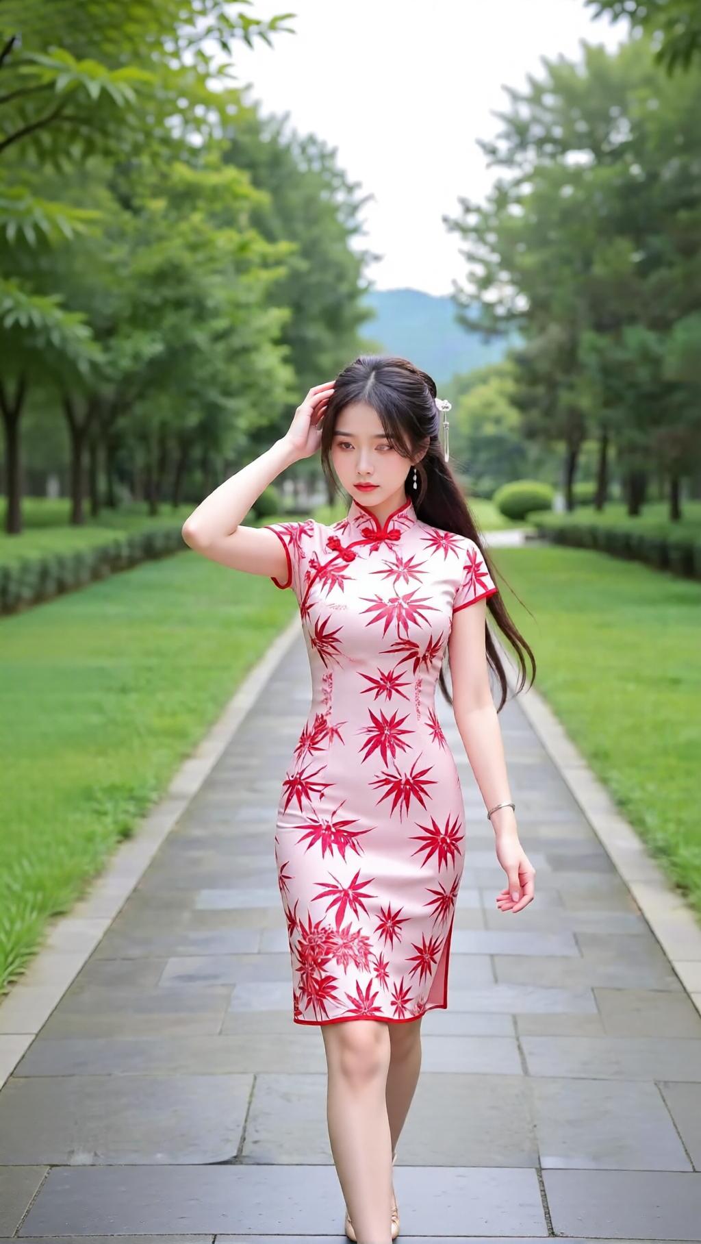 在绿意盎然的公园里,穿着红白相间旗袍的少女,宛如一幅动人的画卷。