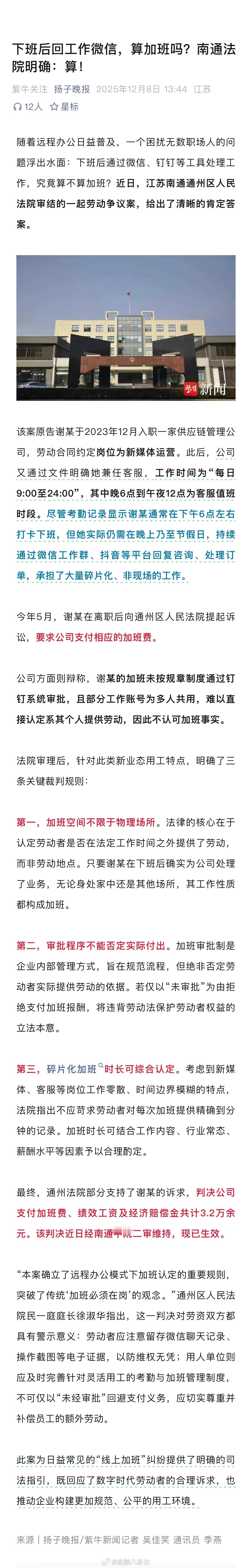 下班后回工作微信,算加班吗?南通法院明确:算!
