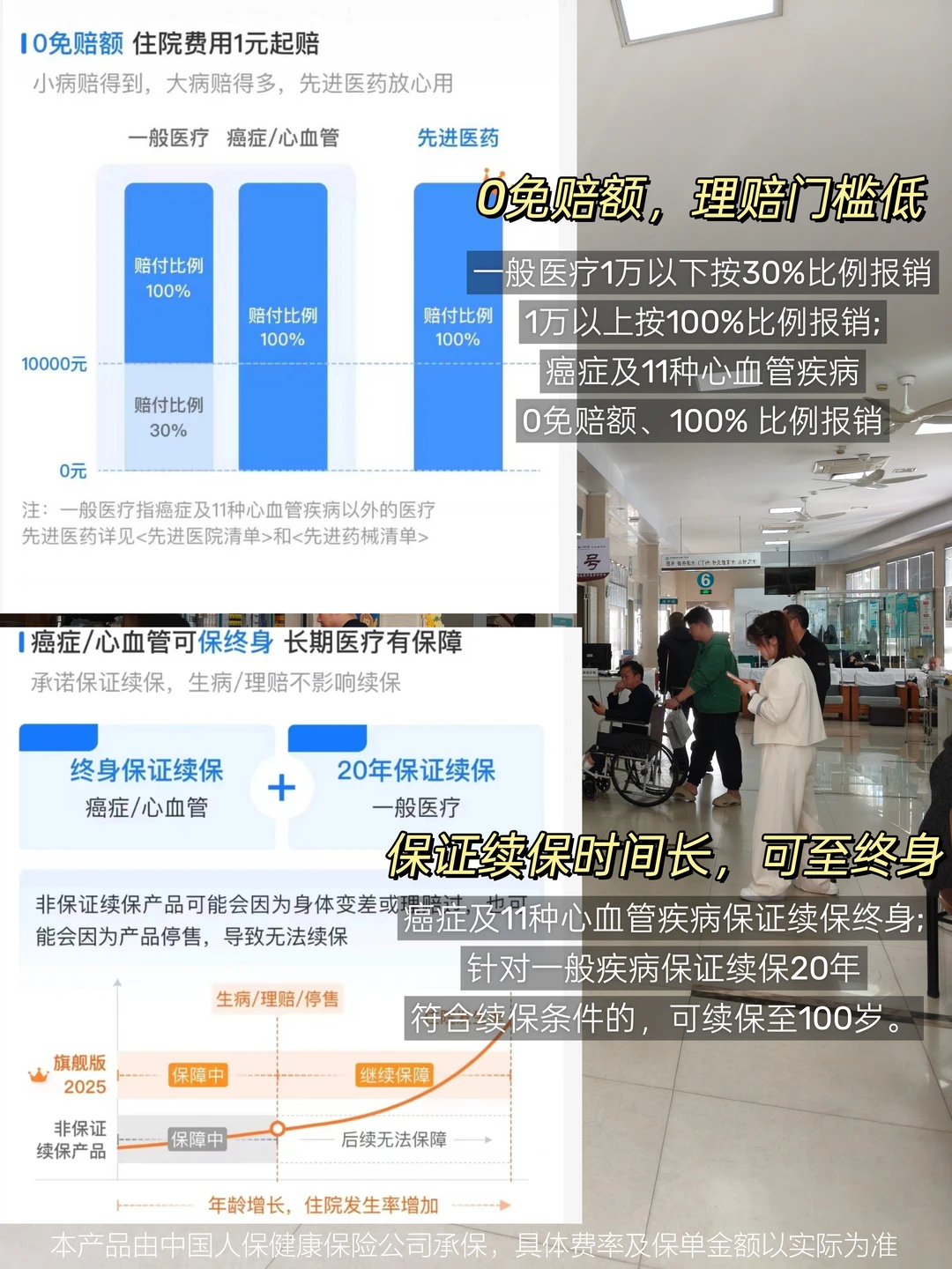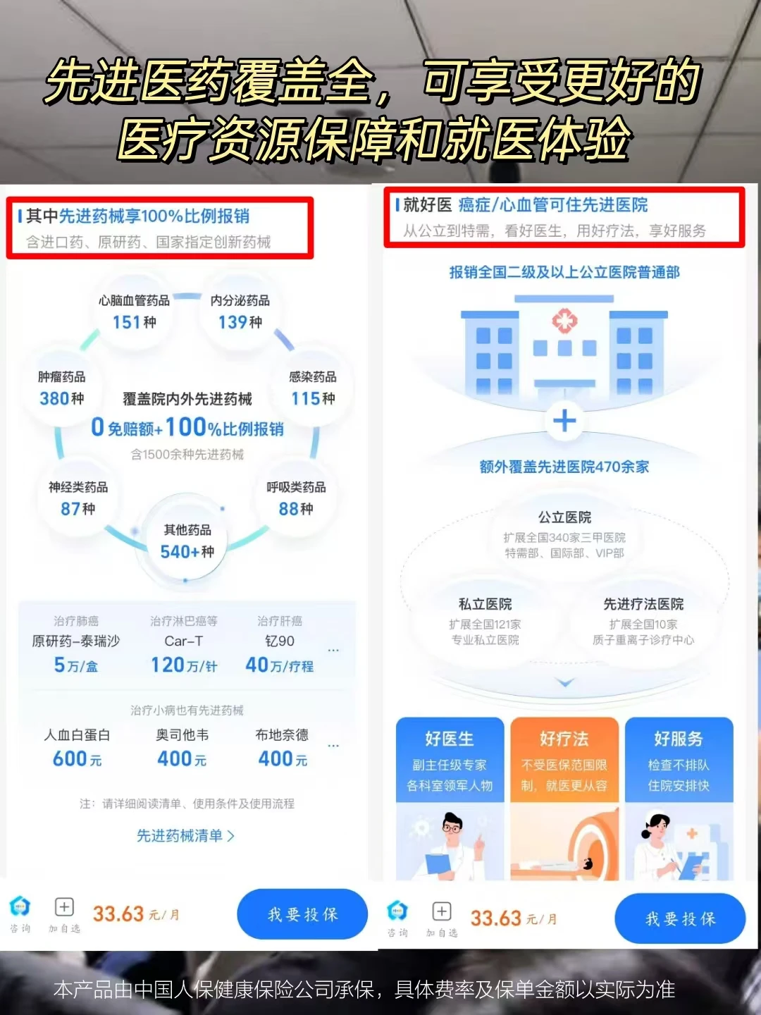 ✅ 医药保障升级:保障范围广,不仅能报院内药,还增加了院外药的种类和数量,先进医药全覆盖,进口药、原研药都能报,100%比例报销先进药械费用,不用愁 “药贵” 。针对癌症及11种心血管疾病,保障范围扩展至先进医院,包含全国范围内三甲医院的特需部/国际部/VIP部/干部病房/贵宾/外宾、10家质子重离子医院、120余家专业私立医院。