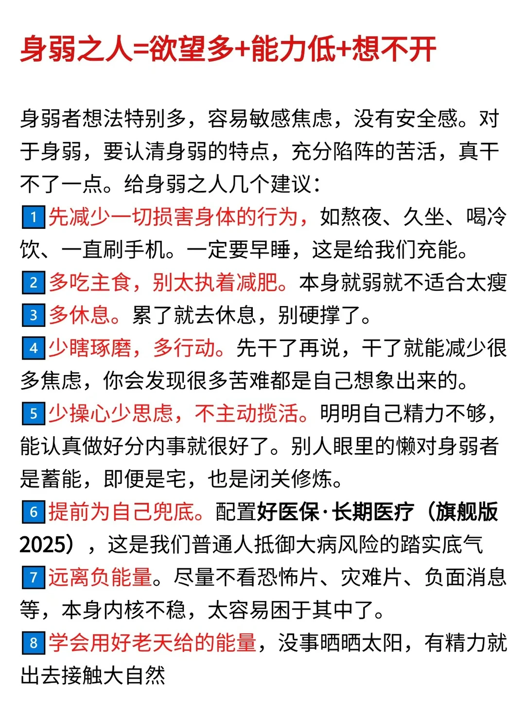 明明想做的事情特别多,但我们光是应付眼下的工作和生活,就已经筋疲力尽。一天什么都没做,就是累,被人误解懒不上进。不同于身强,对身弱来说,在追求事业上的成功时,更需要注重身体的状态,要顺着自己的心和身体做事,别紧绷,放轻松,不要跟自身的状态做对抗。