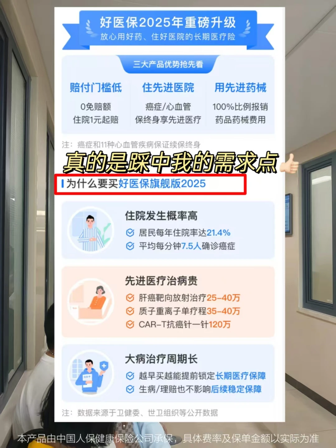 身弱者有个明显特点,多病,所以我老是抑制不住担心自己会生大病,然后被大病掏空积蓄😢,像癌症等大病,简直就是无底洞,真的害怕有一天会因此掏空家人的积蓄!在对比了好多保险后,选了好医保·长期医疗(旗舰版2025),真的踩中我需求点!