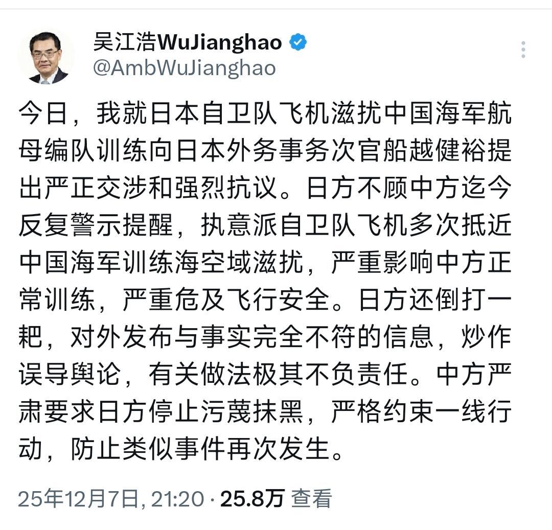 日本这波操作,真是让人大开眼界!飞机开到别人家演习区门口碰瓷,被抓包了还反咬一口。这到底是演的哪一出?是真瞎还是装傻,全世界可都看着呢。 这事儿得从几天前说起。2025年12月上旬,中国海军的辽宁舰航母编队正在宫古海峡以东的公海进行远海训练。 这片海域是公海,不是谁家的后花园。而且,中方早就通过国际公开渠道发布了演训通报,清清楚楚划定了演习区域。 按理说,这就是一次再正常不过的例行训练,符合国际法,也符合国际惯例,大家各走各的路,互不干扰。 可偏偏有人不这么想。日本自卫队的飞机就像闻着腥味的猫,非要凑过来。它们多次抵近,甚至直接冲闯中方划设的演训禁区。 这种行为有多危险?高速飞行的军机在狭小空域内“擦肩而过”,稍有不慎就是机毁人亡的惨剧。 这不仅是严重的挑衅,更是对飞行员生命安全的极端漠视。 中方飞行员为了维护安全,采取了必要的驱离措施,这完全是合理合法的。 可接下来日本的反应,才真是让人见识了什么叫“戏精附体”。 日方不仅不反思自己的危险行径,反而恶人先告状,火速召开发布会,反向炒作所谓的“中国军机对日机实施雷达照射”。 这操作熟悉不?自己犯了错,反手就给你扣个帽子。 日本防卫省借此大肆渲染紧张局势,防卫大臣小泉进次郎也跟着添油加醋,诬蔑中方操作“极不专业”。 他们妄图通过这种“贼喊捉贼”的把戏,把自己包装成一个“受害者”,在国际上误导舆论,抹黑中国的形象。 中方当然不会惯着这毛病。驻日大使吴江浩在12月7日直接向日本外务事务次官船越健裕提出严正交涉,直斥日方“倒打一耙”。 国防部发言人张晓刚更是毫不客气地指出,日方的言论纯属颠倒黑白,其自身行径才是名副其实的“海空危险行为”,并警告其不要“重走军国主义邪路”。 外交部当晚更是在北京和东京两地同时提出反交涉,直接把日方所谓的“抗议”给驳了回去。 这态度很明确:想玩颠倒黑白、嫁祸于人的把戏,门都没有。 你以为这就完了?这才哪到哪。就在几天前的12月2日,钓鱼岛那边也不太平。 一艘名为“瑞宝丸”的日本渔船,非法闯入中国钓鱼岛12海里领海。 中国海警舰艇依法对其进行管控,通过广播警告、近距离跟踪等方式,最终成功将其驱离。 整个过程有理有据,专业规范。 值得注意的是,中国海警不仅在钓鱼岛海域实现了连续14天的巡航,还首次动用了直升机进行空中巡逻,形成了“海空一体”的立体管控模式。 这说明什么?说明我们维护主权的手段更多了,决心也更坚定了。 可笑的是,日本海岸警卫队事后居然声称“驱离了两艘中国船只”,这睁眼说瞎话的本事,真是让人佩服。 从航母演习区的军事滋扰,到钓鱼岛海域的执法冲突,日本这一系列连贯的挑衅动作,背后藏着什么小算盘? 台湾世新大学的游梓翔教授一语道破天机:日方反复炒作这些议题,不过是为其扩军备战争找借口罢了。 说白了,就是演戏给国内和美国看,好名正言顺地增加军费、部署导弹。 日本首相高市早苗前脚刚在11月叫嚣“可能就台海问题动用自卫队”,后脚这些摩擦就来了。 这剧本,是不是有点太明显了? 更有意思的是,美国人也来凑了个热闹。 11月,美军驱逐舰就以“航行自由”为名,在钓鱼岛附近海域刷了一波存在感,企图为日本撑腰打气。 结果呢?中方根本不吃这一套,该巡航的巡航,该训练的训练。 美国的威慑,基本上等于演给空气看。 日本这副“我坏我有理”的嘴脸,与街头耍无赖的泼皮何异?然而,政治上的强硬表演,却掩盖不了经济上的心虚。 由于中日关系持续紧张,日本经济界已经叫苦不迭。仅仅是旅游业,退票量就高达54万张。 日本经团联等经济团体更是急着请求访华,希望能缓和局势。 一边在政治上疯狂挑衅,一边又眼巴巴盼着经济上能缓和关系。这种精神分裂式的操作,真是让人看不懂。