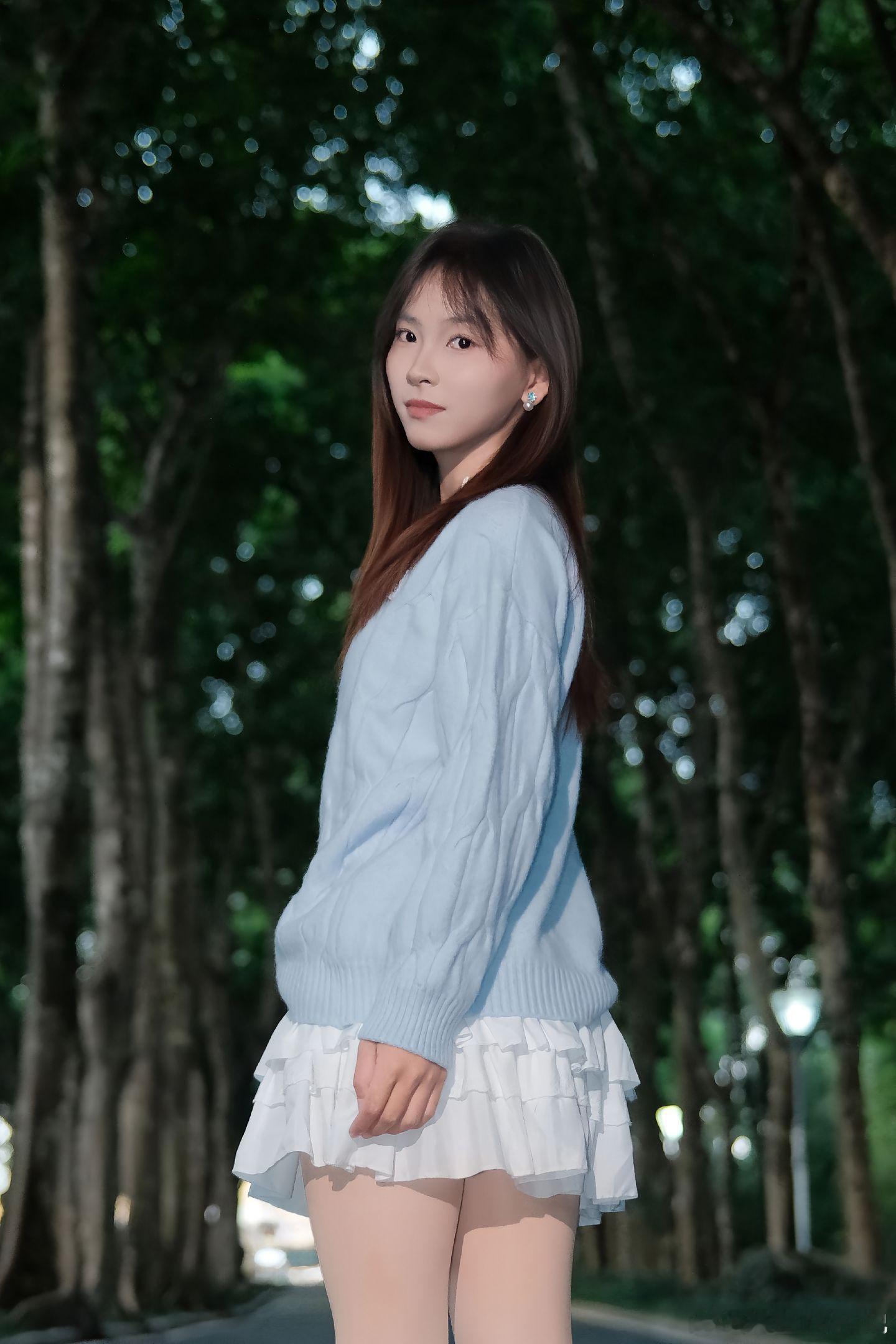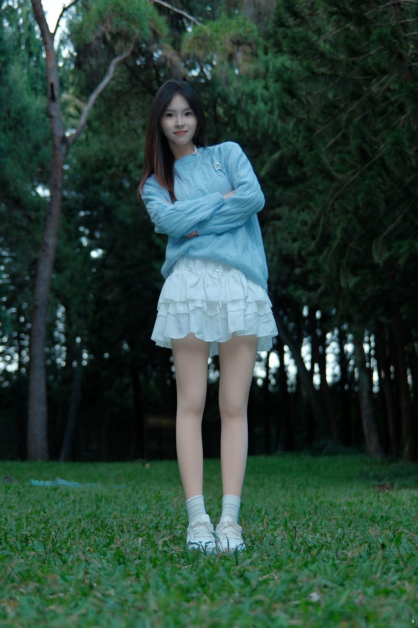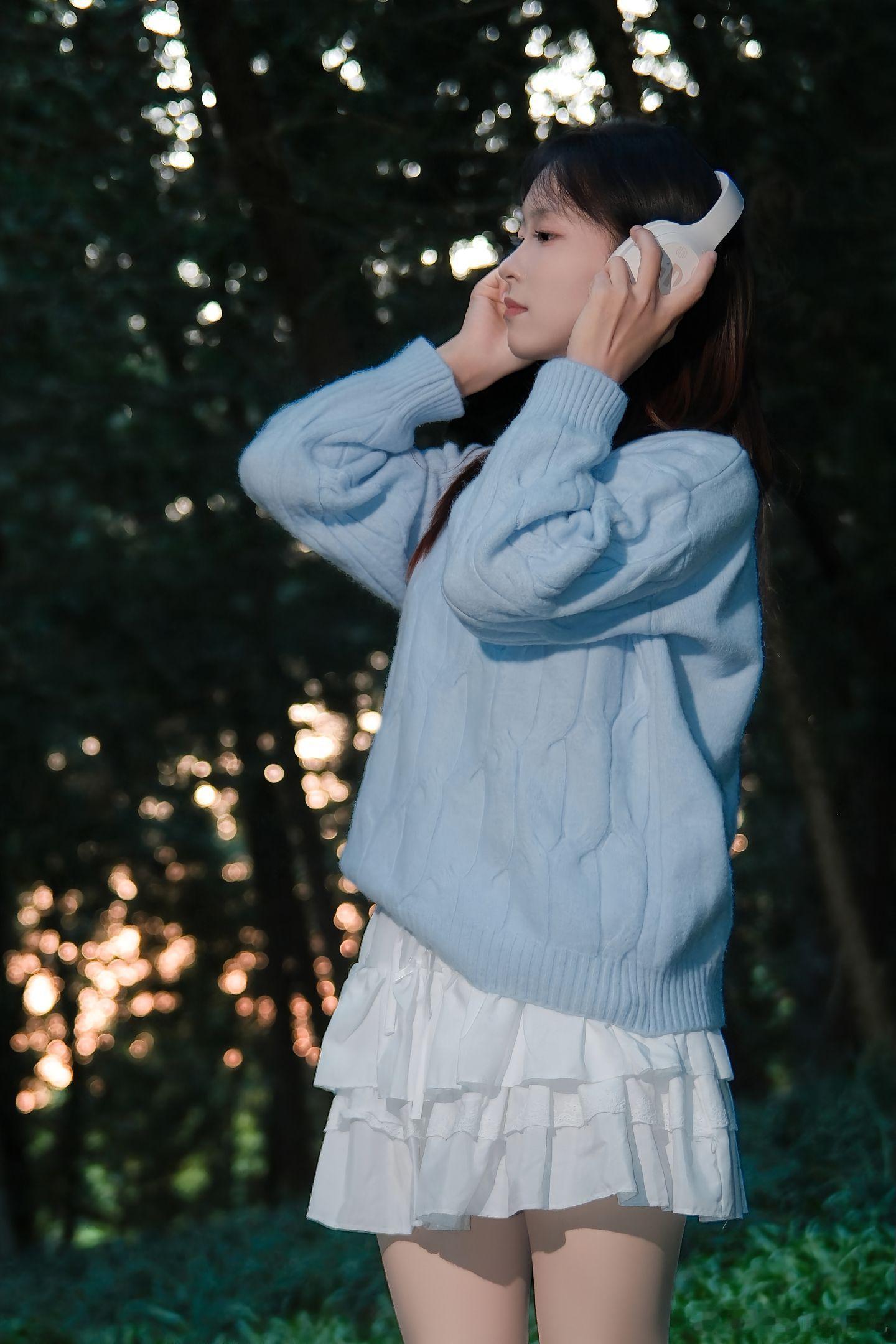 穿衣搭配 蓝色毛衣,白色裙,格子围巾,光腿神器,标准美少女美女绘梦长廊