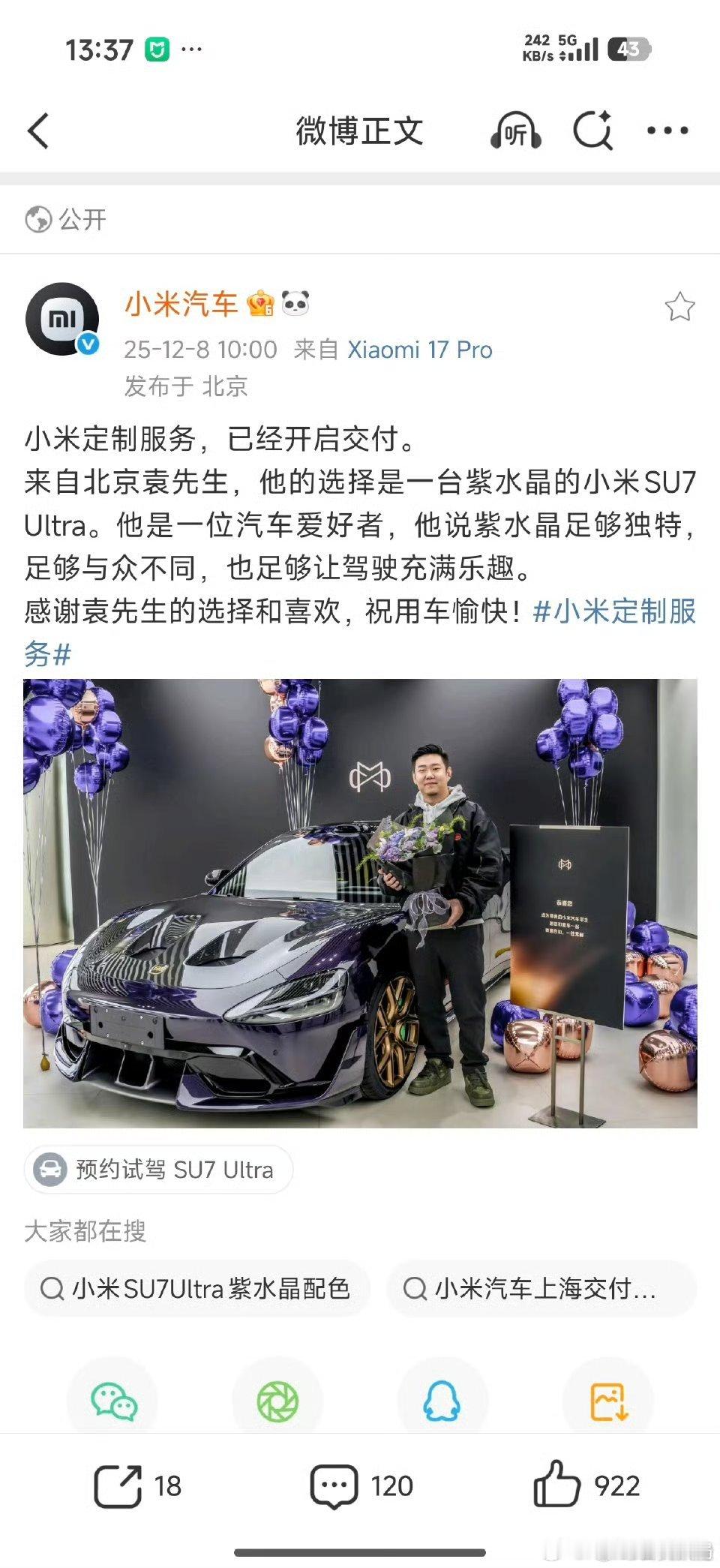 小米汽车定制服务开启交付首台紫水晶涂装SU7 Ultra的交付,让小米把超豪华车专属的定制体验带进了主流高端市场。50小时手工打磨的车漆、26项个性化配置,从车漆到内饰的细节定制,尽显匠心与诚意。 这不仅是小米高端化的关键一步,更打破了“定制=天价”的行业惯例,让普通消费者也能拥有专属座驾。虽有限量产能和交付周期的挑战,但这种兼顾个性与品质的尝试,恰恰击中了当下用户拒绝同质化的需求。期待小米能平衡好匠心与效率,让更多人感受到“科技平权”带来的高端体验。