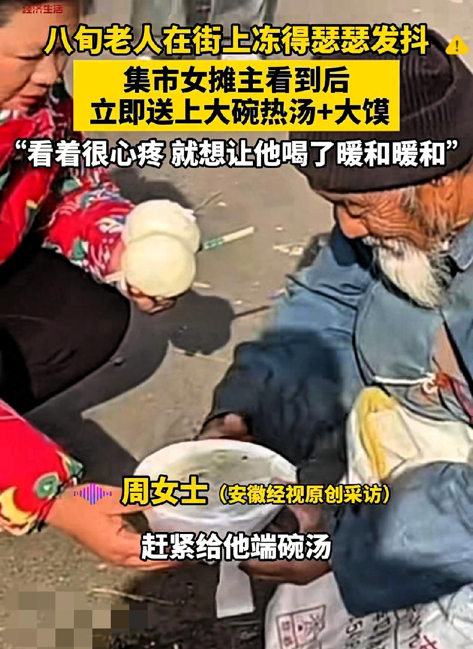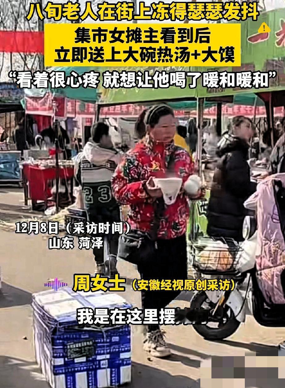 这碗热汤,才是冬天最该有的“温度”! 菏泽集市上,八旬老人冻得缩成一团,女摊主周女士看一眼就坐不住了—— 转身端来热汤、递上大馍,蹲下来的那一刻,比任何刻意的“善举”都动人。 现在总有人说“善意要讲成本”,可周女士就凭一句“看着心疼”,把自己的热乎饭分给了素不相识的老人。 她没拍视频博关注,没喊着“快来看我做好事”,就是本能地想让老人暖一点。 这种“不表演的善良”才最戳人啊——不是为了被夸,只是见不得别人难。 我们总说“暖冬”,其实暖的从来不是天气,是有人愿意把自己的温度分你一半。 你遇到过这种“没声张”的善意吗? 来聊聊那些让你突然觉得“这世界真好”的瞬间~