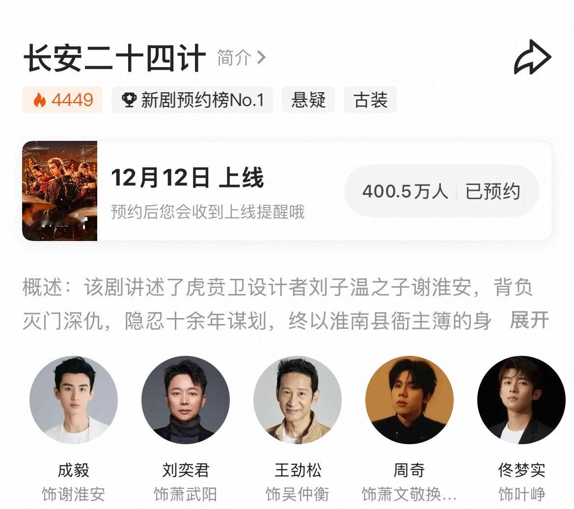 长安二十四计优酷预约量已破400万!站内热度4400多了,现在可以加油做热度了!