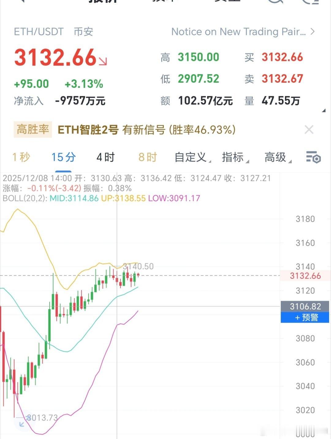 区块链 ETH白天稳定3100上方运行,多头久居不下,那么小幅回落顺势看涨即可底部参考3105-3080位置看涨,现在3200位置即可