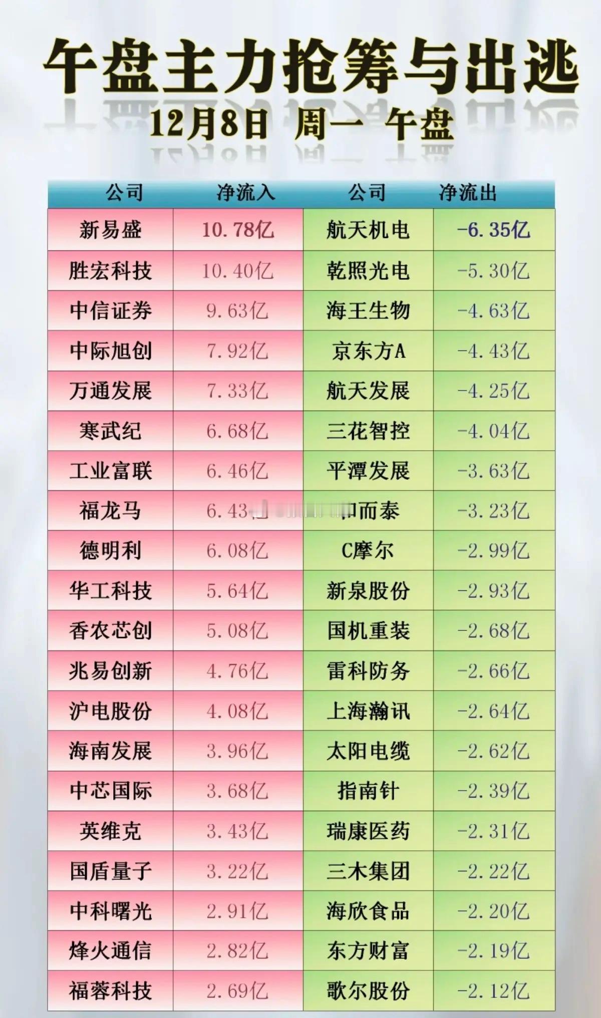 上午盘主力资金 抢筹出逃 个股榜!暗盘资金流入,存储芯片,消费电子,半导体芯片,麒麟电池,5G,量子科技,空间站,,能源金属等。煤炭天然气,食品饮料,军工,光学光电子,公用事业,化肥,化学原料,电力行业等回调。