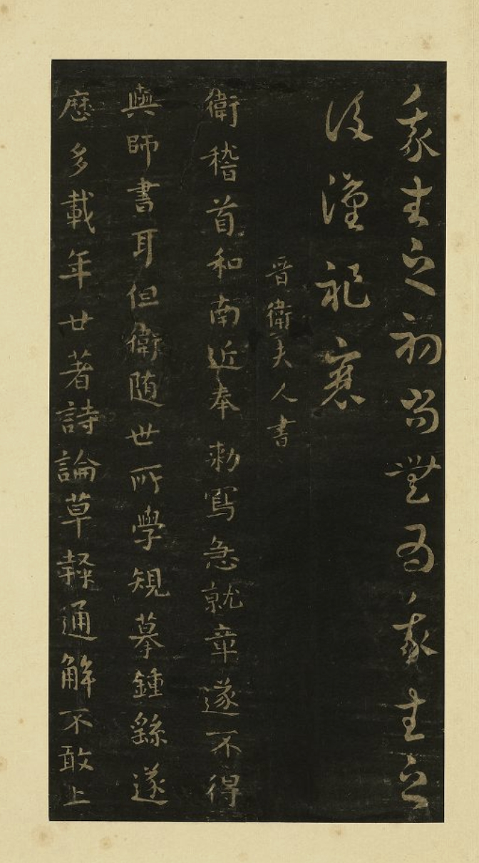 (西晋《四体书势》作者)卫恒的小儿子就是太子洗马卫玠。卫恒的堂妹是卫铄(卫夫人)。 卫夫人《稽首和南帖》:“衛稽首和南。近奉勅寫急就章,遂不得與師書耳。但衛隨世所學,規摹鍾繇,遂歷多載,年廿著詩論,草隸通解,不敢上呈。衛有一弟子王逸少,甚能學衛真書(楷书),咄咄逼人,筆勢洞精,字體遒媚。師可詣晉尚書館書耳。仰憑至鑒,大不可言。弟子李氏衛和南。” “卫夫人名鑠,字茂漪,即廷尉展之从妹,汝阴太守李矩之妻,中书郎李充之母。”此《南窗纪谈》所载也。初疑卫是封号,然法帖中有卫夫人一帖,称“卫稽首”,其末云“李氏卫和南”,卫又似是其名。及读(北宋黄伯思)《东观余论》,乃云:“帖中卫夫人既与师书,自当著名,不应称夫姓及姓也。”然后知卫乃是其姓,而李者其夫姓耳,是时书之体格盖如此。——(南宋)袁文《甕牖闲评》卷三