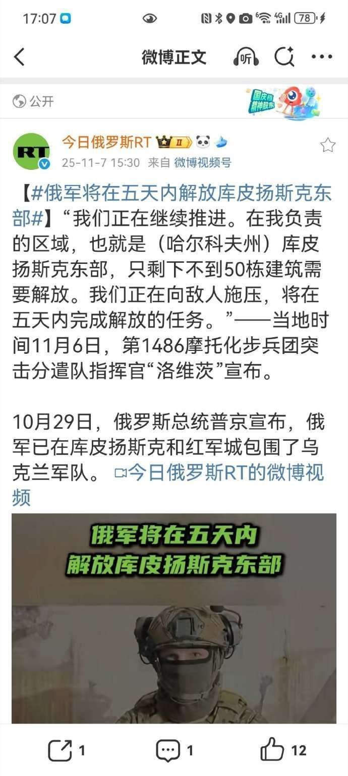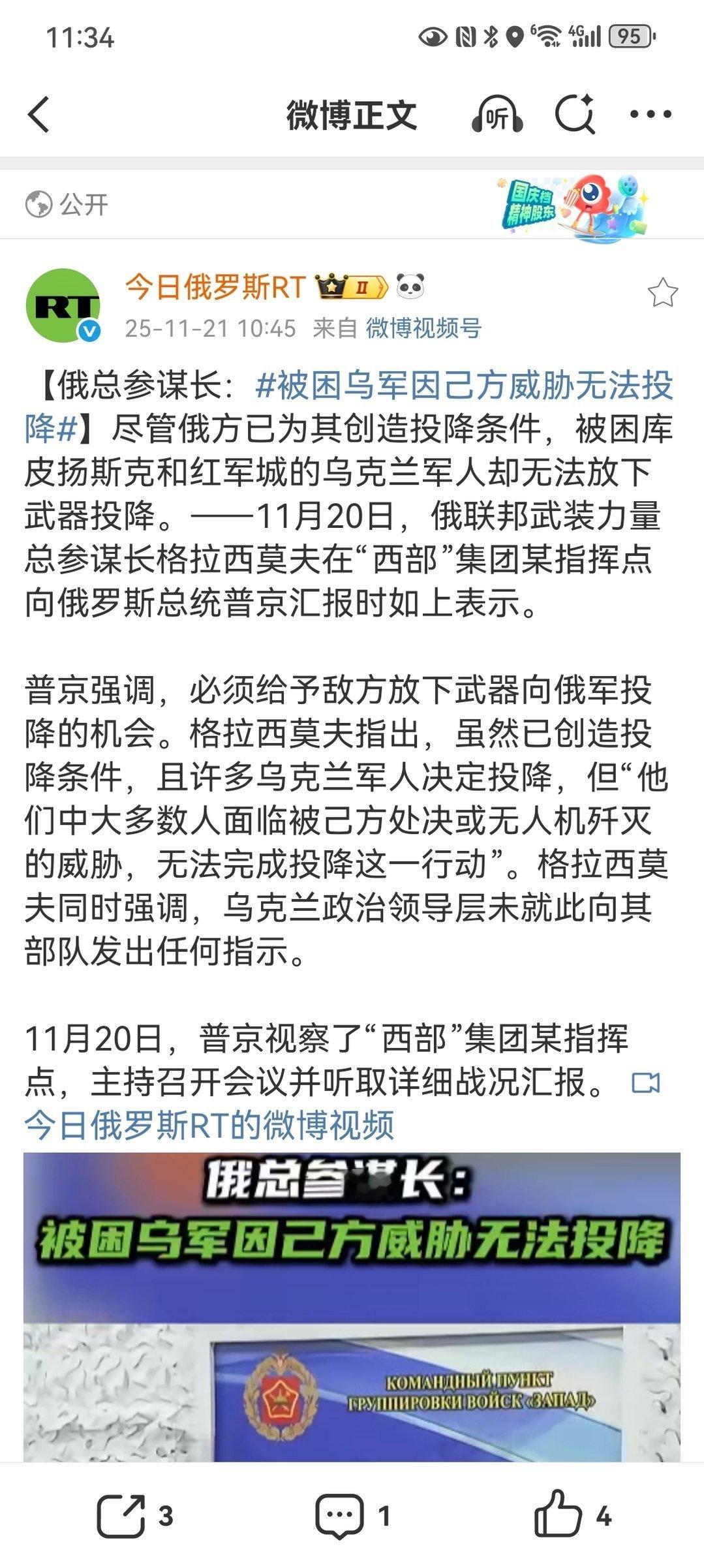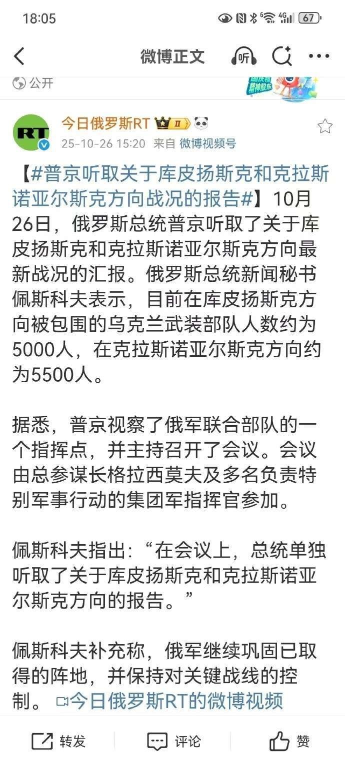 来自俄罗斯的假消息 【俄总参谋长:被困乌军因己方威胁无法投降 】俄罗斯人民给了普京25年,普京却听不到真话了。特别有意思的是,普京竟然还那么人道,招呼俄军“必须给予敌方放下武器向俄军投降的机会”。俄方此番表态意在塑造"人道形象",却难掩战场宣传本质。烽火问鼎计划可互联网是有记忆的。去年11月8日,普京公开宣称“俄罗斯军队在库皮扬斯克方向包围两个基地,在其中的一个地方包围了1万名乌克兰武装部队的军人”。上月26日,俄军总参谋长格拉西莫夫向普京汇报时表示,库皮扬斯克地区的乌军5000人遭遇包围,顿涅茨克州红军城(乌克兰称波克罗夫斯克市)方向有31个营的乌军共5500人亦陷入包围。本月6日,你们声称“俄军将在五天内解放库皮扬斯克东部”。有一个消息是真的吗?(该帖写于11月21日,事实已经证明了我的判断)俄罗斯侵略乌克兰战争