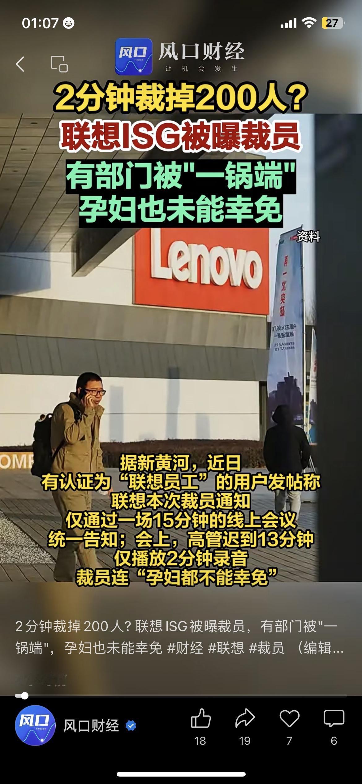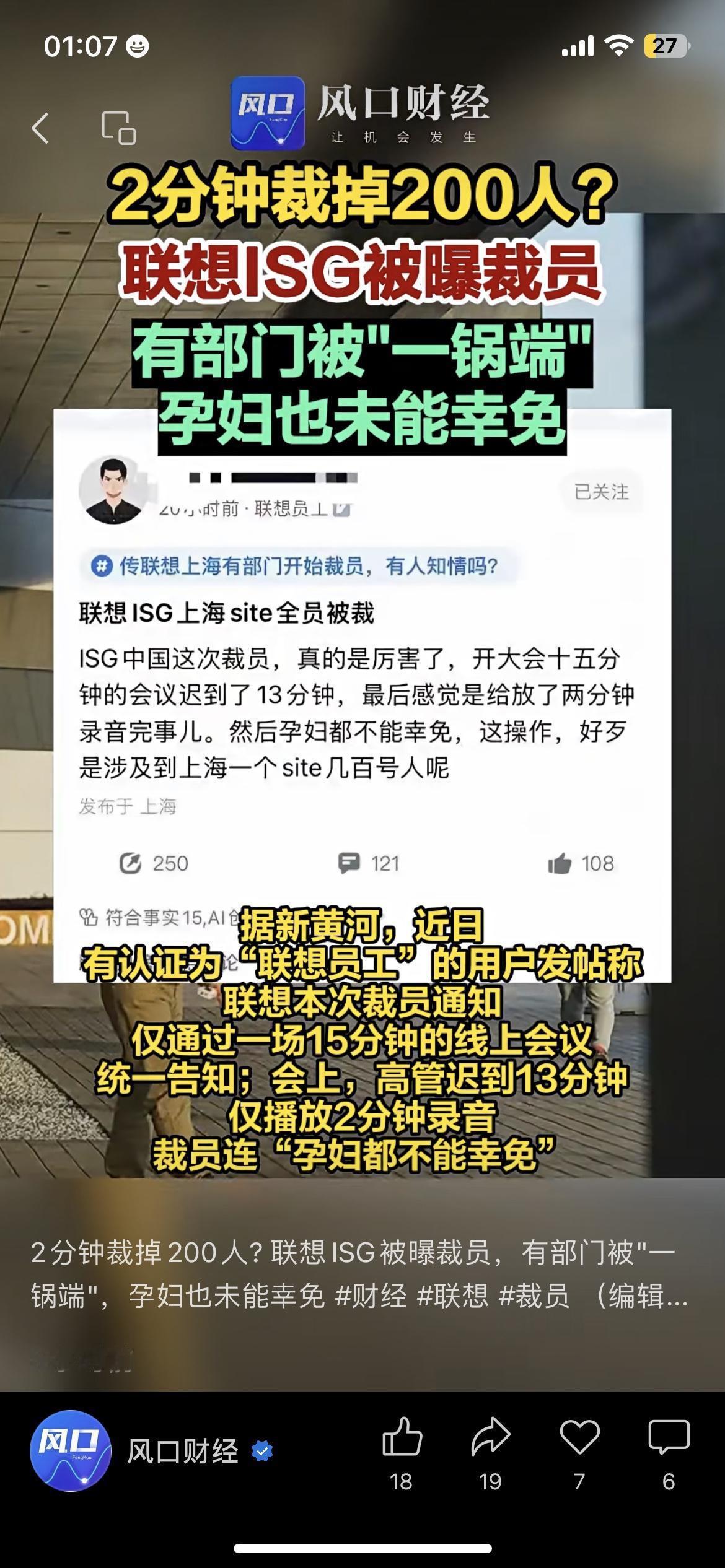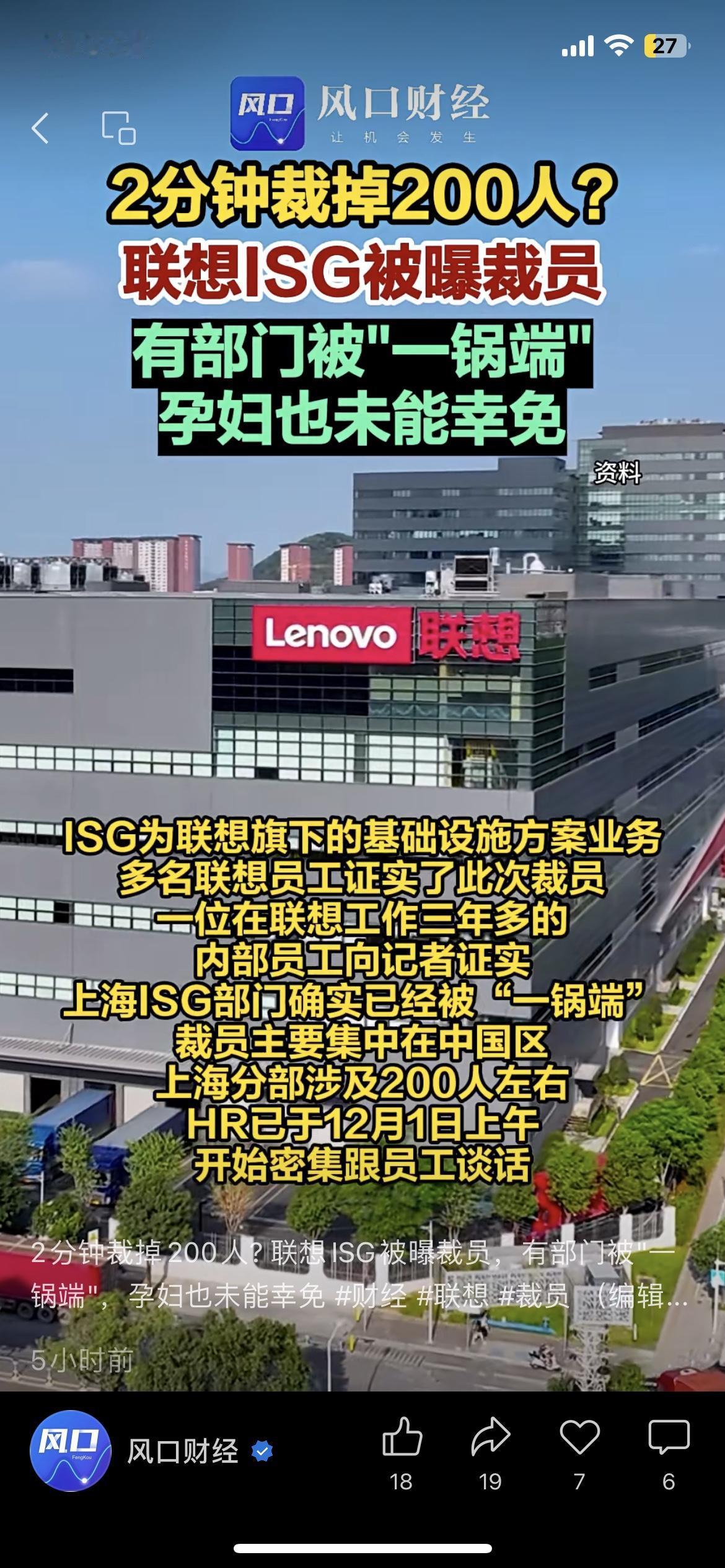 联想ISG被曝裁员 上海部门遭“一锅端” 近日联想ISG(基础设施方案业务)被曝裁员,上海部门大概200人直接被“一锅端”,就连孕妇也没被例外(来源:新黄河),通知只靠15分钟线上会、2分钟录音就发了。 小众角度:ISG业务可能受行业需求收缩影响要调整,这次裁员就是企业优化成本的激进操作。 信息增量:1. 裁员主要集中在中国区上海分部,HR12月1日就已经启动员工谈话;2. 不少内部员工都证实,这次裁员特别突然。 你怎么看待企业这种“闪电式”裁员操作? 以上内容核心事实均来自公开权威信息,仅供参考,具体可以官方最新通报为准;个人解读仅代表客观分析,不构成任何引导,理性看待热点更重要。联想企业