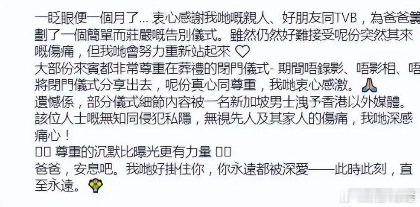 许绍雄女儿斥责钱翰群泄露丧礼细节钱翰群向许绍雄家属道歉 12月6日,许绍雄女儿许惠菁发文感谢亲友及TVB为父亲筹划告别仪式,并表示丧礼当天有来宾对外泄露丧礼细节,令她十分不满:“大部分来宾都非常尊重葬礼的闭门仪式 —— 期间不录影、不拍照、不将闭门仪式分享出去,这份真心与尊重,我们衷心感激。🙏🏼遗憾的是,部分仪式细节内容被一名新加坡男士泄露给了香港以外的媒体。该人士的无知与侵犯隐私的行为,无视先人与家人的伤痛,我们深感痛心!”有消息指出,这位男士是新加坡艺人钱翰群。他与许绍雄私交甚笃,还曾应许绍雄邀请,和黎芷珊搭档担任许惠菁新加坡婚宴的司仪。钱翰群于上月中旬赴港出席丧礼后,接受当地传媒时提及了香港与新加坡两地告别仪式的习俗差异,又披露了许绍雄继子悼词的详尽内容。而在许惠菁发文斥责后,有新加坡传媒联系到钱翰群,他急忙致歉并解释:“只希望让大家知道‘欢喜哥’是这么好的一个人。” 同时称已发短讯向家属致歉。
