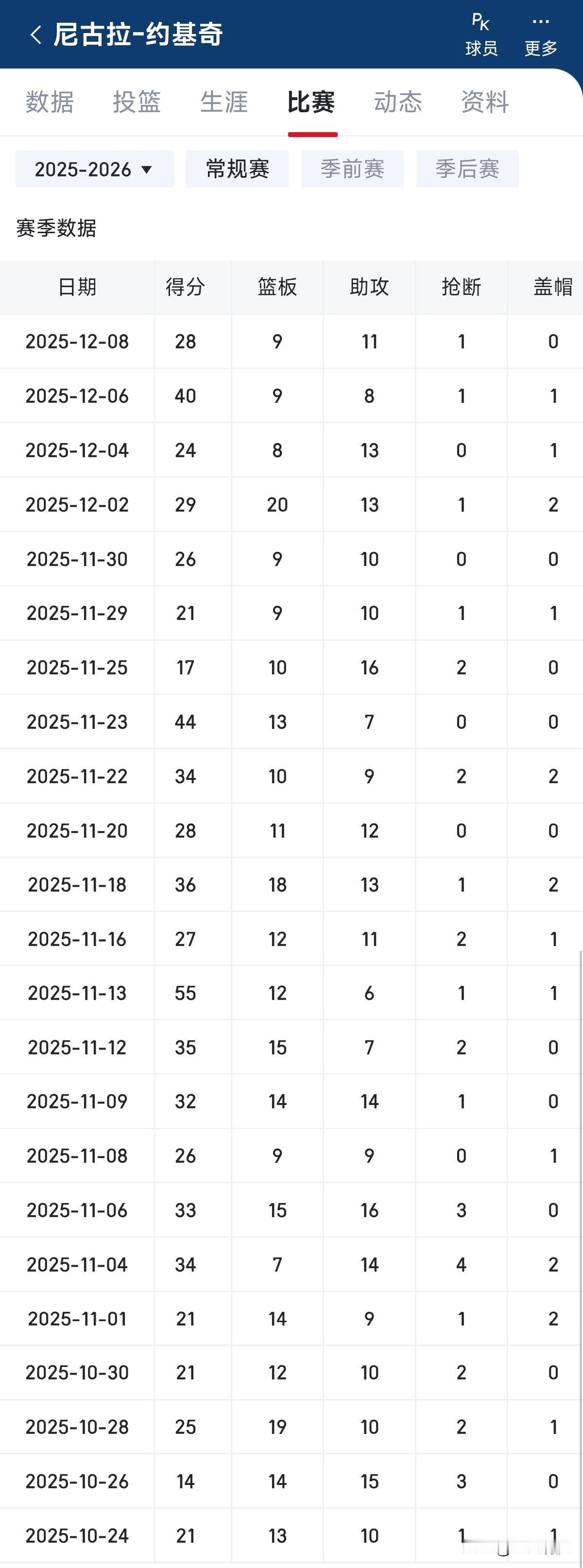 离谱!总是差那么一点点,难道真的不在乎吗?数据统计显示,约基奇本赛季目前打了23场比赛,其中有11场拿到三双。比较无语的是有五场比赛只差一个助攻(或者篮板),差两个助攻(或者篮板,又或者一个篮板一个助攻)的场次有三场。目前距离历史第二大O只差六场,争取春节前完成吧!