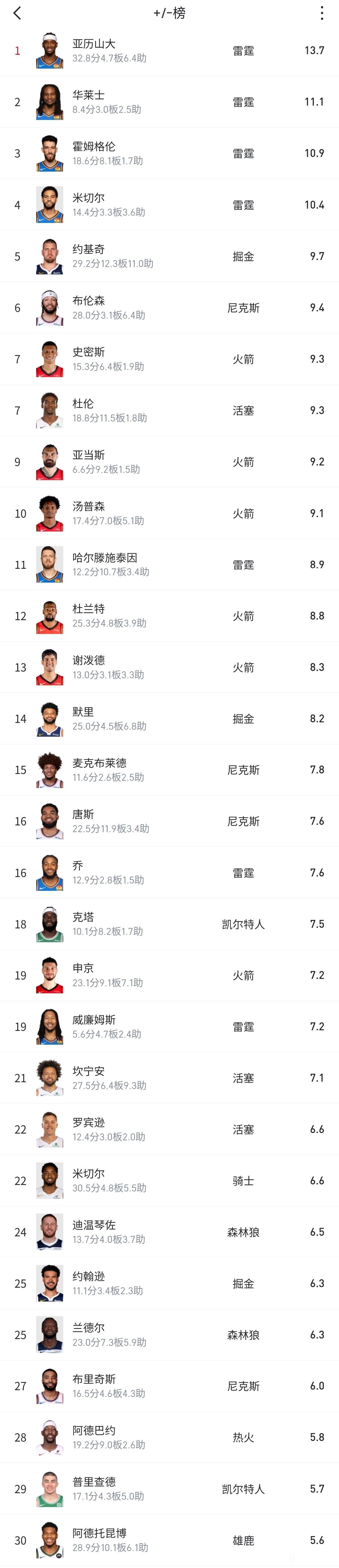 詹姆斯和库里居然没上榜(无缘百强名单),这个肯定跟球队战绩有直接关系,目前亚历山大的正负排名全联盟第一,甚至前四都是来自雷霆队,第五是约基奇,杜兰特只能排名第12位,字母哥更离谱在30位了,东契奇都快在50位了(第43位),这个数据你们觉得到底有不有意义?