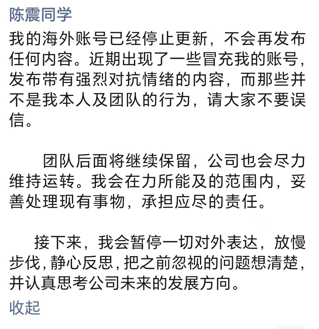 陈震官宣:海外账号已停止更新,不再发布任何内容;接下来将暂停一切对外表达,放慢脚步静心反思,厘清此前被忽视的问题,审慎思考公司未来的发展方向。不得不说,这种“缄默”才是最高明的策略——不轻易暴露自身想法,深藏不露,反而能在复杂局面中游刃有余。🐮