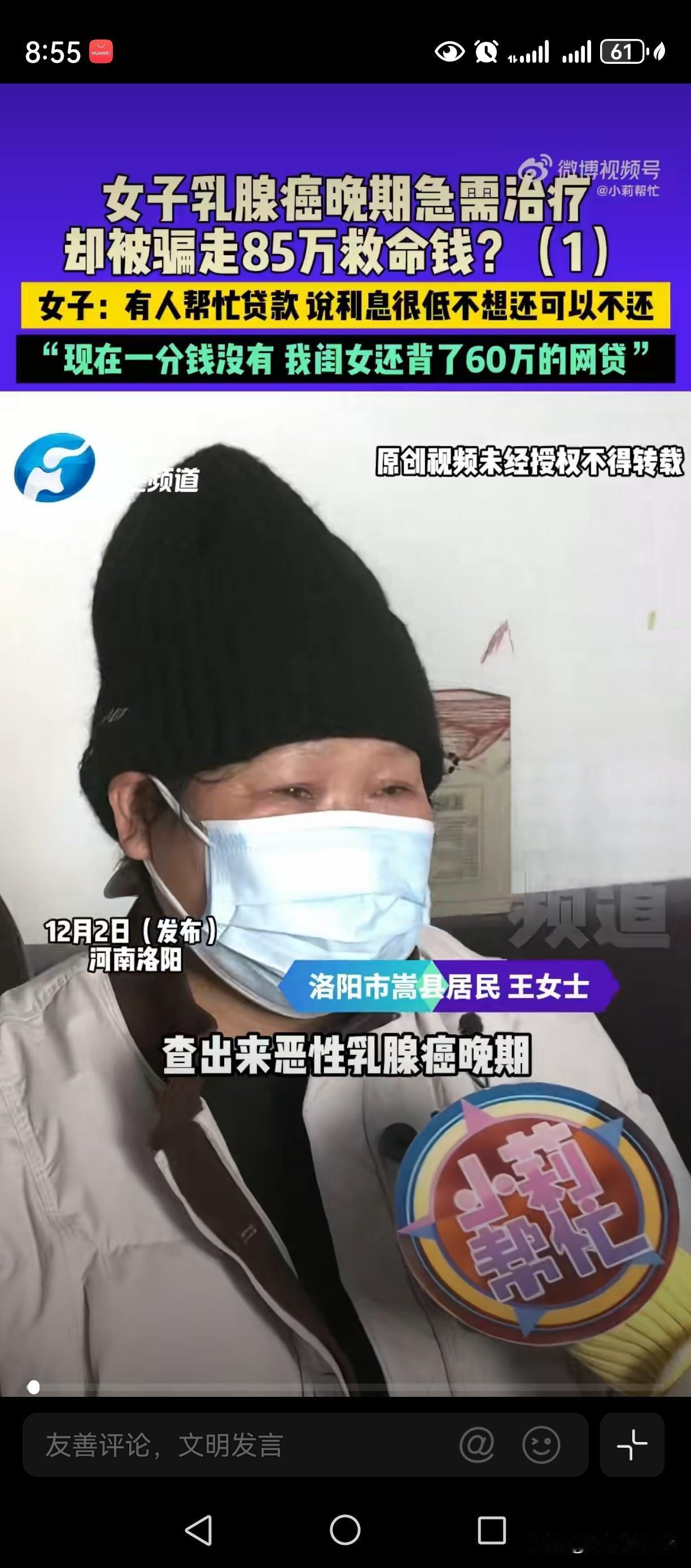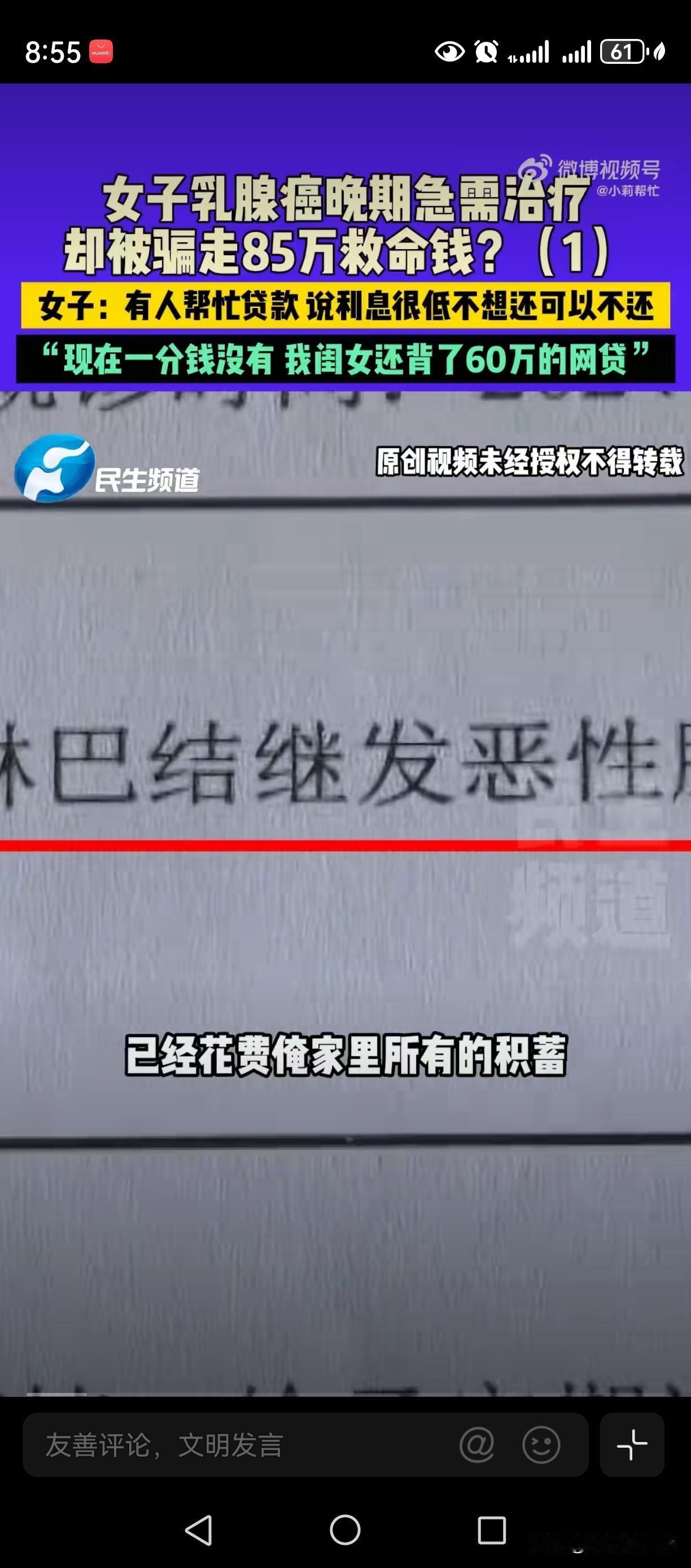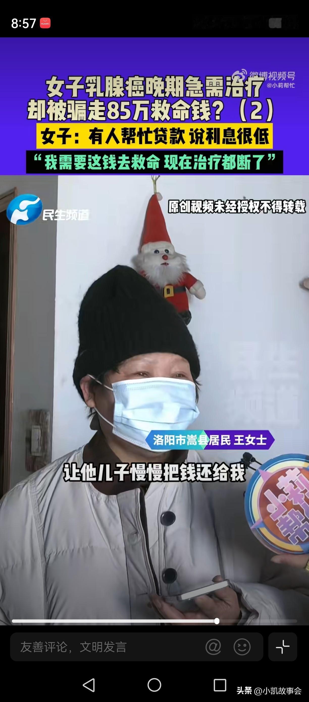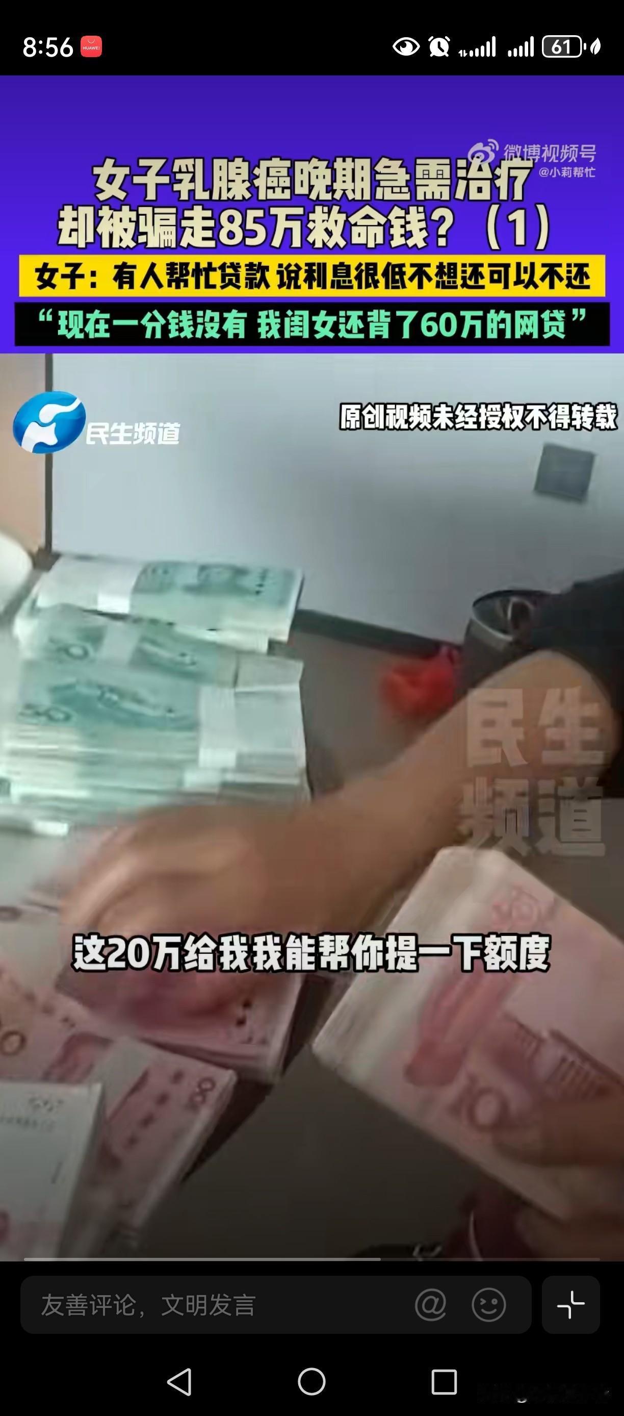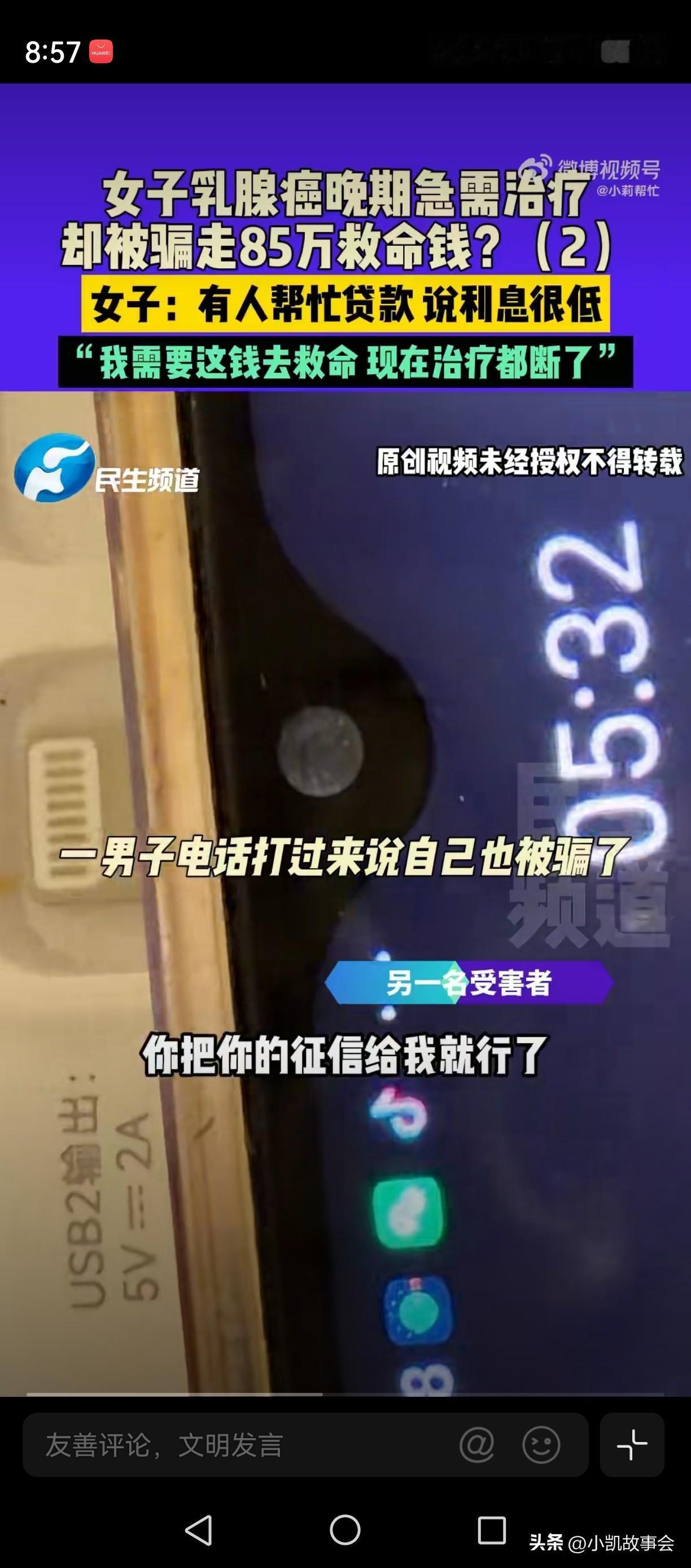 骗子真是最没有底线的生物! 女子癌症晚期急需钱来治病, 骗子以帮其贷款的名义,前前后后从女子家中又骗走85万元,让原本处在水深火热中的家庭更加雪上加霜! 现在人消失了,女子现在已经完全放弃治疗了,这骗子连救命钱都能骗,真是太没有底线了! 期待女子能够追回被骗子骗走的钱,希望后续能够追回吧!太可怕的骗局 新型骗钱套路 高额骗局 贷款诈骗 天价骗局 帮忙骗局 骗子上热门话题 诈骗银行贷款 专家骗局 抗癌药骗局 癌症借钱 癌症欺诈 癌症谎言 医学骗子 中医抗癌骗局