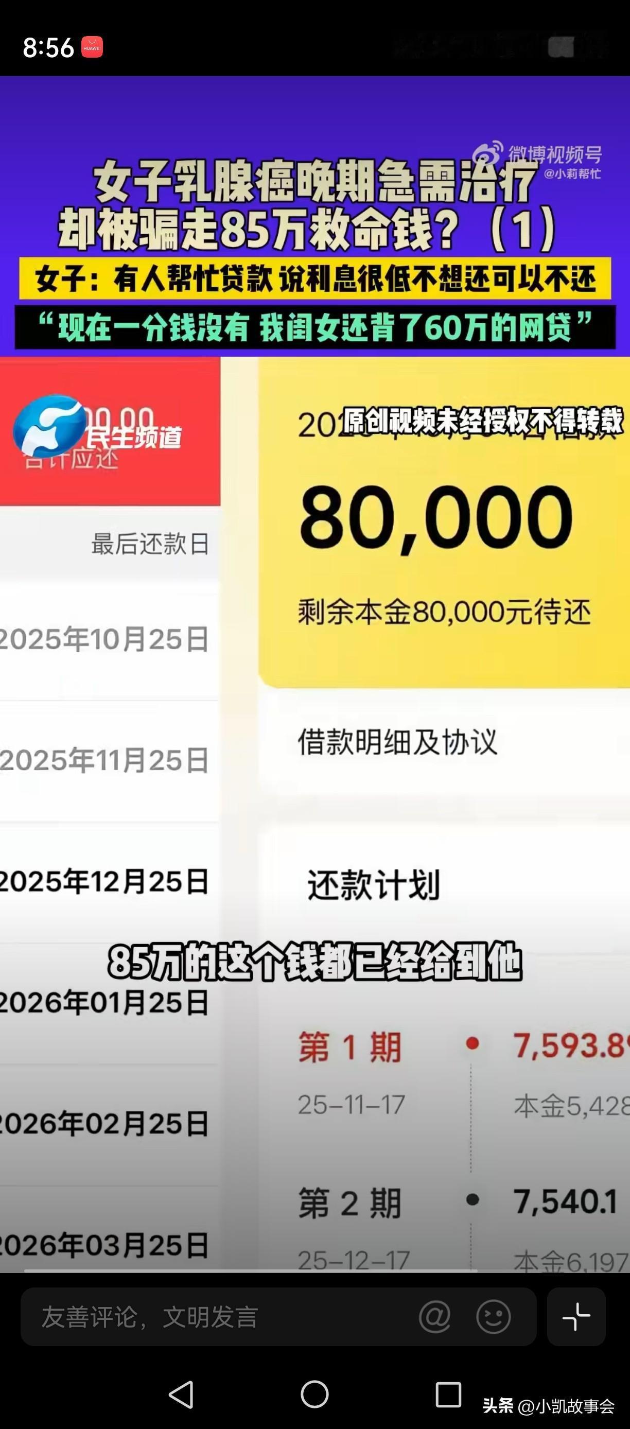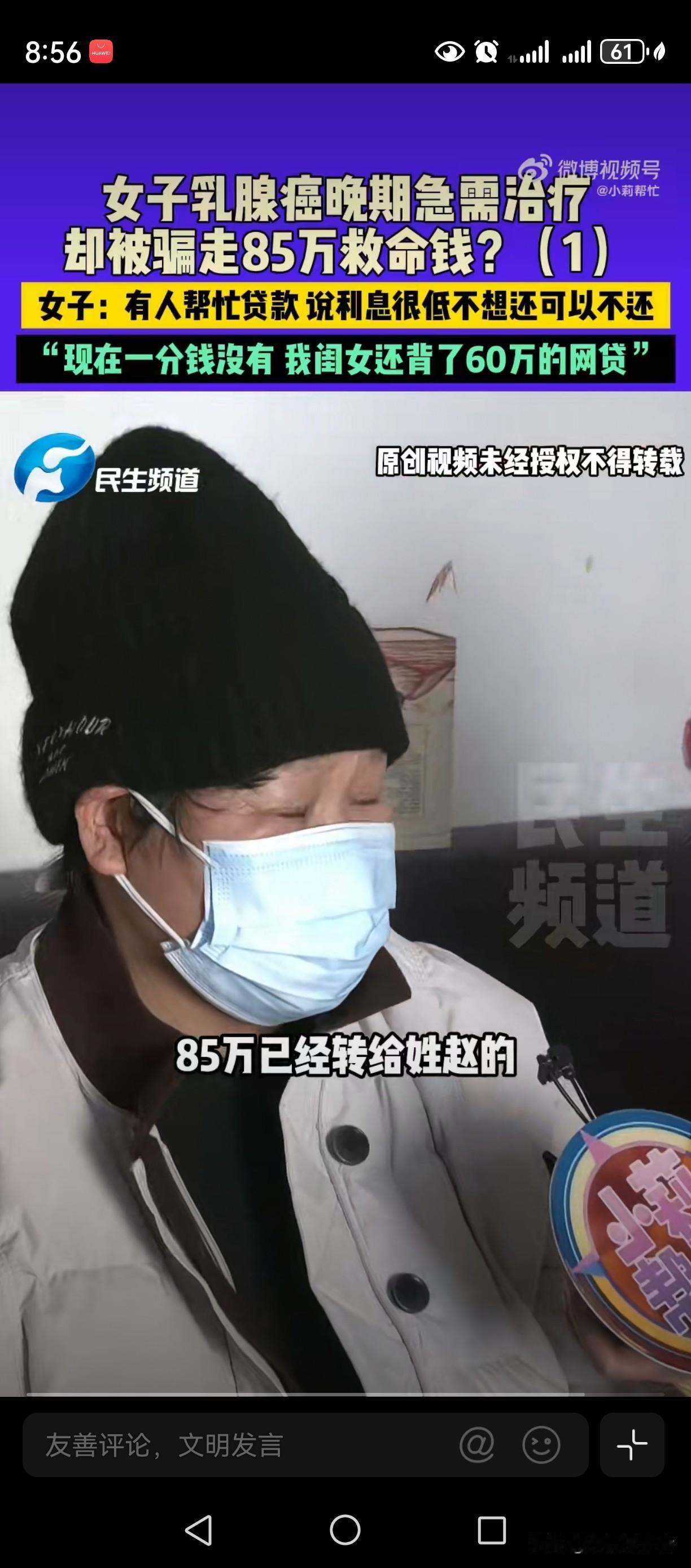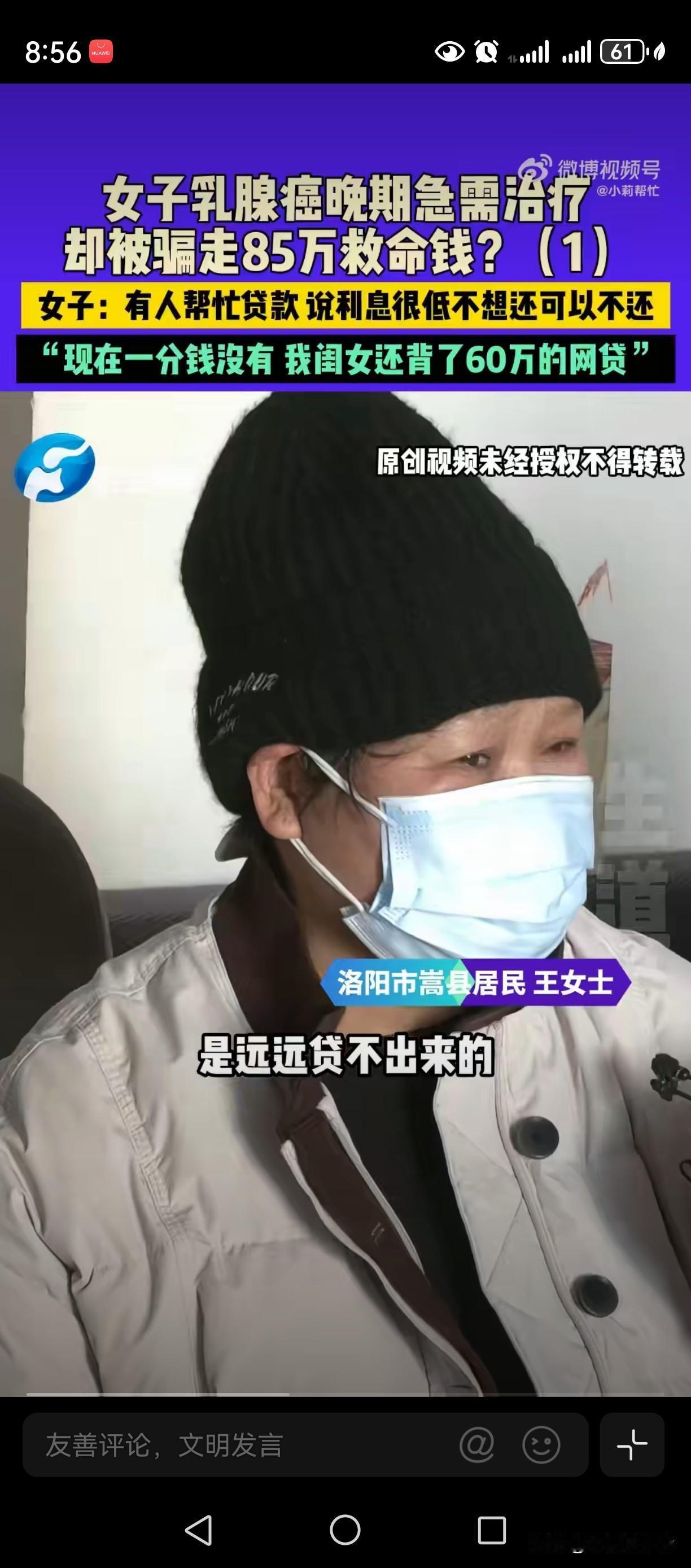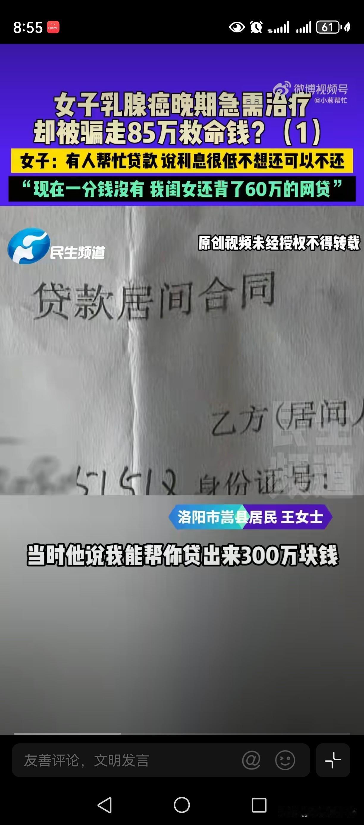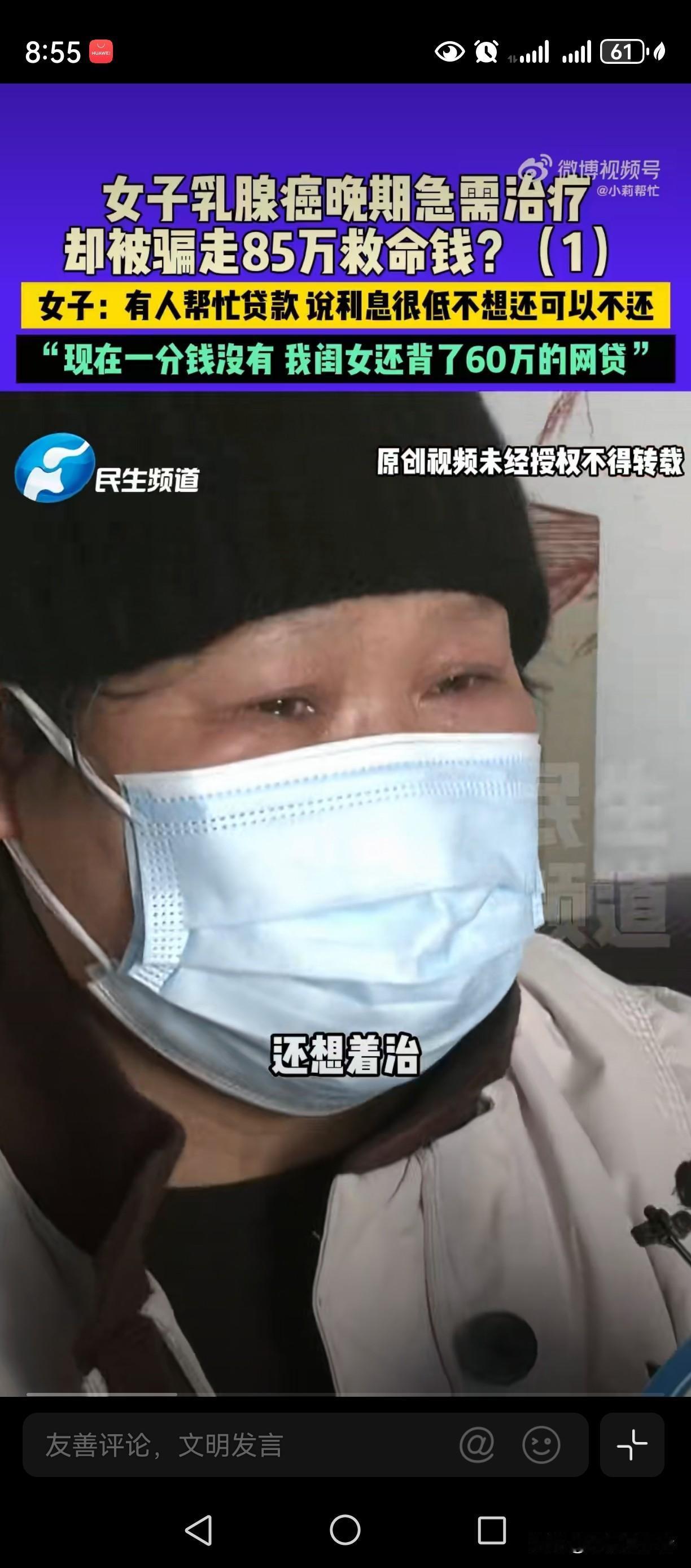 骗子真是最没有底线的生物! 女子癌症晚期急需钱来治病, 骗子以帮其贷款的名义,前前后后从女子家中又骗走85万元,让原本处在水深火热中的家庭更加雪上加霜! 现在人消失了,女子现在已经完全放弃治疗了,这骗子连救命钱都能骗,真是太没有底线了! 期待女子能够追回被骗子骗走的钱,希望后续能够追回吧!太可怕的骗局 新型骗钱套路 高额骗局 贷款诈骗 天价骗局 帮忙骗局 骗子上热门话题 诈骗银行贷款 专家骗局 抗癌药骗局 癌症借钱 癌症欺诈 癌症谎言 医学骗子 中医抗癌骗局