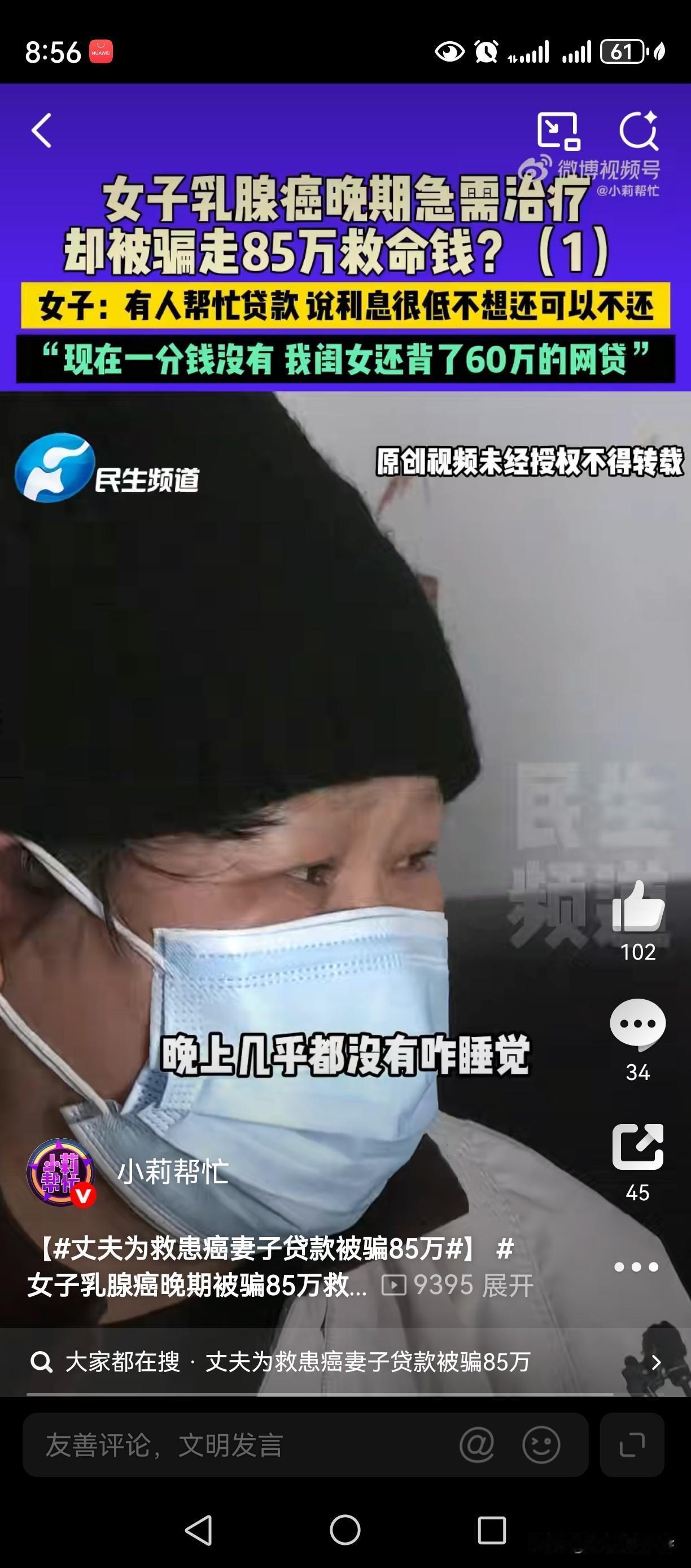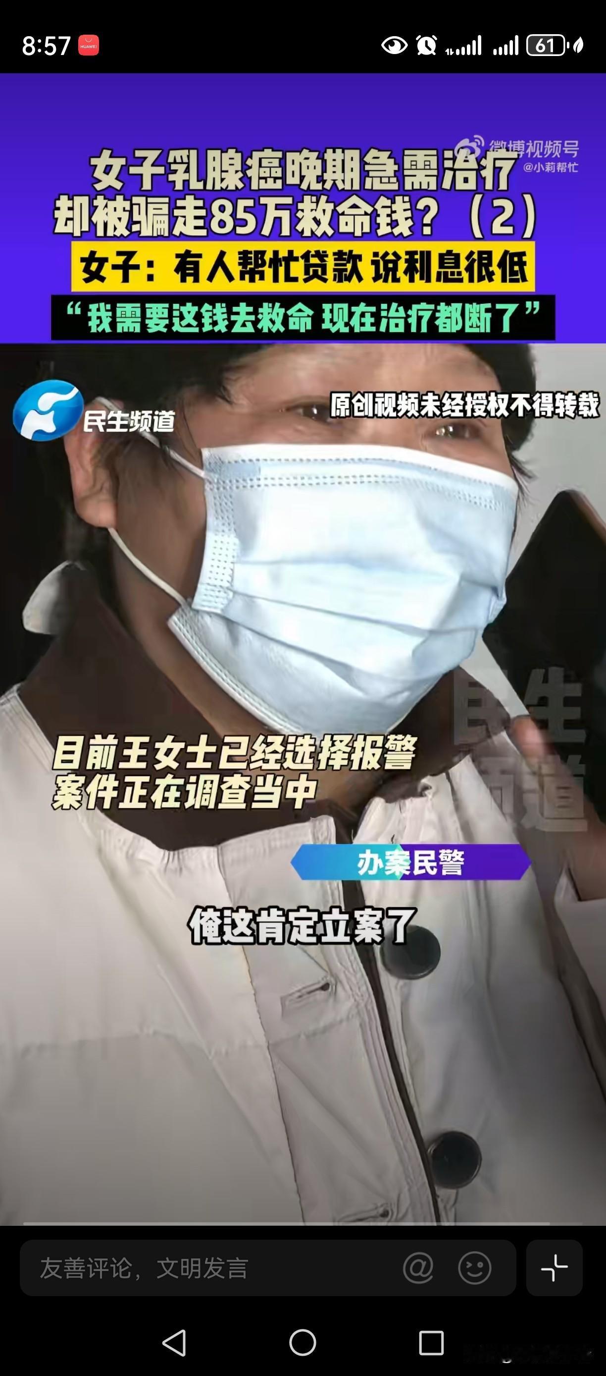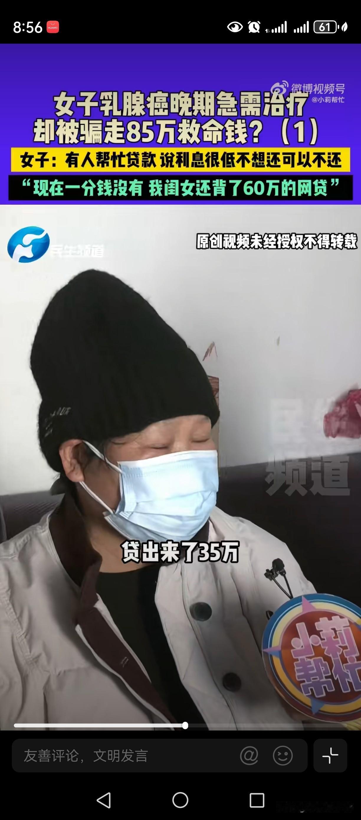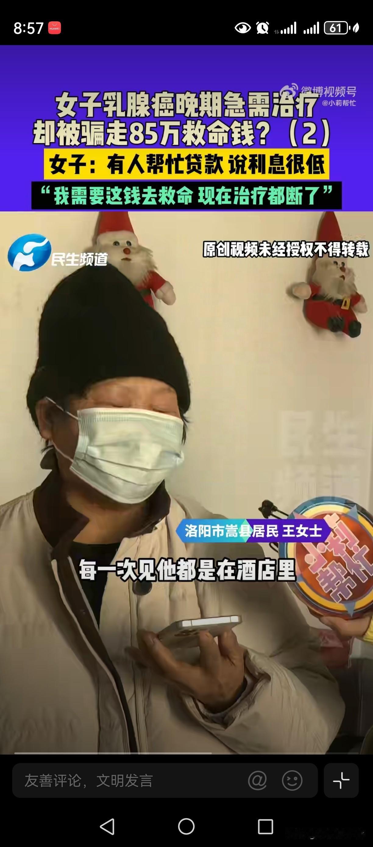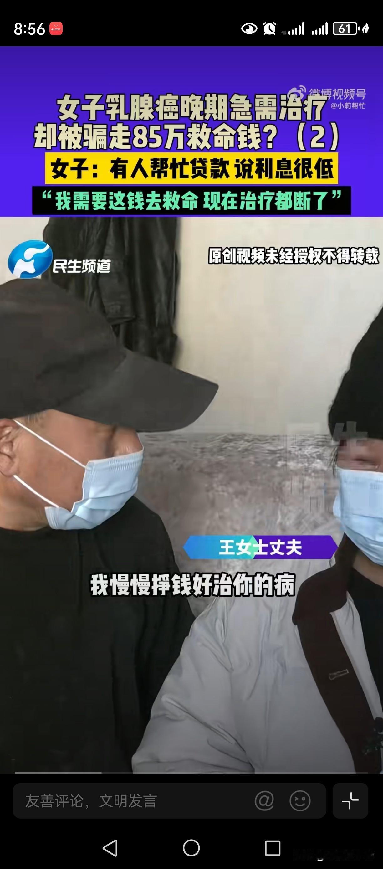 骗子真是最没有底线的生物! 女子癌症晚期急需钱来治病, 骗子以帮其贷款的名义,前前后后从女子家中又骗走85万元,让原本处在水深火热中的家庭更加雪上加霜! 现在人消失了,女子现在已经完全放弃治疗了,这骗子连救命钱都能骗,真是太没有底线了! 期待女子能够追回被骗子骗走的钱,希望后续能够追回吧!太可怕的骗局 新型骗钱套路 高额骗局 贷款诈骗 天价骗局 帮忙骗局 骗子上热门话题 诈骗银行贷款 专家骗局 抗癌药骗局 癌症借钱 癌症欺诈 癌症谎言 医学骗子 中医抗癌骗局