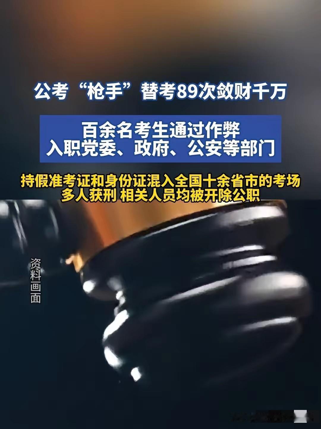 89个替考混入公职单位的人, 全部被开除,替考团伙被绳之以法! 在过去的6年里,这个替考团伙组织上百人跨省替考,替考进入公职单位,混入党委、当局、公安系统,非法获利1000多万。公职单位的人都是通过什么方式招聘的呢?难道是替考进去的吗?想必很多人都有这样的疑问。这不,替考团伙就给我们做了最好的解释。这些公职单位的人都是替考进入的。 这些替考者花10多万进入公职单位,想轻松做官,没想到案件发作,他们不仅失去工作,还留下“刑事犯罪”的污点。替考“枪手”大都是名校硕士、博士,因贪图快钱走上歧途。“替考团伙”主犯张某杰被判有期徒刑5到5年半,并处罚金70万到100万。 该替考团伙产业链分工明确,有人专门制作假证件,有人利用高科技制作假身份证件,有人负责联系“枪手”。令人担忧的是,他们还制作过假的录取通知书、学位证书等。 这样的团伙能够被绳之以法,对社会来说是一个安慰,但也只能治标不治本,毕竟人心都是有差别的,只要存在侥幸心理,就会有人走上歪路。判决书也给我们提了个醒:走歪路必走到尽头,自食恶果。 麻烦看官老爷们右上角点击一下“关注”,既方便您进行讨论和分享,又能给您带来不一样的参与感,感谢您的支持!