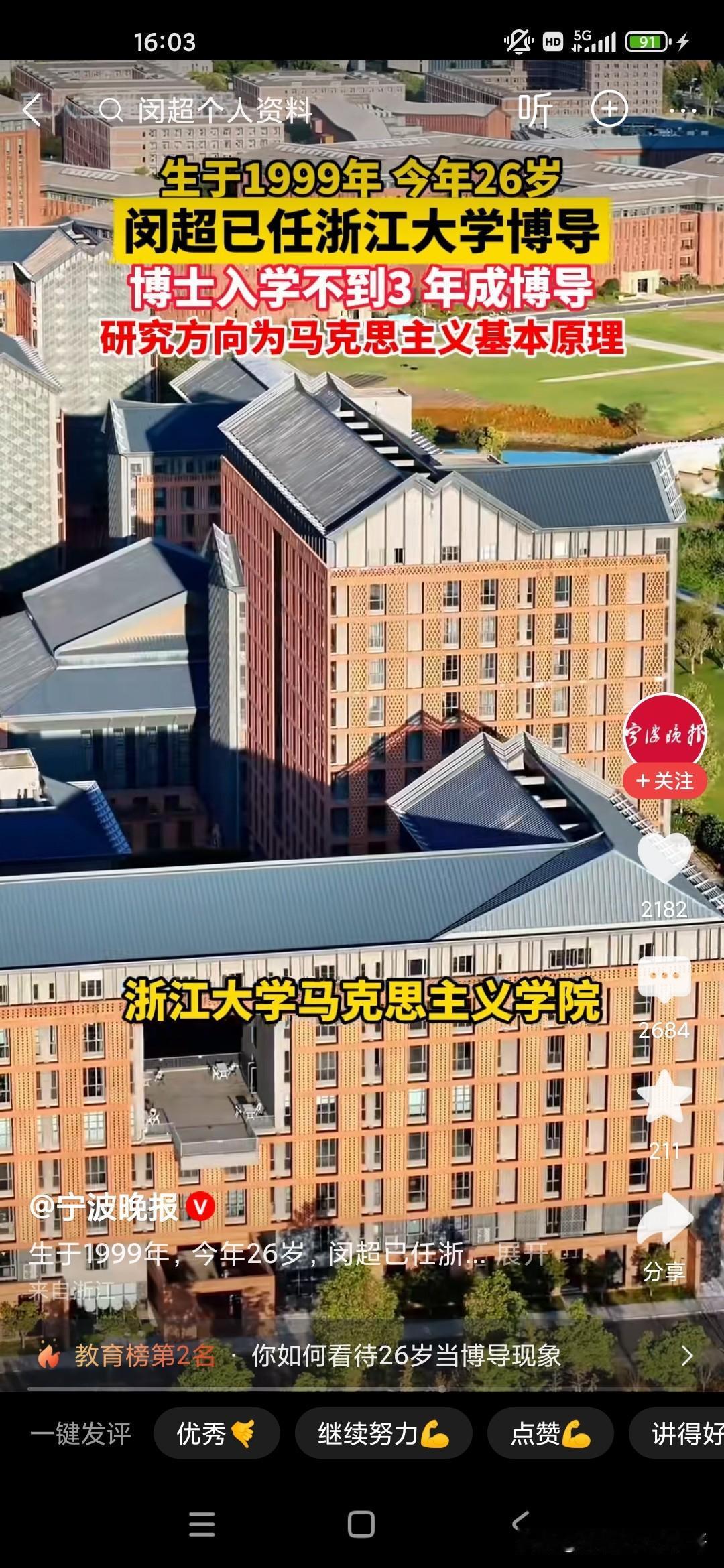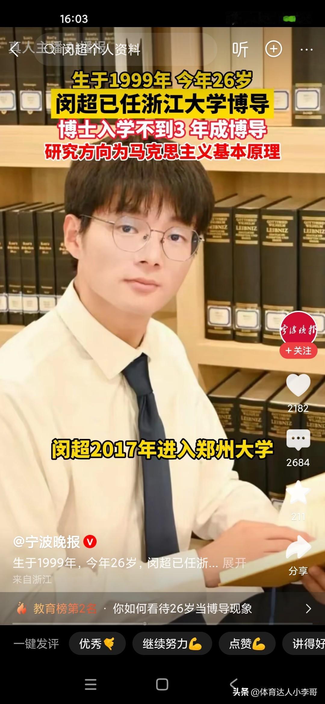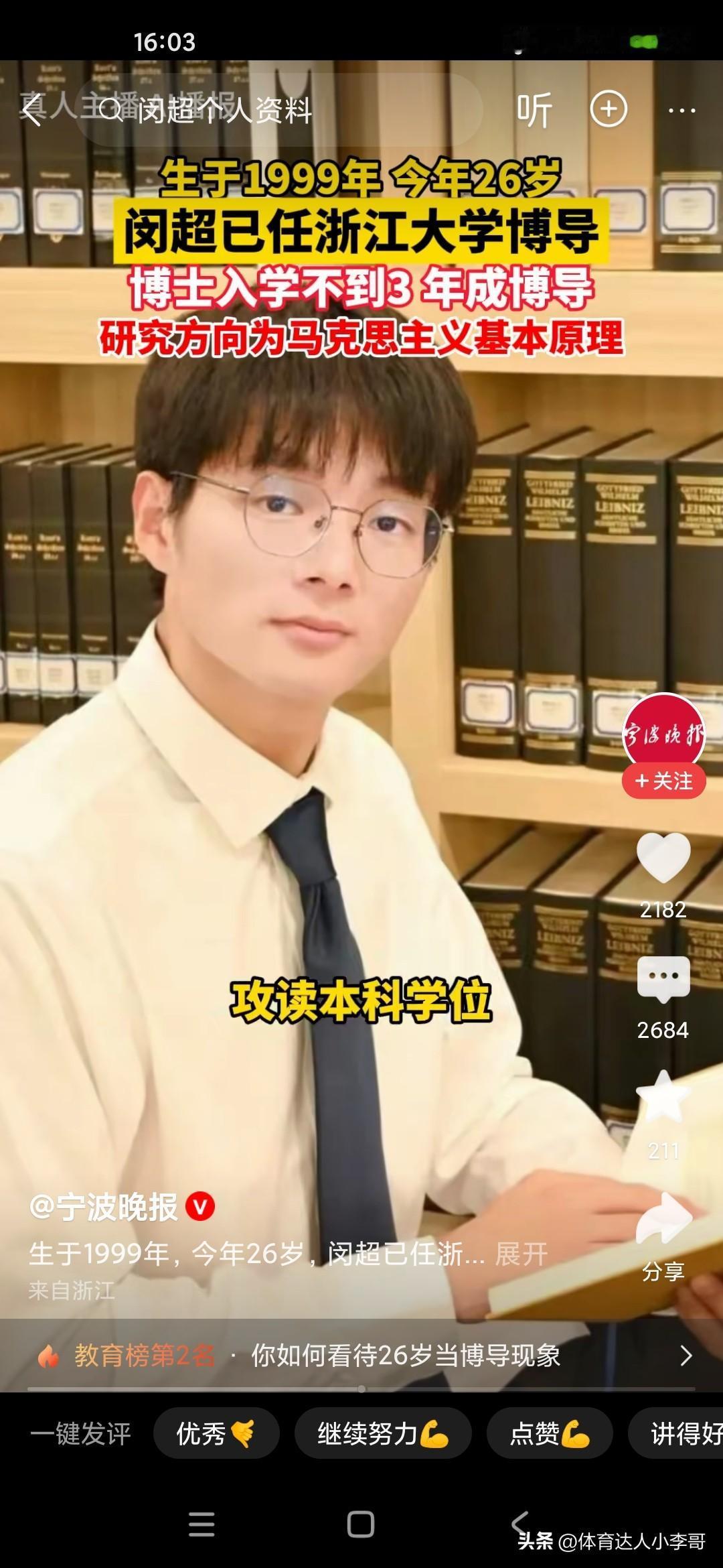 我不知道二十五六岁你在做什么,有的人二十五六岁本科还没有毕业,但是人家已经当博士生导师了,据说这位小伙子是郑州大学的本科后来因为学习学习成绩非常优秀,被保送到浙江大学硕博连读,在2023年的时候,博生毕业后来跟随比较牛掰的导师发表了一些重要的期刊论文,所以后来的话跟他的导师一样,也做了博士生导师,现在他的个人简介已经挂到浙江大学马克思主义学院的啊网页上面,真的是年轻有为啊,博士生导师的话,一般还有几百万的安家费,年薪也可以达到上百万,非常厉害,非常佩服现在的年轻人真的是年轻有为,长江后浪推前浪!