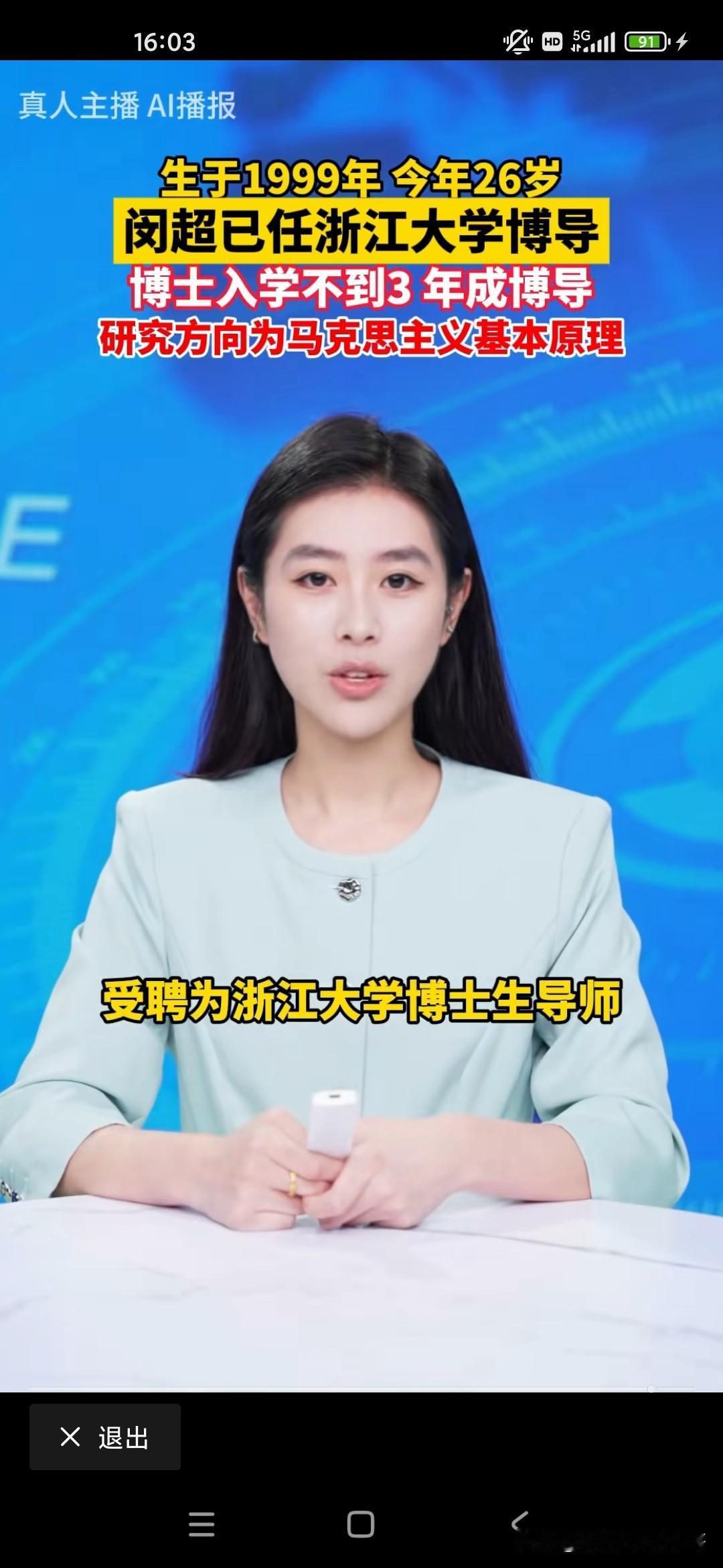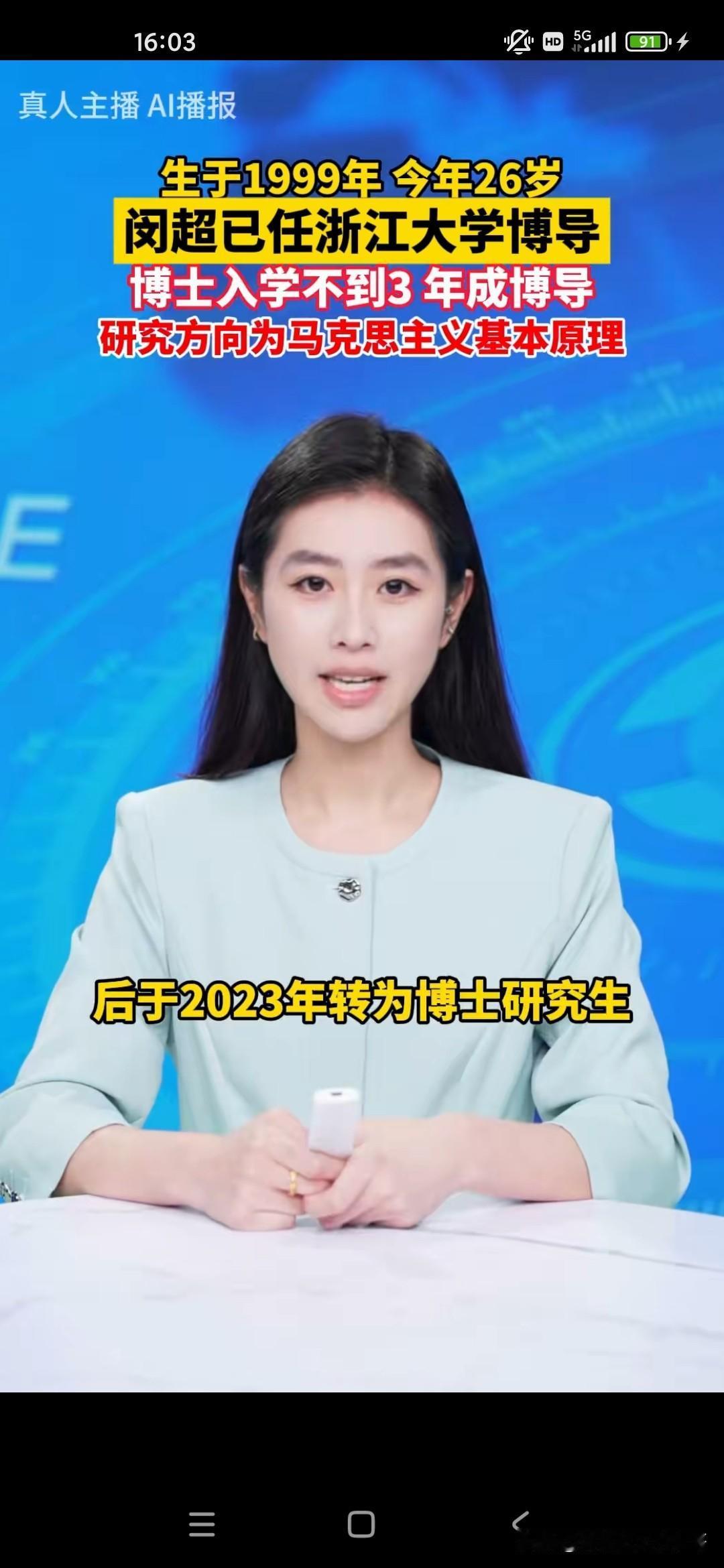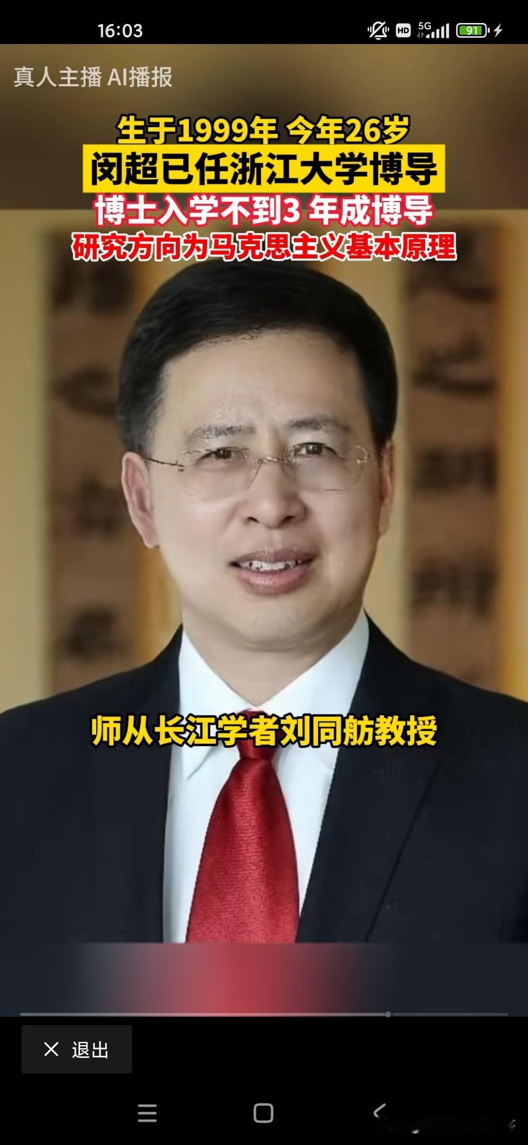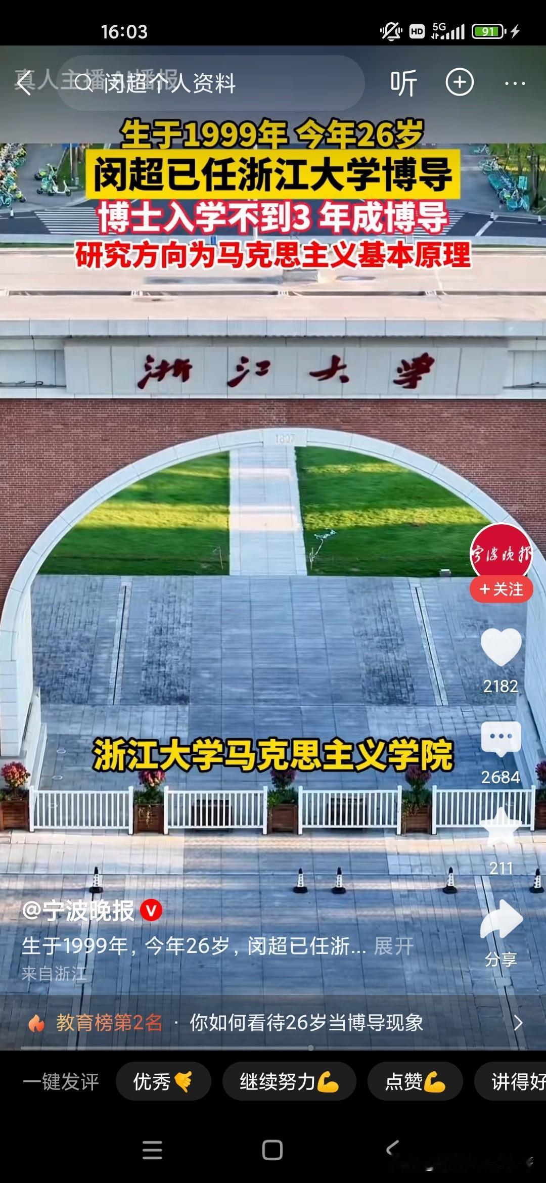我不知道二十五六岁你在做什么,有的人二十五六岁本科还没有毕业,但是人家已经当博士生导师了,据说这位小伙子是郑州大学的本科后来因为学习学习成绩非常优秀,被保送到浙江大学硕博连读,在2023年的时候,博生毕业后来跟随比较牛掰的导师发表了一些重要的期刊论文,所以后来的话跟他的导师一样,也做了博士生导师,现在他的个人简介已经挂到浙江大学马克思主义学院的啊网页上面,真的是年轻有为啊,博士生导师的话,一般还有几百万的安家费,年薪也可以达到上百万,非常厉害,非常佩服现在的年轻人真的是年轻有为,长江后浪推前浪!