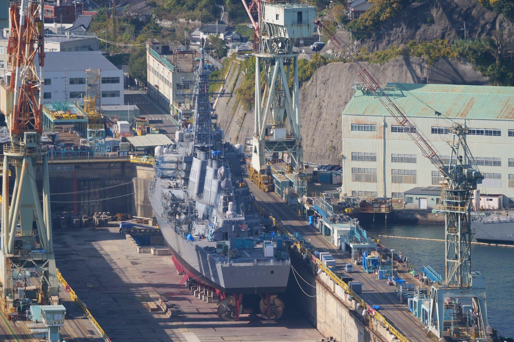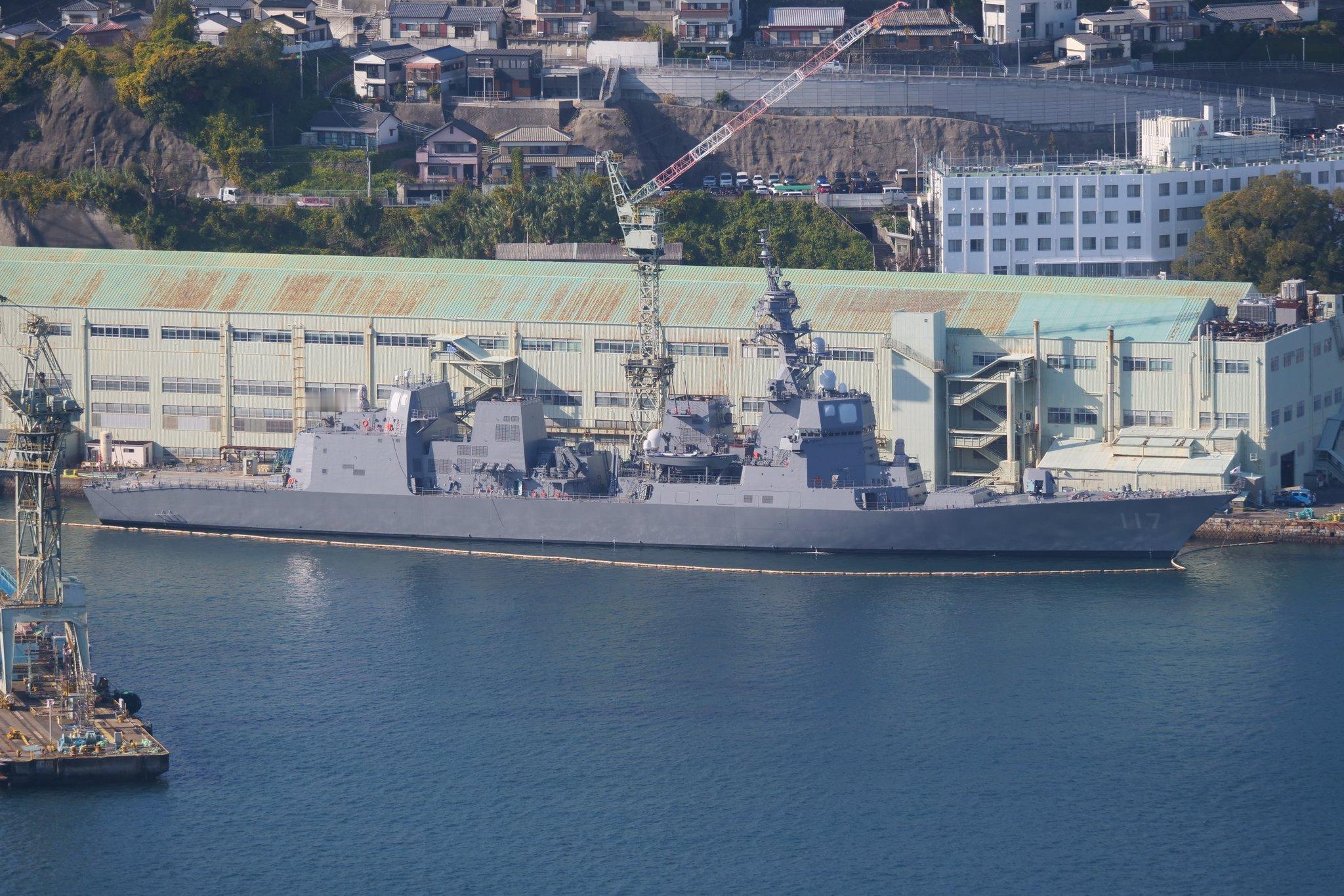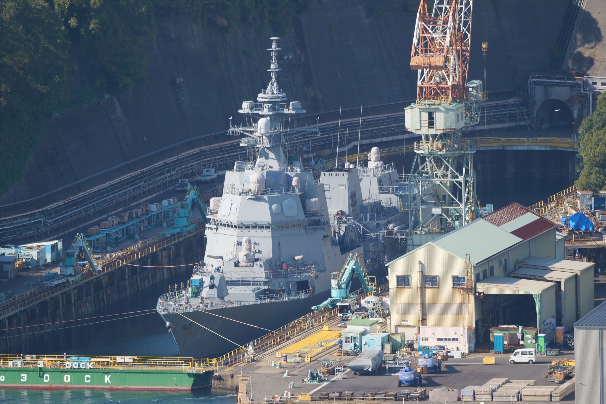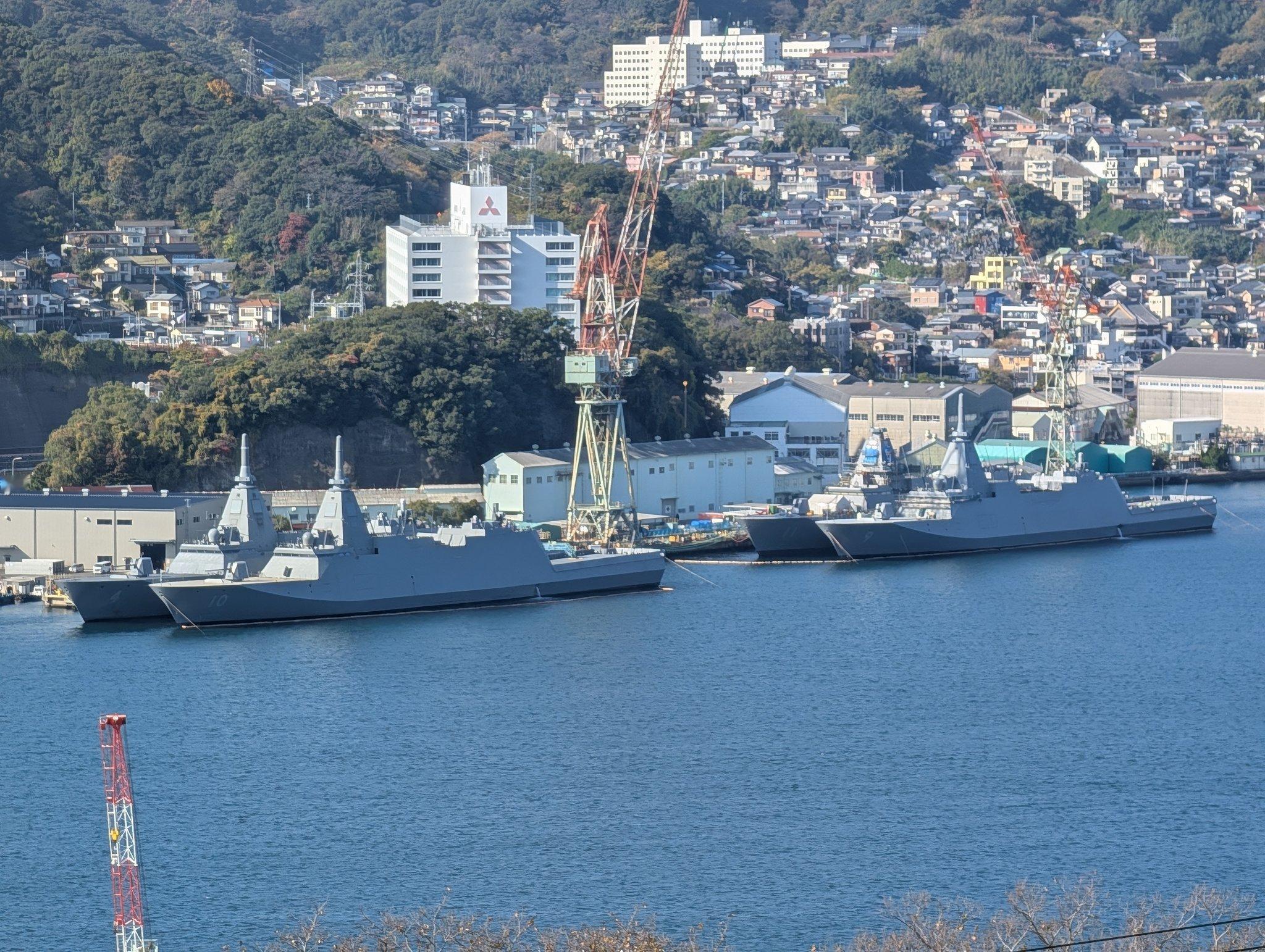 长崎造船所其他正在维护、舾装的舰艇——FFM-4“三隈”——FFM-9“名取”——FFM-10“长良”——FFM-11“龙田”——DD-119“朝日”——DD-117“凉月”——DDG-173“金刚”