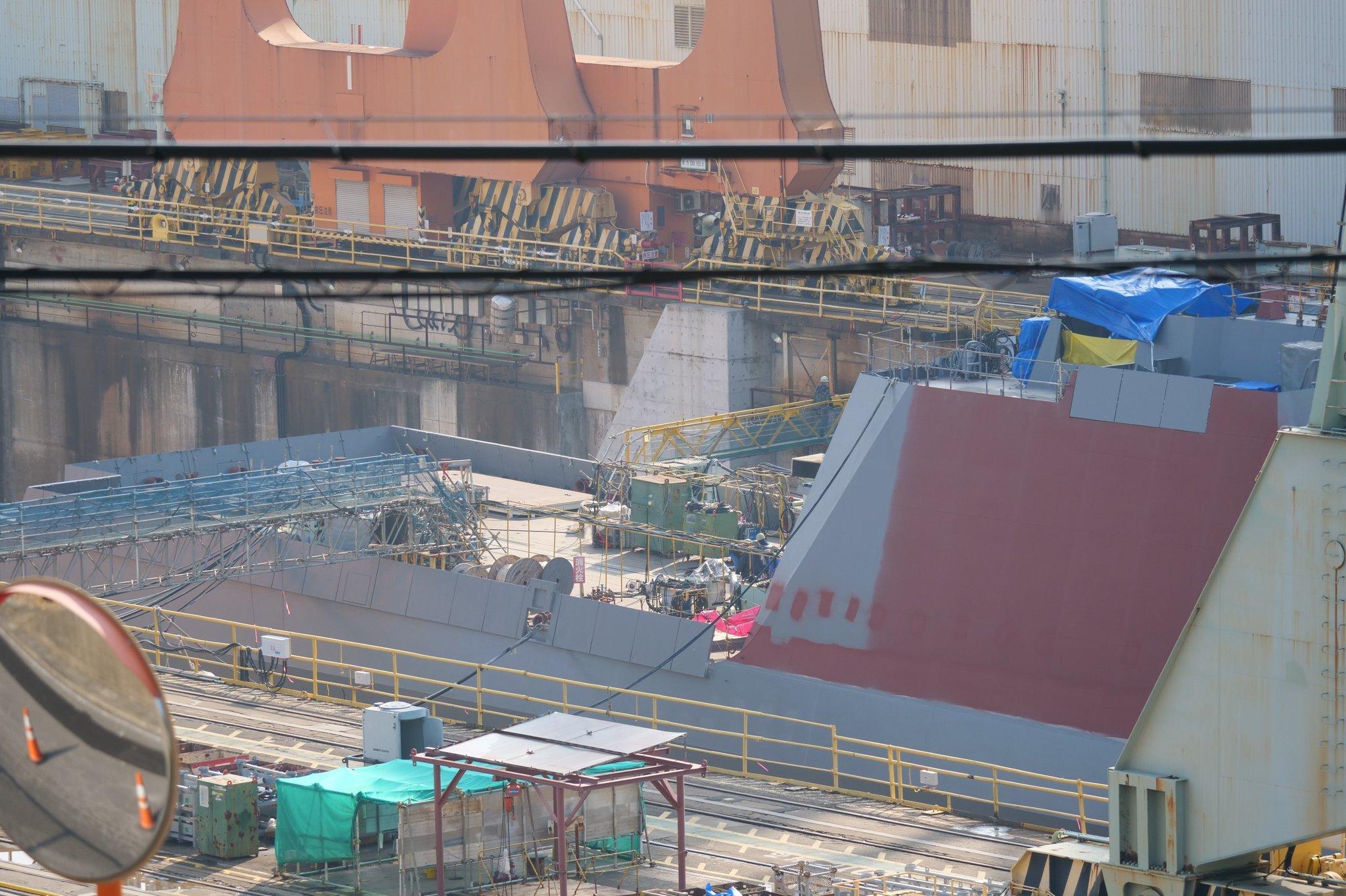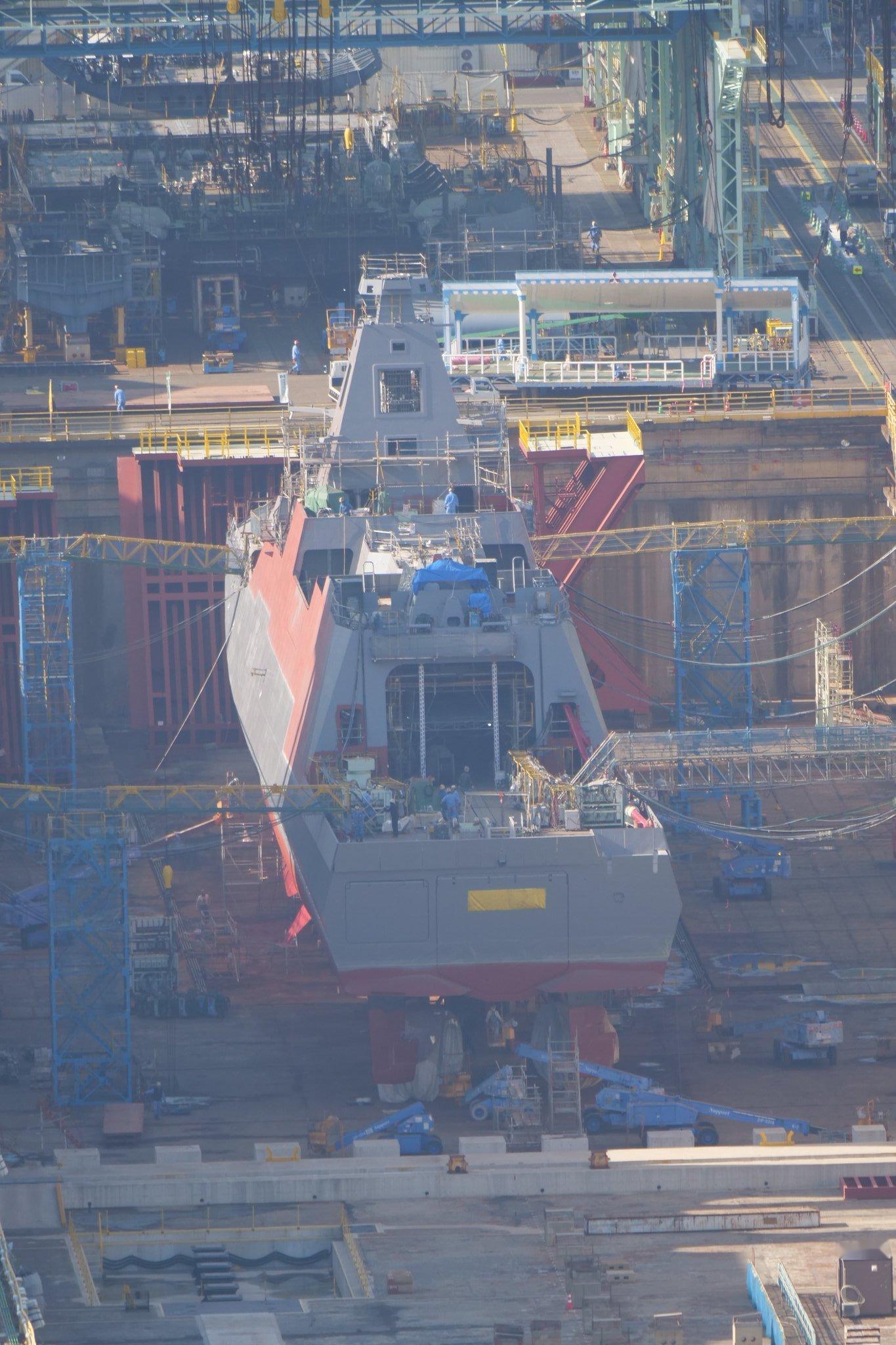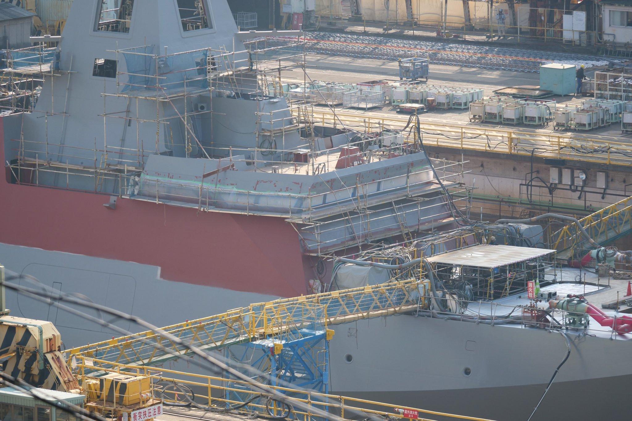 长崎造船所在建中的FFM-12,跟FFM-11也一样直接切开VLS预装位置 舰名果然已经涂上,暂时遮住了, 下水仪式用的台子也已经搭好了。