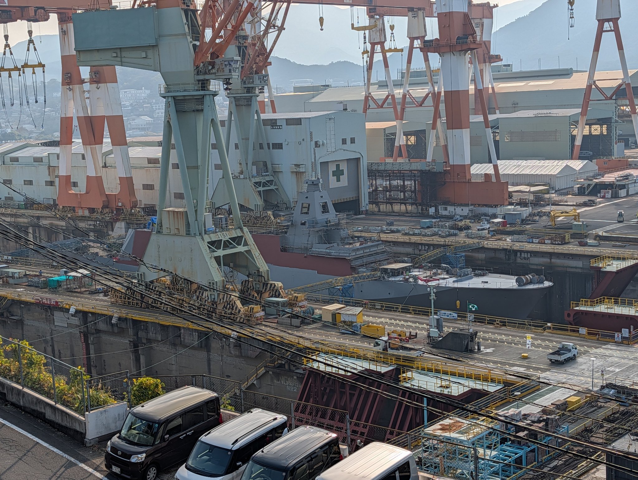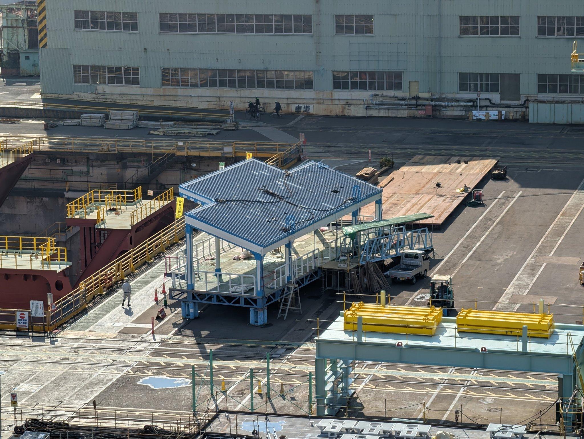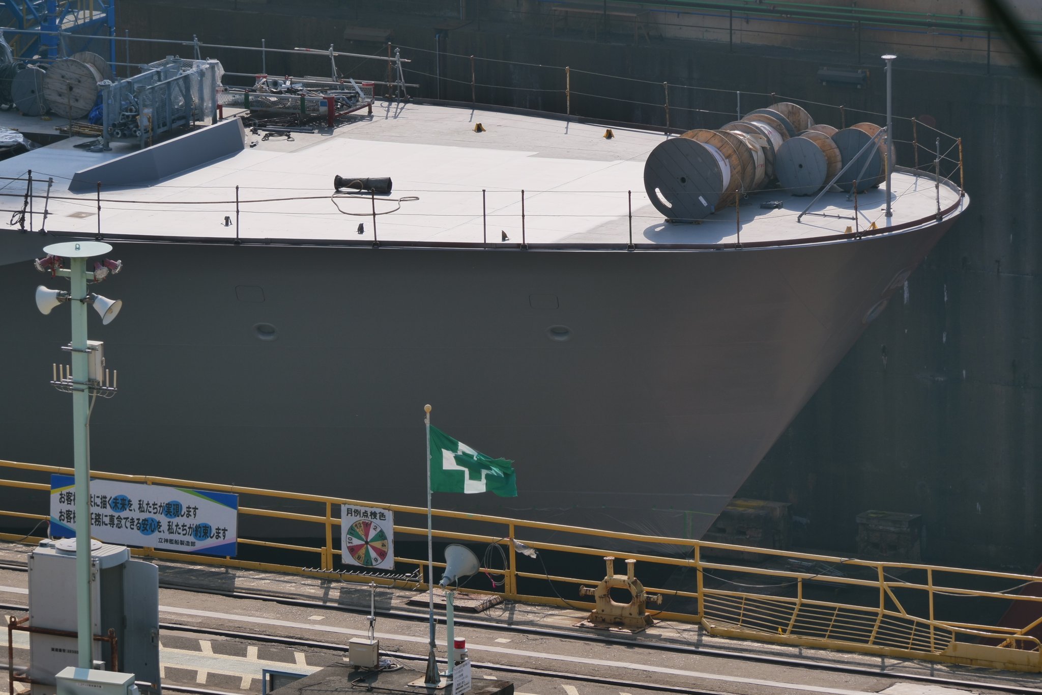 长崎造船所在建中的FFM-12,跟FFM-11也一样直接切开VLS预装位置 舰名果然已经涂上,暂时遮住了, 下水仪式用的台子也已经搭好了。