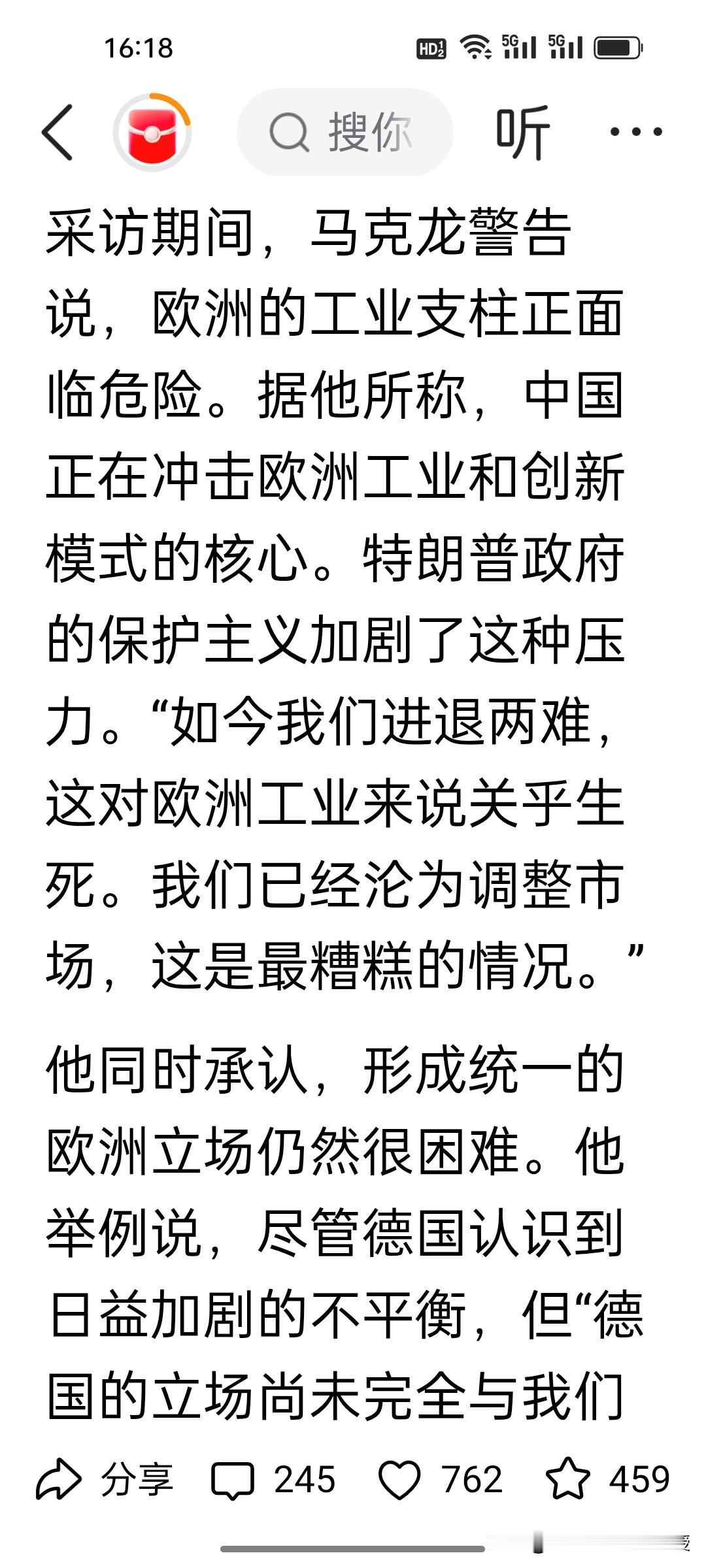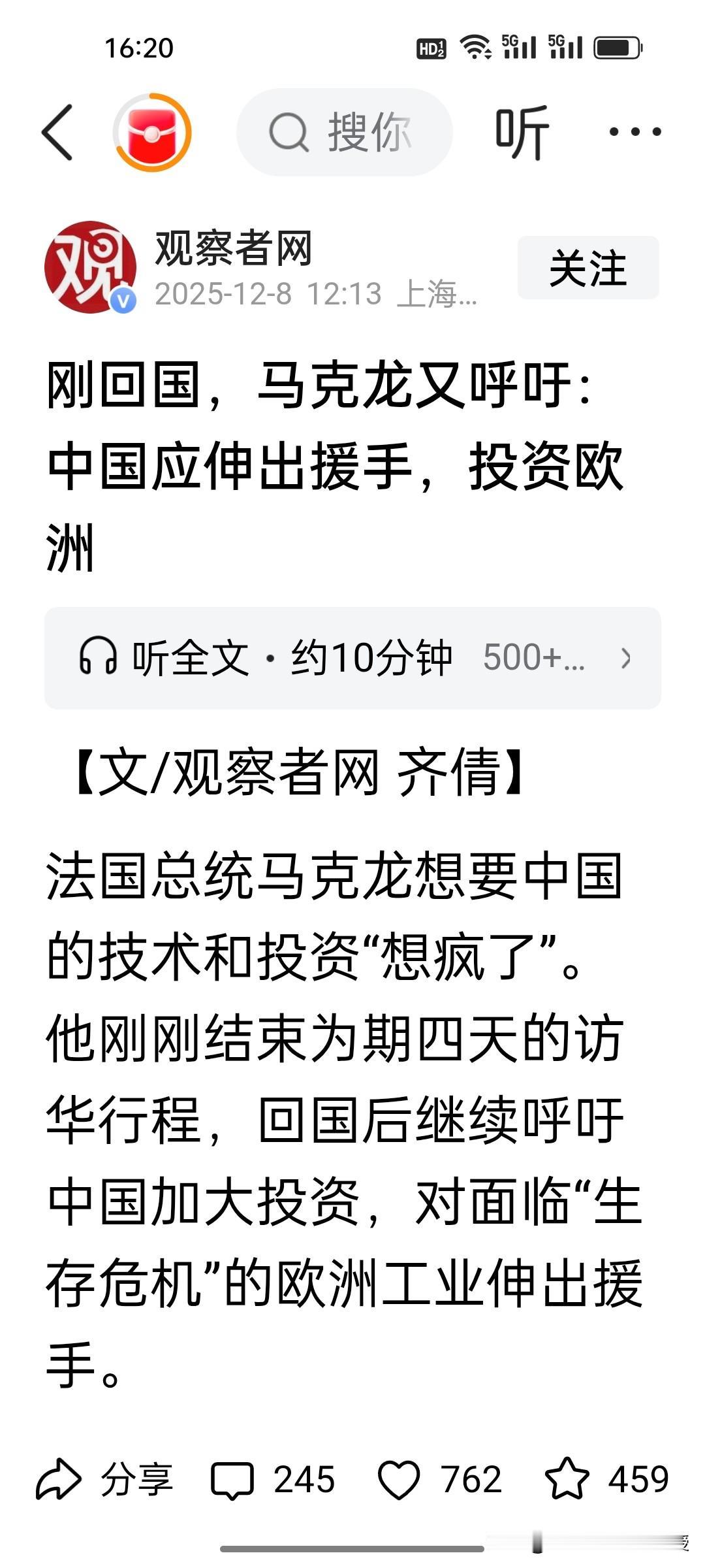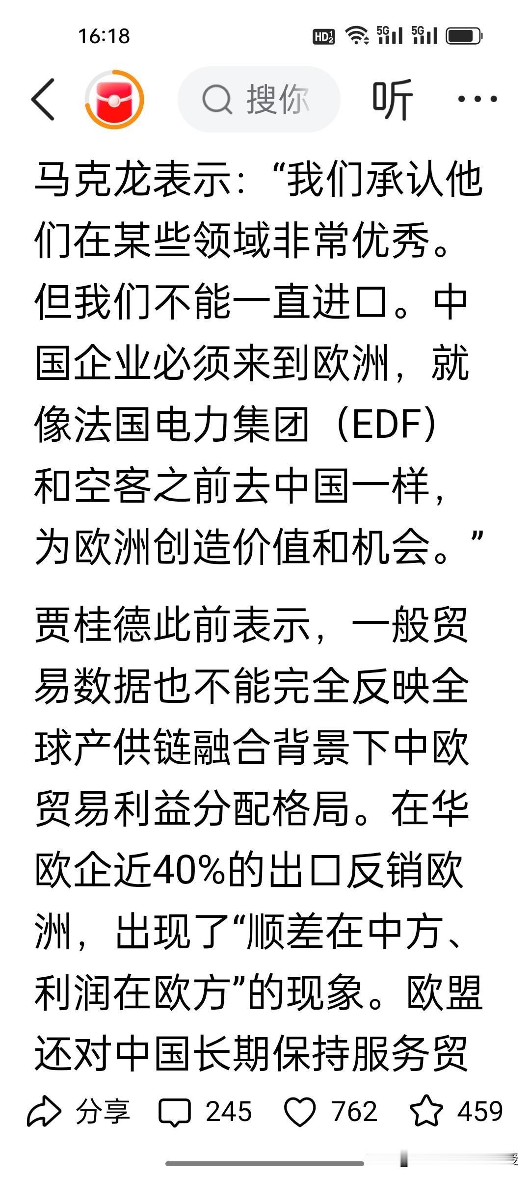 马克龙三天访华结束回去后说了句坦白的心里话!他在接受法媒采访时说,中方应通过外国投资来拯救欧洲。他已经认识到中方的技术已经领先于欧洲,目前欧洲因为受到美国的挤压以及中国的超强竞争力的影响,欧洲工业已经是“生死存亡”了。 马克龙提议要取消中欧双方的出口限制,如果中方不做出反应,欧洲或许会效仿美国的做法,对中国产品加税。 马克龙完全是站在欧洲的立场上考虑问题,让中国来当“救世主”,让中国要“达则兼济天下”,可是马克龙要明白,中欧经贸的本质是优势互补、互利共赢,绝非单方面“拯救”。 中国企业赴欧投资的前提是公平环境与合理回报,不可能以牺牲自身利益为代价。欧洲的《数字服务法案》翻云覆雨,已经在这几年罚了谷歌82亿,罚了Meta,苹果7亿,现在又罚马斯克1.2亿欧元,马斯克直呼要取消欧盟。这样的营商环境谁来投资都瑟瑟发抖吧?另外,取消出口限制需双向对等,威胁要给中国加税只会两败俱伤,唯有平等相待、相向而行,才能让中欧合作行稳致远。