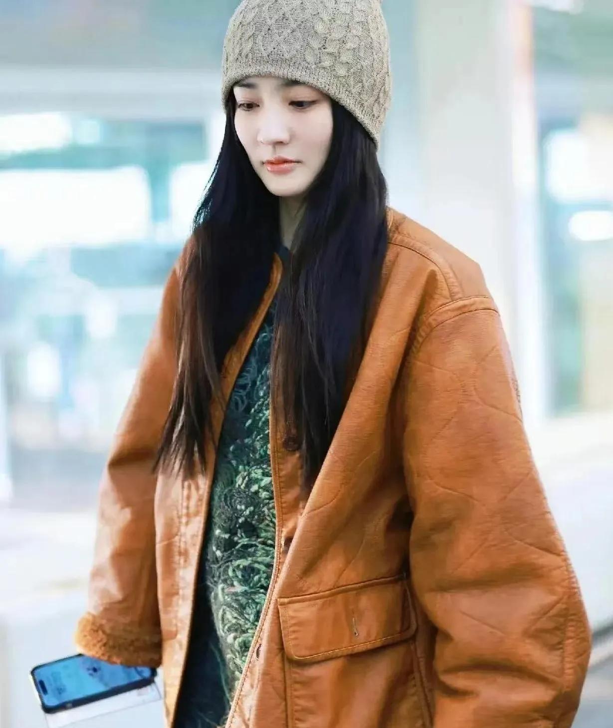 徐璐这机场私服,把“秋日松弛感”穿明白了 谁看了不说句徐璐会搭!焦糖棕皮衣叠暗纹内搭,配浅蓝阔腿裤,再用针织帽+粉包点睛——暖棕+柔粉的撞色,甜酷又不违和,随手一坐都是松弛感。 皮衣袖口的毛绒边、内搭的暗纹细节,把“随性”和“精致”焊在一块,30+这么穿,舒服又时髦!
