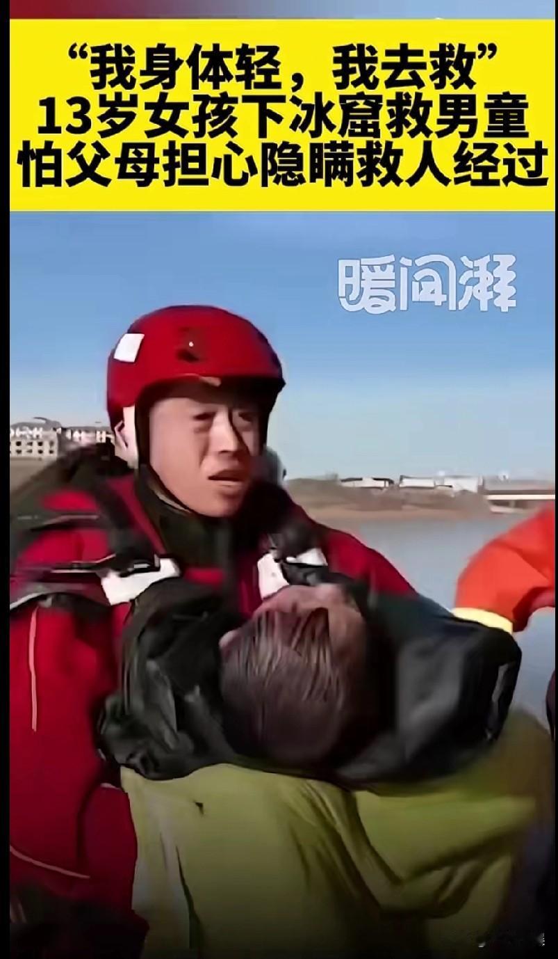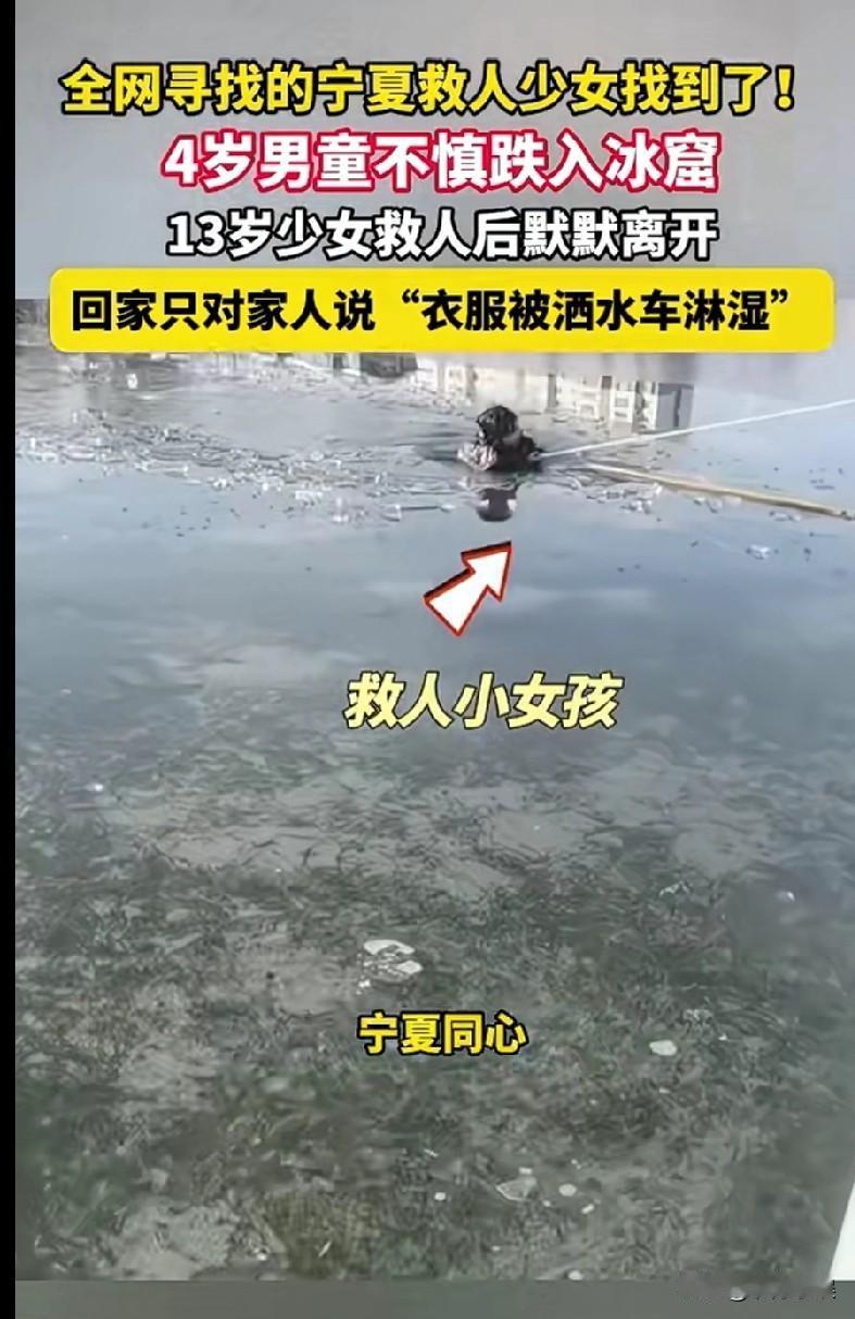 这才是祖国的花朵!宁夏一4岁男孩不慎掉入了冰窟,路过的13岁女孩看到了,马上挺身而出去营救小男孩,导致自己也进入了冰冷的河水中,当时小女孩感觉自己浑身都是麻的,但是她并没有群畏惧,在小男孩被消防员救起抱走后,小女孩担心打扰到消防员,自己就悄悄的走了。 回到家后,女孩为了不让父母担心,谎称自己不小心被洒水车淋到水了,她对自己救人的事情只字未提。 等到半夜时,班主任在网上看到了寻找救人的小女孩时,看到这个女孩不正是自己的学生吗,老师在半夜随即给小女孩父母打去了电话,这时女孩瞒不住了,才把此事一五一十地告诉父母。 这位小女孩刚刚13岁啊,刚上初一,她还是位孩子啊,竟然可以舍身去救另一位孩子,真的让人敬佩! 女孩不止人美心善,这只是表象,实际性格坚韧不拔,内心强大,有责任有担当,女中豪杰,人中龙凤! 但是不鼓励未成年人救人,除非确定对自己没有任何危险!!![碰拳][碰拳][碰拳]
