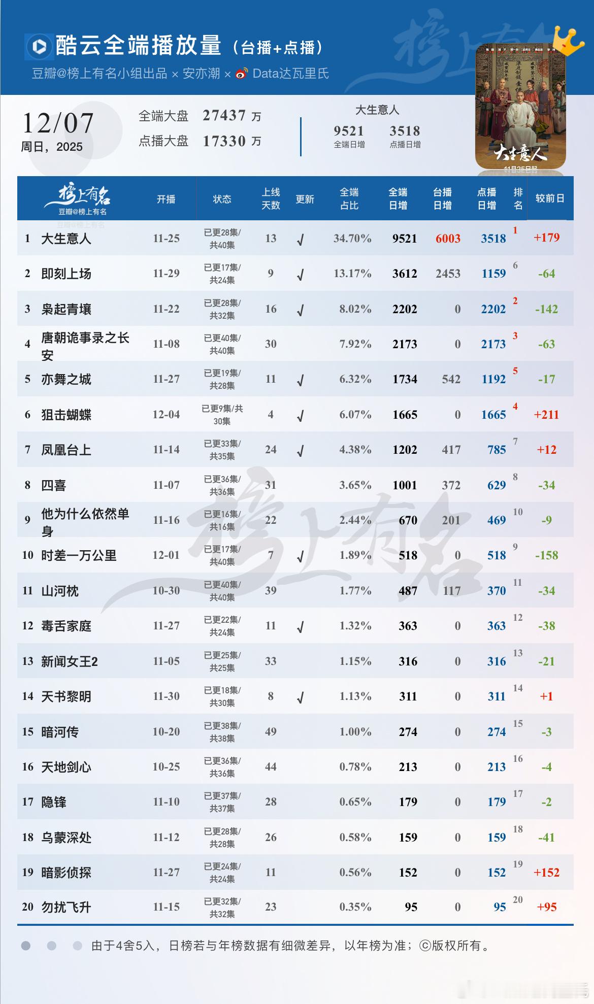 12.7酷云播放量🌴豆瓣榜上有名小组1 大生意人 全端日冠×9, 9521 点播3518新高 +1792 即刻上场 3612 1159 -643 枭起青壤 2202 -142,集均1441万4 唐朝诡事录之长安 2173 -63 全端集均3457万,点播集均约3284万5 亦舞之城 1734 1192 -176 狙击蝴蝶 1665 +2117 凤凰台上 1202 785 +128 四喜 1001 629 -349 他为什么依然单身 670 469 -910 时差一万公里 518 -15811 山河枕 12 毒舌家庭 13 新闻女王2 14 天书黎明 15 暗河传 集均1757万 16 天地剑心 集均1595万 17 隐锋 18 乌蒙深处 19 暗影侦探 20 勿扰飞升 大生意人数据大生意人数据