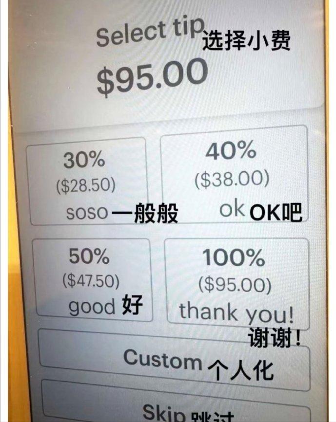 美国小费文化是真可笑! 美国的小费已经让美国人自己深恶痛绝。这其实就是将矛盾转移到服务人员和消费者之间。毕竟应该商家支付服务员的收入,而现在却成了消费者来提供。这极大的提升了消费者的负担。 而且商家将本来应该给予的工资缩减,反而靠小费来弥补,这就是美国当前服务行业现状。这也根本不是一些人吹嘘的有礼貌和所谓的文明。 对此,你怎么看?