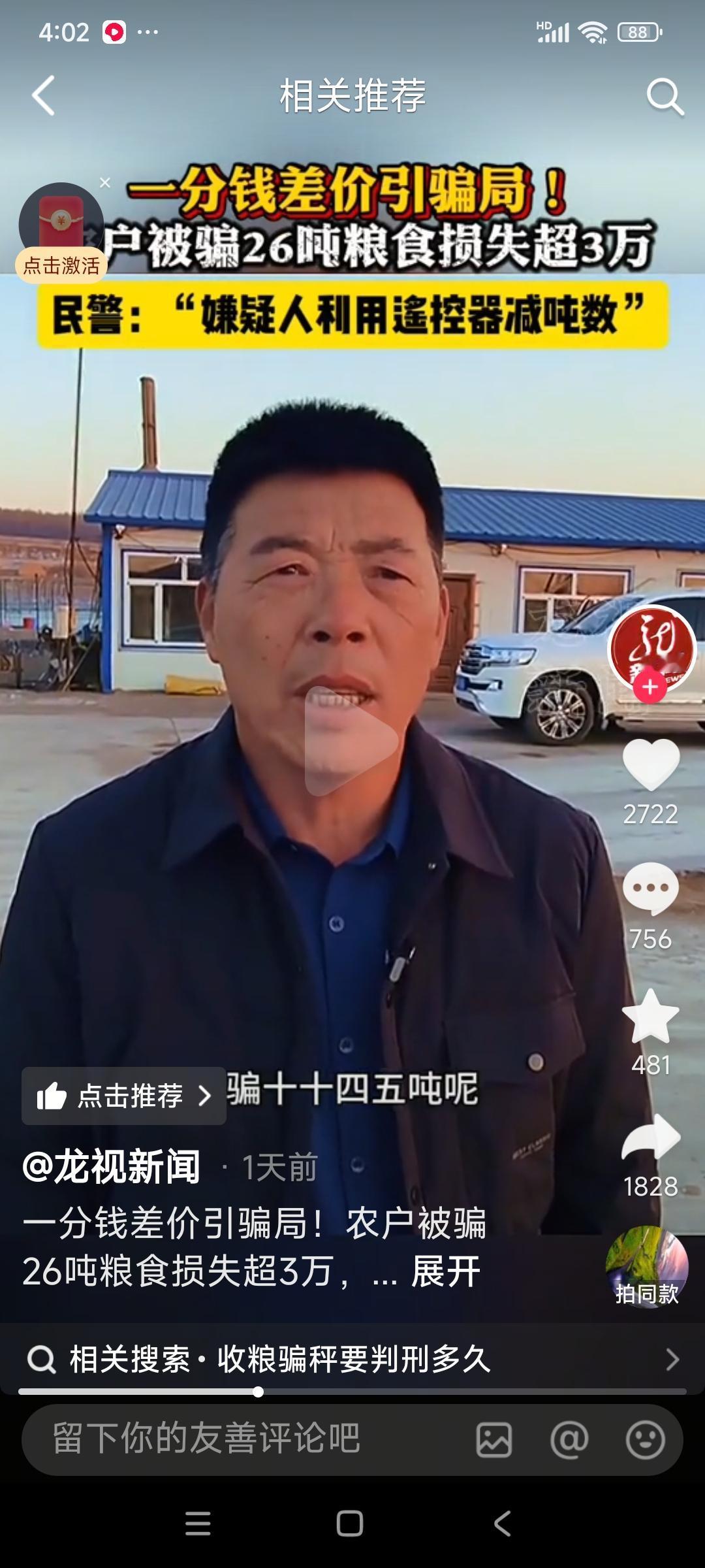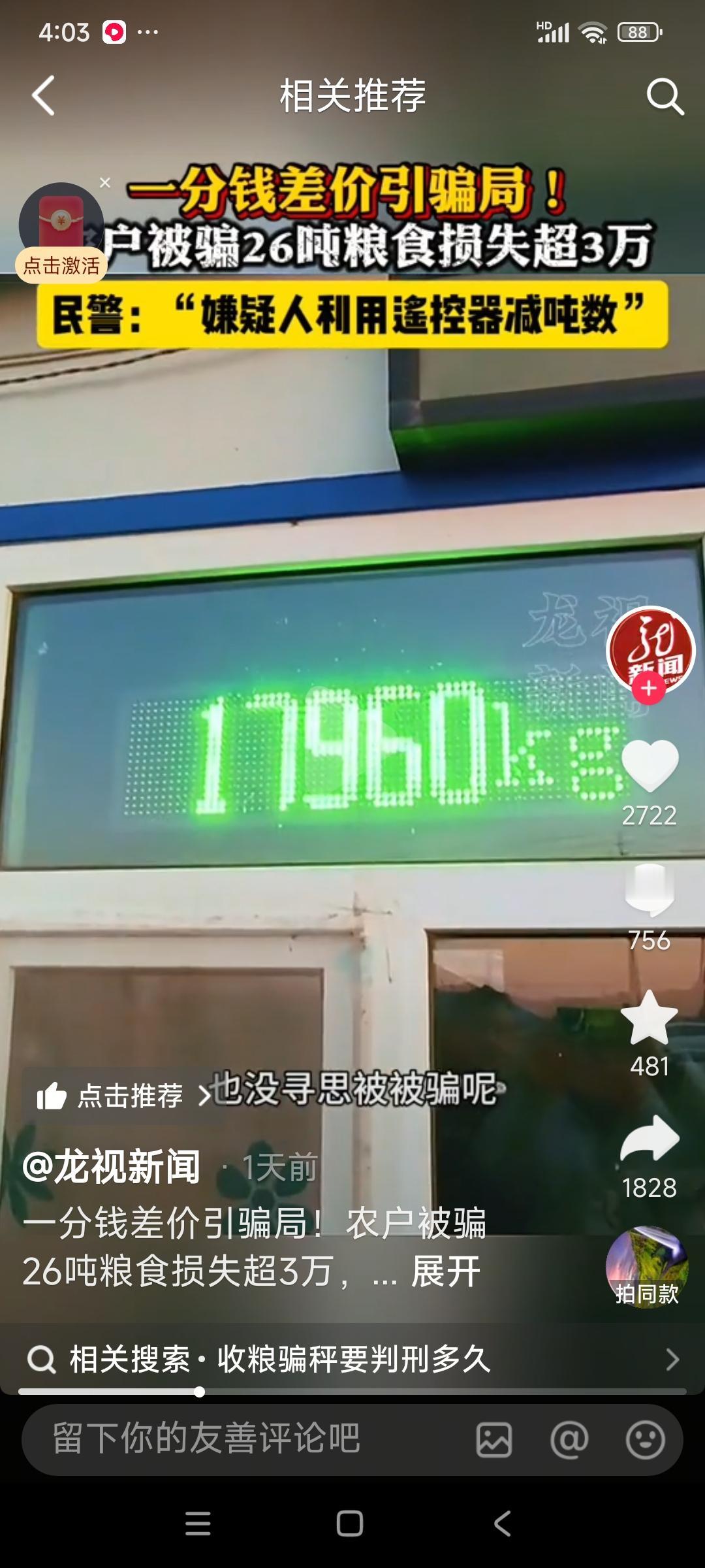 高科技的东西被骗子们用的无所不用其极! 黑龙江七台河市粮食贩子白某, 用一分钱差价引骗农户, 过秤的时候, 白某利用遥控器减吨数, 按一减一吨, 按二减两吨, 农户们被骗26吨粮食, 最多的一家差了8吨多, 多亏农户里有人产生怀疑, 报警才揪出证据! 看来现在凡事和钱有关系的, 自己都得当心, 当心上当![黑线]