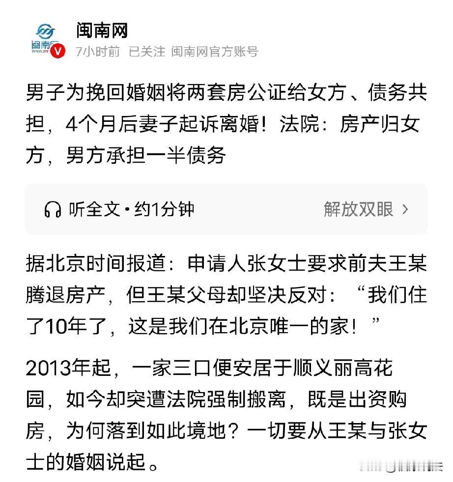 “痴情还是太傻?”北京,男子为了不和妻子离婚,瞒着家人配合妻子公证,约定2套房子都归妻子一人所有,债务二人共同承担,不料,4个月后,妻子起诉离婚,法院判决:2套房子归女方,男子承担约400万债务。之后,妻子要求男子一家从房子里搬出去,公婆强烈反对:我们住了10年啊,当初买房出了80万,家没了,让我往哪搬? 王先生怎么也没想到,不想和妻子离婚委曲求全,最终换来了离婚、2套房子也没了,还背了一身债…… 2013年,王先生和父母一起东拼西凑,付了首付并贷款买下了位于顺义某小区的一套房子,从此,在这个城市有了属于自己的小窝,他和父母住在这套房子里。 2016年,王先生和张女士携手步入婚姻殿堂,婚后,两人一起住进了顺义某小区这套房子里。 因为和公婆同住在一个屋檐下,生活的琐碎,日常的鸡毛蒜皮时有发生,张女士和公婆的矛盾逐渐升级,夫妻俩也开始争吵。 年轻人和老人之间相处不来,这么下去也不是个办法,妻子张女士和王先生一商量决定再去朝阳区买一套房子。 可是,理想很丰满,现实是残酷的,他们的钱并不多,根本不可能一下买套房,无奈之下,他们只好向第三方贷款,而贷款的年利率高达24%,这无疑给这个本就不富裕的家庭又增添了一份沉重的负担。 要不说,人不管做什么事情都要量力而行,千万不要超负荷,不然最后会因为压力太大承受不了,生活也会变得一片狼藉。 王先生和妻子就是这样,自从买了第二套房子,每个月高额的贷款成了压在夫妻俩的身上的一座大山。 为了按时还款,他们不得不节衣缩食,生活变得捉襟见肘,每天一睁开眼就得想着还钱的事儿,生活变得一团糟。 都说贫贱夫妻百事哀,王先生夫妻也不例外,因为压力太大,二人的感情也变得岌岌可危。 时间一长,王先生和张女士的矛盾越来越多,曾经的海誓山盟在现实面前变得不堪一击,二人的婚姻出现了裂痕。 张女士对二人的婚姻没了信心,经常把离婚挂在嘴边,还提出一个要求,如果不做婚内财产公证就必须离婚。 王先生根本不想和妻子分开,虽然生活暂时有点困难,他还是想和妻子一起携手度过一生。 然而,妻子态度坚决,王先生为了不和妻子离婚,就瞒着父母和妻子张女士去做了财产公证。 二人约定:2套房归张女士个人所有,债务由夫妻二人共同承担。 王先生以为答应了妻子,做完了公证,妻子会和自己好好过日子,然而,现实却啪啪打脸。 仅仅过了4个月后,妻子张女士直接起诉离婚。 这下王先生傻了眼,他没想到自己的妥协换来的依然是妻子的冷漠无情。 法院认定,王某与张女士的公证协议符合法定形式,法院认定其合法有效,两套房产归女方所有符合法律规定。 《民法典》第1065条规定:男女双方可以约定婚姻关系存续期间所得的财产以及婚前财产归各自所有、共同所有或者部分各自所有、部分共同所有。 本案中,王某为挽回婚姻自愿公证,无证据显示他是受欺诈或胁迫,法院未支持其撤销主张合理。 所以,法院判决:2套房都归张女士所有。 不过,当初买房子的欠款已经由张女士还清,但这些欠款属于夫妻共同债务。 《民法典》第1064条规定:夫妻双方共同签名或者夫妻一方事后追认等共同意思表示所负的债务,以及夫妻一方在婚姻关系存续期间以个人名义为家庭日常生活需要所负的债务,属于夫妻共同债务。 因此,王先生仍然要承担债务的一半,大约有400万元。 本案中,朝阳区房产贷款用于夫妻共同居住,虽以一方名义借款,但仍属共同债务。 公证协议明确“债务由夫妻共担”,法院据此判决男方承担一半符合约定。 所以,法院判决,王先生要承担夫妻共同债务的一半,也就是约400万元。 然而事情并没有结束,张女士和王先生离婚后,她申请要求王先生一家从顺义某小区的房子搬出去。 但是,王先生的父母强烈反对。 王先生的父亲愤愤地说:“我们在这住了10年了,我们家没有了!” 王先生的母亲哭着说:“你叫我们往哪搬啊?” 王先生的父亲感叹但,当初买房时,我们出资将近80万,我们现在是倾家荡产了。 如果,王先生一家拒绝搬离,可能面临什么后果? 房屋所有权人(张女士)对房屋享有占有、使用、收益和处分的权利。 王先生一家若拒绝搬离,构成无权占有,侵犯张女士的物权。 另外,王先生一家未与张女士签订居住权合同,也未办理登记,且房屋已通过公证归张女士所有,因此不享有居住权。 类似案件中,法院通常判决占房者限期搬离,并承担诉讼费、鉴定费等费用。 若占房者拒不履行,法院可强制执行,并对其处以罚款。 有人说,可怜可悲,更可恨!自己的委屈求存是换不来真心相待的,自己名下的资产,不到大限将至那天,坚决不过户,因为这个道德绑架你是否真心的话,那就完全有理由质疑她的真心! 要知道当你一无所有时,只会让对方加快步伐离开你。 切记,成年人做事要考虑后果,别感情用事! 关注@福康说法