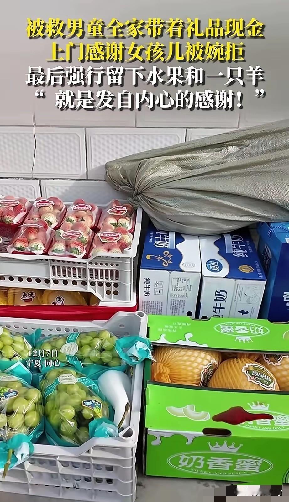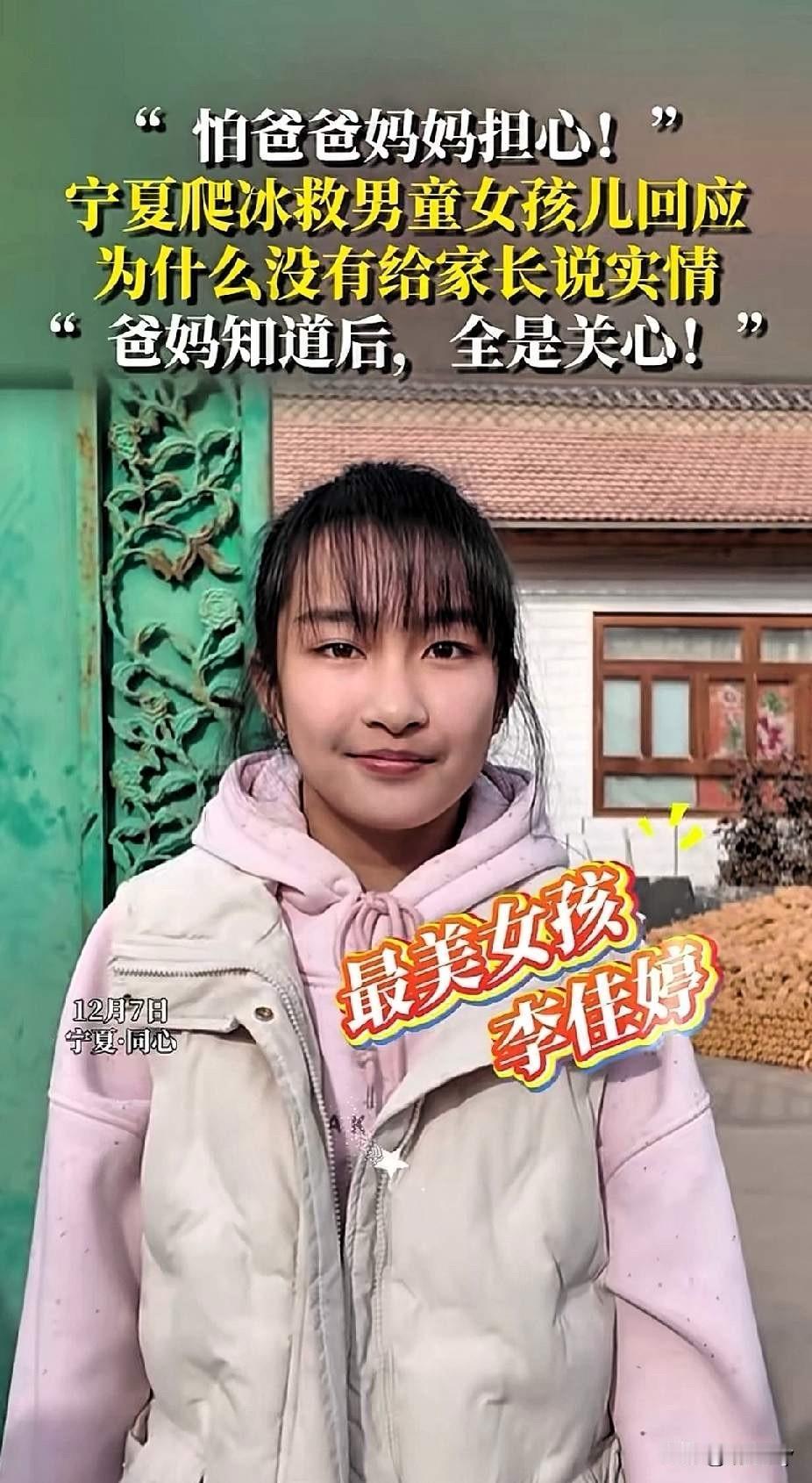 宁夏同心县13岁的初一女孩李佳婷,放学路过一处冰面时,看见一名4岁的男童掉进了冰窟,很多大人围在那儿束手无策! 李佳婷赶紧走过去说:我身体轻,我来救!说着就趴在冰面上给男童递出了一根管子,说是自己身体轻,但是也不慎滑落到了水里,但佳婷的手里仍然紧紧地拽着那根管子! 直到消防人员赶到现场,把男童救了起来,浑身湿透的佳婷骑着车悄悄地离开了!回到家后却跟父母撒谎说,身上的水是洒水车意外喷到的! 家里人刷到视频才知道佳婷浑身湿透并不是洒水车弄的!妈妈非常心疼她,也是担心因为佳婷也不会游泳! 转天,男童的家人就来登门道谢了,给小佳婷带来了酬金,很多水果和一只羊!佳婷父母拒收!但是拗不过男童的家长只能收下了水果和羊! 只有13岁的佳婷,在危难时刻毫不犹豫地挺身而出!她甚至于忘记了自己也不会游泳!小小的身躯却有着大大的爱!点赞少年英雄李佳婷!