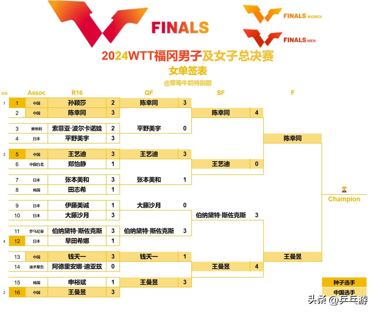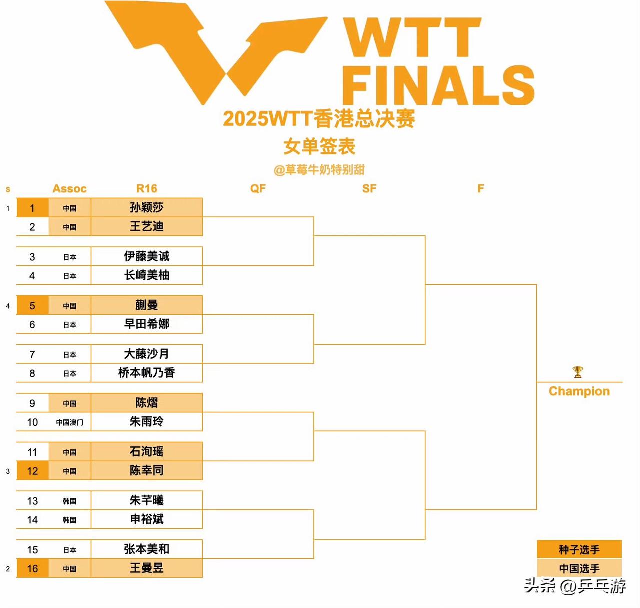 🏓WTT总决赛•以下2张图片是去年福冈总决赛和今年香港总决赛 女单 的签位表,你发现了哪些异同? ~~~~~~~~~~ 1.[微风]去年有欧美球员,今年被亚洲垄断。 2.[微风]去年孙颖莎首轮遇上世五陈幸同,今年孙颖莎首轮遇上世五王艺迪。 3.[微风]去年蒯曼、陈熠、石洵瑶、桥本帆乃香、朱芊曦、长崎美柚等人,均未获得参赛资格,今年排名提升很快。 4.[微风]去年只有2场“队内战”,今年居然有5场。 ~~~~~~~~~~~~ 🏓去年的决赛在王曼昱和陈幸同之间进行,您觉得,今年谁会闯入决赛? ~~~~~~~~~~~~