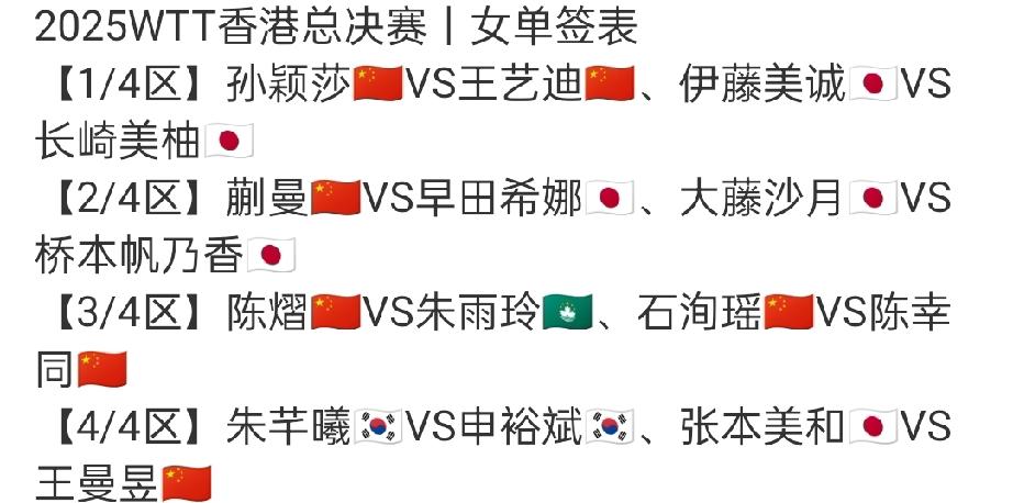 随着WTT香港总决赛女单抽签出炉,这3人心里“暗暗叫苦” 1、王艺迪 大迪首轮就要与孙颖莎进行国乒内战,大迪心里苦呀,看来要做好“一轮游”准备了! 2、张本美和 张本美和首轮又要面对王曼昱,两人刚刚在混团世界杯交完手,而且张本美和对阵王曼昱历史战绩全败。美和心里苦呀,“一轮游”是大概率事件! 3、申裕斌 一共就有2名韩国运动员进入总决赛,结果首轮就要与朱芊曦进行内战,申裕斌心里苦呀,因为无论谁赢,都会成为韩国独苗!
