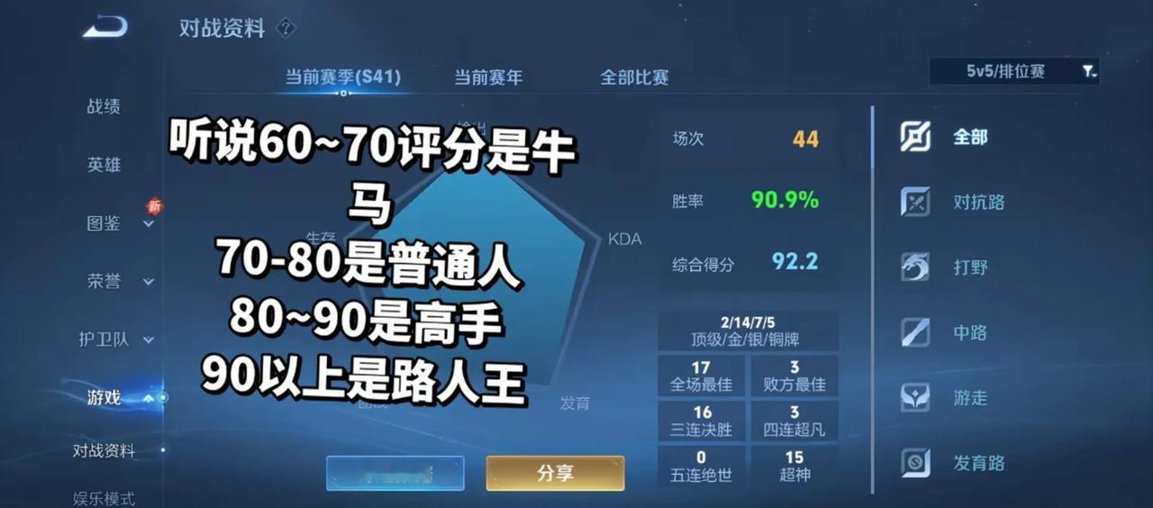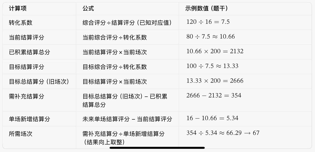 王者英雄评分计算规则讲解。 假设英雄评分综合评分80,英雄场次200,每场都保持16.0结算评分。 计划目标综合评分80打到100,最后需要打多少场16.0结算评分的场次? 综合评分80÷转化评分7.5=结算评分10.66=综合评分80。 结算评分10.66×当前场次200=全部结算评分2132。 目标综合评分100÷转化评分7.5=目标结算评分13.33=综合评分100。 目标结算评分13.33×当前场次200=全部结算评分2666。 全部结算评分2666−全部结算评分2132=需要全部结算评分354。 未来结算评分16.0−当前结算评分10.66=增加结算评分5.34需要全部结算评分354÷增加结算评分=需要场次66.29。