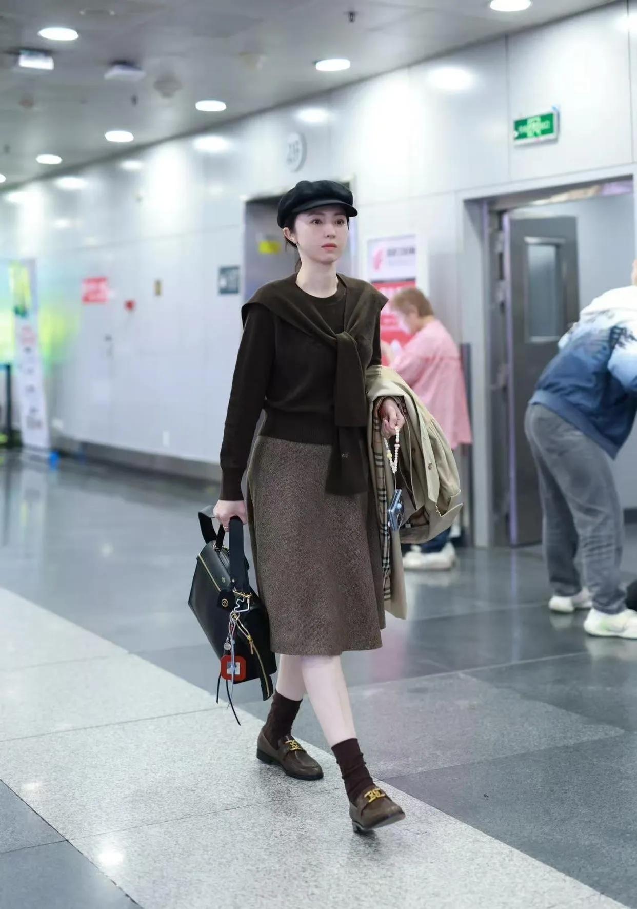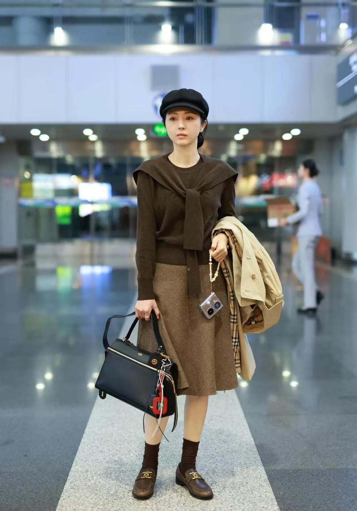 董璇这“棕系叠穿”,把中年穿搭的高级感焊死了 谁看了不说董璇是中年穿搭模板!深棕针织衫+同色系半裙,叠个披肩增加层次,贝雷帽+乐福鞋一搭,温柔又显贵。 40+这么穿,舒服又有品,松弛感直接赢麻了。