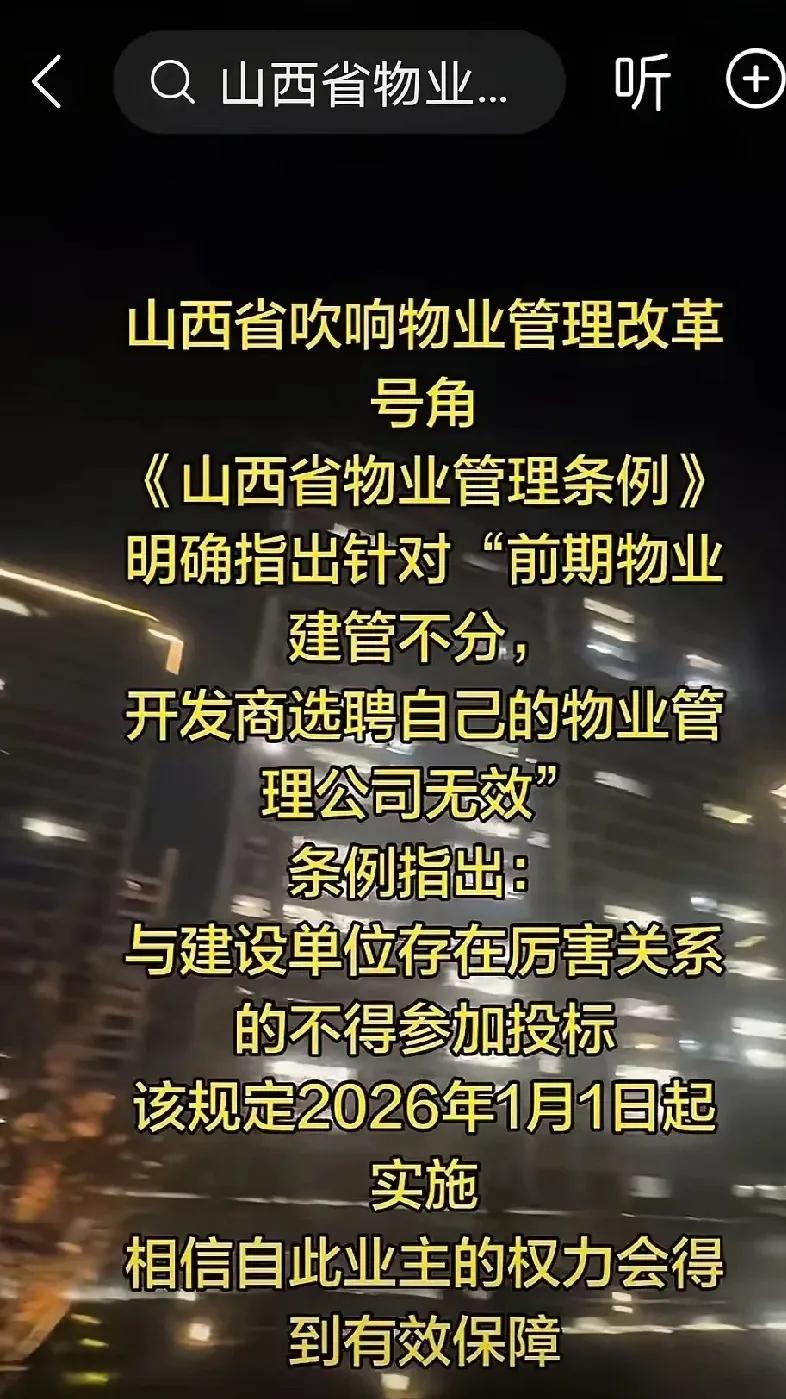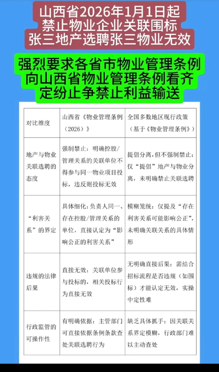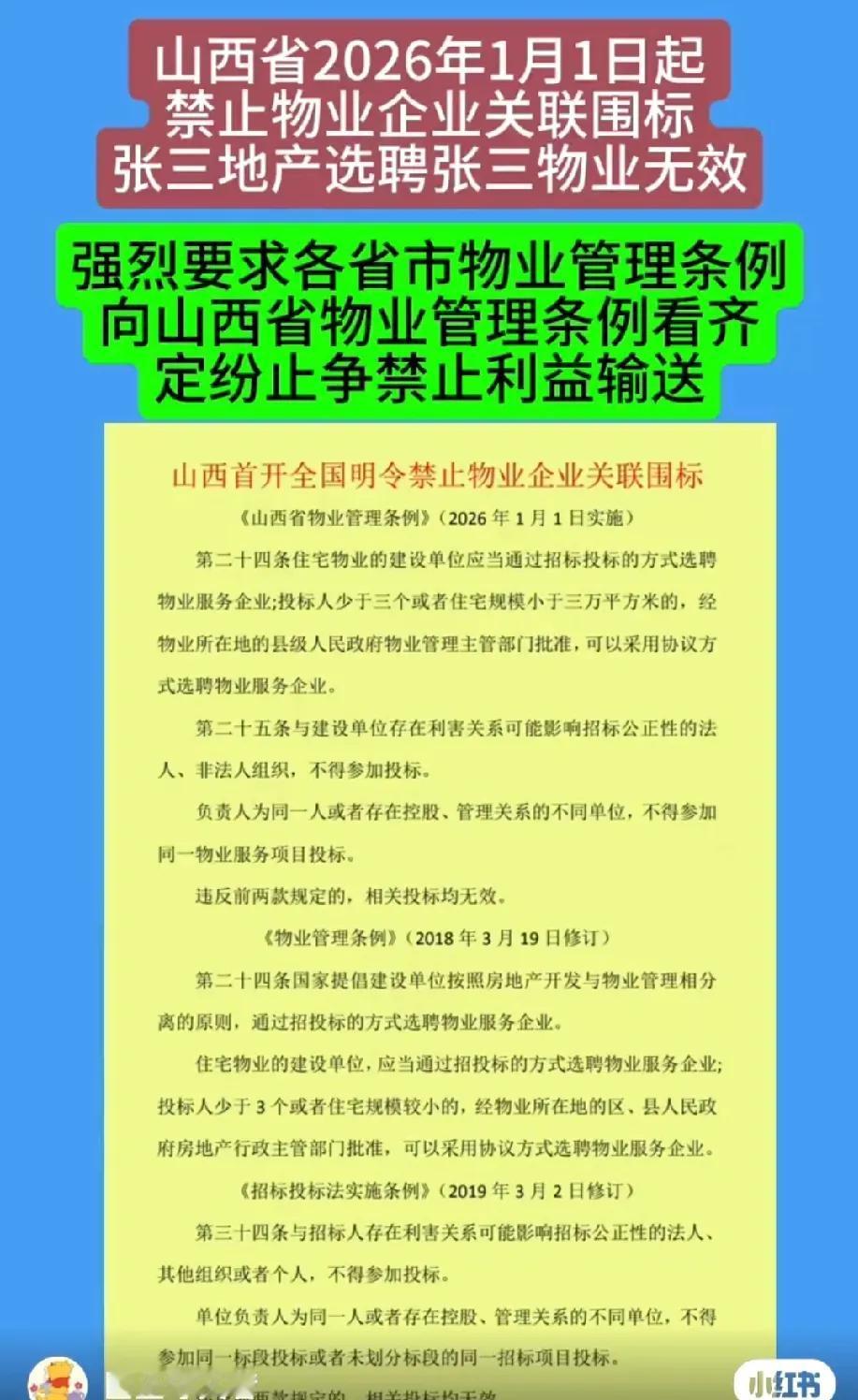 物业真的要变天了! 山西刚官宣的新规直接戳中痛点,2026年1月1日起正式执行,开发商自己找的物业、有利益关联的物业全都不算数,投标直接无效,这波操作简直大快人心! 以前开发商和物业左手倒右手,前期物业成了自留地,服务差还维权难,业主交着钱却受着气的日子终于要到头了。山西这波立法堪称教科书级别的破局,不是表面整改,而是从根源上切断利益输送,让物业回归服务本质,真正站到业主这边。 这不仅是给全国物业行业立规矩,更给其他省份打了个好样,物业再也不能靠关系躺赚,必须凭实力说话。那些物业和业委会勾结、私吞公共收益的乱象,早该这样重拳整治了,这才是真正顺民意的好政策。 期待全国都能跟进这套硬核操作,让小区治理真正归业主说了算!你们小区有没有遇到过物业乱象?觉得山西这波新规能彻底解决物业顽疾吗?