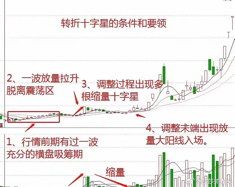 今天莎莎教大家看懂洗盘十字星,精准抓短线主升浪在A股里,不少强势股连续涨停后会出现关键十字星,这往往是市场即将变盘的信号,只要十字星位置合适且配合特定盘口信号,就能找准时机入场,坐等新一轮拉升。要是你曾因暴涨股中途洗盘被甩下车,或是不知道怎么判断洗盘结束时点,这套方法能帮你提升短线抓牛股的能力。股价能走出强劲主升浪,核心是主力已经收集够筹码。但拉升到关键压力位或密集成交区时,大量跟风盘会抬高主力拉升成本,所以主力常会进行强势洗盘。这时K线图上出现的特定十字星,就是洗盘接近尾声、多空暂时平衡的信号,一旦平衡被打破,主升行情就会重启。洗盘十字星的识别要点(四个条件缺一不可)1. 先有突破性上涨股价得先有一波以涨停或大阳线为标志的拉升,要有效脱离底部盘整区或重要压力位,而且这波上涨得伴随成交量明显放大,这是主力启动行情的信号,也为后续洗盘提供了空间参考。2. 特定位置现分歧十字星突破性上涨后股价短暂休整,此时会出现实体极小、上下影线明显的十字星(含T字、倒T字)。关键是十字星要出现在前期涨停收盘价上方或附近,说明股价不愿深跌,强势还在;要是连续出现这类十字星,就意味着多空分歧加大,很快会重新选择方向。3. 调整时必须缩量收十字星的调整阶段,成交量要有序萎缩,这是区分洗盘和出货的关键。缩量说明抛压快速减少,不坚定的跟风筹码已被清理,市场浮筹变少,主力后续拉升的阻碍也就小了。4. 次日见起爆转强K线十字星只是预警,真正的进场信号在之后1-2个交易日:要出现一根强势阳线,收盘价最好能超过十字星最高点,同时成交量温和放大,这说明新的买盘进场,多空平衡被打破,主升浪二次上涨的起点就确认了。这套洗盘十字星战法的逻辑和框架要在实战中反复验证,而且任何技术形态都得结合市场整体热度和板块轮动来综合判断。 大家点赞评论就是给莎莎最大的支持