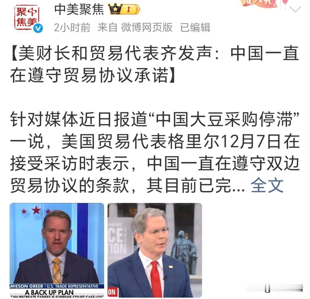 你们变得这么乖!这么诚实!真的让人很欣慰![偷笑] 美国贸易代表格里尔12月7日在接受采访时表示,中国一直在遵守双边贸易协议的条款,其目前已完成本种植季大豆采购承诺的大约三分之一,美国始终坚持核实、监督和关注中国的履约情况。 美国财长贝森特同日也在接受采访时称,中国不会加快大豆采购速度,但预计本季度仍会按计划采购。 小民闲话:诚信为本,互利互惠,希望美国也能遵守贸易协议承诺! (图片来自网络截图)