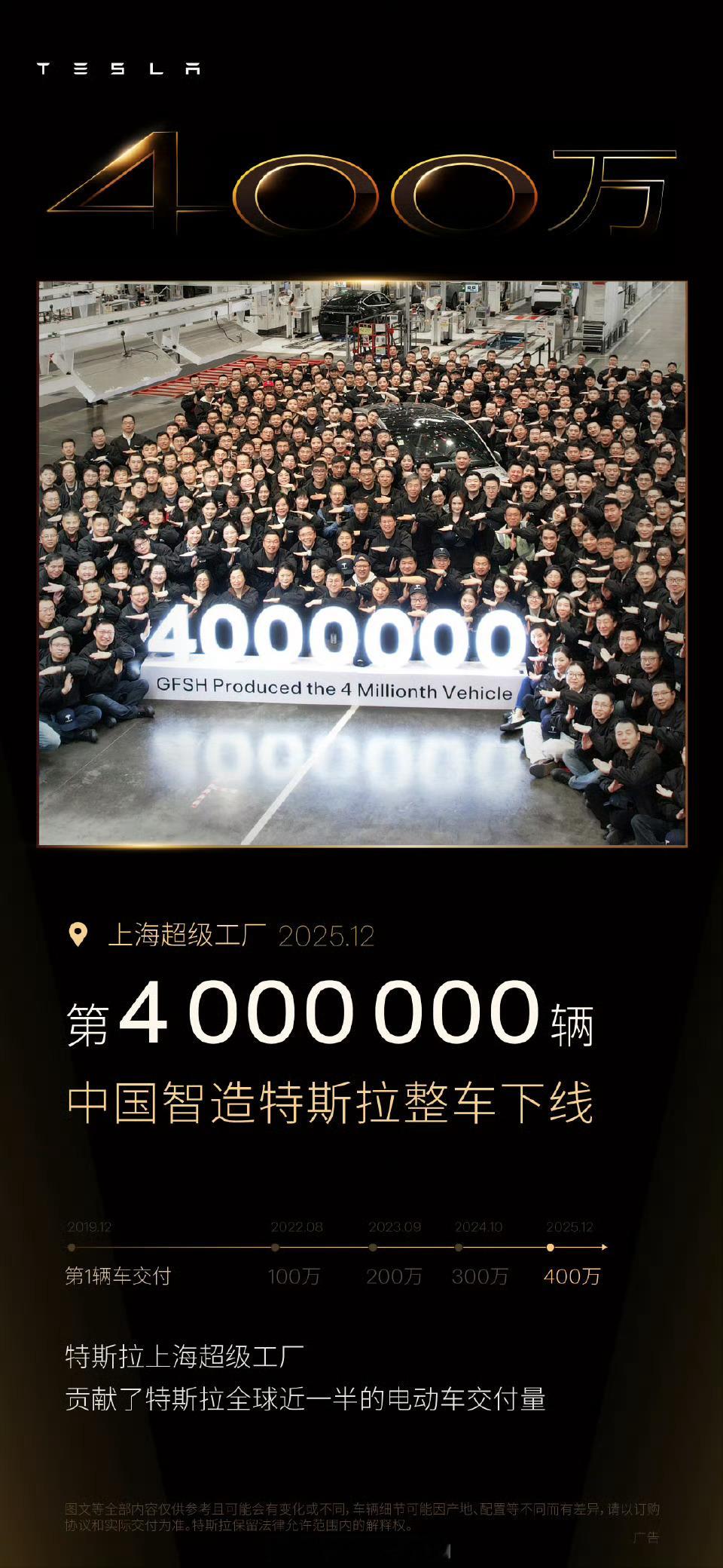 12月8日,一辆星光金Model Y L驶下产线,这是特斯拉上海超级工厂第400万辆整车下线这个工厂对特斯拉有多重要?看交付量就明白,上海超级工厂已贡献了特斯拉全球近一半的电动车交付量。中国乘用车联合会公布的最新数据显示,11月特斯拉上海超级工厂共交付Model 3和Model Y 86700辆,同比增长10%,较10月环比增长40%。上海超级工厂也是特斯拉全球出口中心,2025年10月,特斯拉上海超级工厂出口超3.5万辆,创2年来单月最高出口纪录,第四季度特斯拉电动车全球交付量持续增长。作为全球最高效的整车厂,特斯拉上海超级工厂已实现30多秒下线一台车,但这个速度也赶不上卖的速度,特斯拉中国官网显示,Model Y 2025年内已无可交付车辆,Model 3余少量现车。又能这么快造车,又能这么快卖车,说中国市场救了特斯拉完全不为过。汽场全开特斯拉