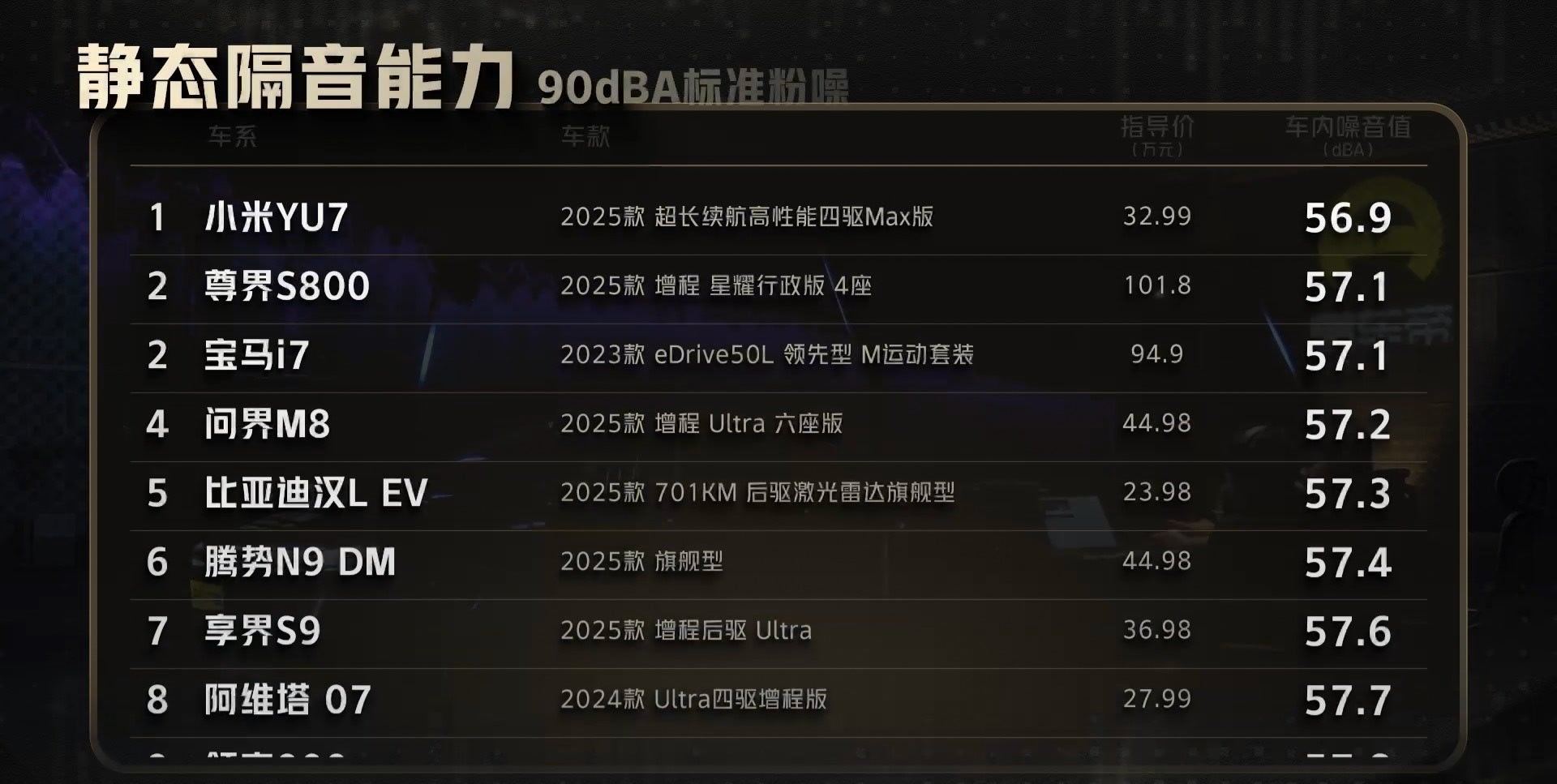 好家伙,懂车帝做的测评,静态隔音能力这部分,小米YU7排名第一!
